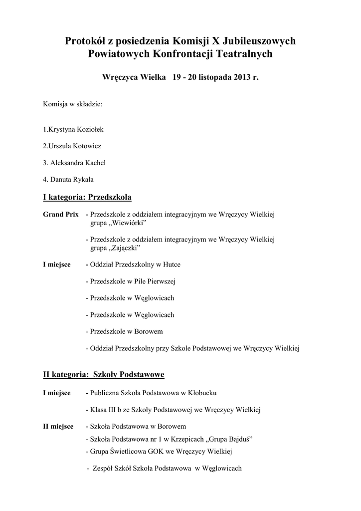 Protokół z posiedzenia Komisji X Jubileuszowych Powiatowych Konfrontacji Teatralnych Wręczyca Wielka 19 - 20 listopada 2013 r. Komisja w składzie: 1.Krystyna Koziołek 2.Urszula Kotowicz 3. Aleksandra Kachel 4. Danuta Rykała I kategoria: Przedszkola Grand Prix - Przedszkole z oddziałem integracyjnym we Wręczycy Wielkiej grupa „Wiewiórki” - Przedszkole z oddziałem integracyjnym we Wręczycy Wielkiej grupa „Zajączki” I miejsce - Oddział Przedszkolny w Hutce - Przedszkole w Pile Pierwszej - Przedszkole w Węglowicach - Przedszkole w Węglowicach - Przedszkole w Borowem - Oddział Przedszkolny przy Szkole Podstawowej we Wręczycy Wielkiej II kategoria: Szkoły Podstawowe I miejsce - Publiczna Szkoła Podstawowa w Kłobucku - Klasa III b ze Szkoły Podstawowej we Wręczycy Wielkiej II miejsce - Szkoła Podstawowa w Borowem - Szkoła Podstawowa nr 1 w Krzepicach „Grupa Bajduś” - Grupa Świetlicowa GOK we Wręczycy Wielkiej - Zespół Szkół Szkoła Podstawowa w Węglowicach III miejsce - Szkoła Podstawowa w Lipiu - Szkoła Podstawowa w Węglowicach „Witaj zimo” Jury przyznaje wyróżnienia indywidualne za role: - za rolę głównego bohatera SPSK Kłobuck - za rolę Fryderyka SP w Lipiu - za rolę nauczyciela SP w Lipiu III kategoria: Gimnazja I miejsce - Publiczne Gimnazjum SPSK w Lgocie II miejsce - Gimnazjum we Wręczycy Wielkiej - Gimnazjum w Ostrowach nad Okszą III miejsce - Gimnazjum w Truskolasach - Gimnazjum w Parzymiechach Jury przyznaje wyróżnienia indywidualne za role: - dziewcząt odtwarzających główne role z Gimnazjum w Ostrowach nad Okszą - Michała Janika z Gimnazjum w Truskolasach za kreację roli syna IV kategoria: Grupy mieszane I miejsce - SP z Kulej - Gminny Ośrodek Kultury w Krzepicach II miejsca komisja nie przyznała III miejsce - Zespół Szkolno-Przedszkolny w Parzymiechach Jury przyznaje wyróżnienia indywidualne za role: - za role Kopciuszka ze Szkoły Podstawowej i Gimnazjum z Węglowic - za role Matki ze Szkoły Podstawowej i Gimnazjum z Węglowic Na tym protokół zakończono. Podpisy Komisji: