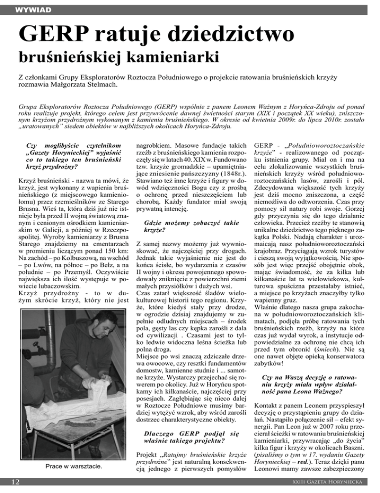 WYWIAD GERP ratuje dziedzictwo bruśnieńskiej kamieniarki Z członkami Grupy Eksploratorów Roztocza Południowego o projekcie ratowania bruśnieńskich krzyży rozmawia Małgorzata Stelmach. Grupa Eksploratorów Roztocza Południowego (GERP) wspólnie z panem Leonem Ważnym z Horyńca-Zdroju od ponad roku realizuje projekt, którego celem jest przywrócenie dawnej świetności starym (XIX i początek XX wieku), zniszczonym krzyżom przydrożnym wykonanym z kamienia bruśnieńskiego. W okresie od kwietnia 2009r. do lipca 2010r. zostało „uratowanych” siedem obiektów w najbliższych okolicach Horyńca-Zdroju. Czy moglibyście czytelnikom „Gazety Horynieckiej” wyjaśnić co to takiego ten bruśnieński krzyż przydrożny? Krzyż bruśnieński - nazwa ta mówi, że krzyż, jest wykonany z wapienia bruśnieńskiego (z miejscowego kamieniołomu) przez rzemieślników ze Starego Brusna. Wieś ta, która dziś już nie istnieje była przed II wojną światową znanym i cenionym ośrodkiem kamieniarskim w Galicji, a później w Rzeczpospolitej. Wyroby kamieniarzy z Brusna Starego znajdziemy na cmentarzach w promieniu liczącym ponad 150 km: Na zachód – po Kolbuszową, na wschód – po Lwów, na północ – po Bełz, a na południe – po Przemyśl. Oczywiście największa ich ilość występuje w powiecie lubaczowskim. Krzyż przydrożny - to w dużym skrócie krzyż, który nie jest nagrobkiem. Masowe fundacje takich rzeźb z bruśnieńskiego kamienia rozpoczęły się w latach 40. XIX w. Fundowano tzw. krzyże gromadzkie – upamiętniające zniesienie pańszczyzny (1848r.). Stawiano też inne krzyże i figury w dowód wdzięczności Bogu czy z prośbą o ochronę przed nieszczęściem lub chorobą. Każdy fundator miał swoją prywatną intencję. Gdzie możemy zobaczyć takie krzyże? Z samej nazwy możemy już wywnioskować, że najczęściej przy drogach. Jednak takie wyjaśnienie nie jest do końca ścisłe, bo wydarzenia z czasów II wojny i okresu powojennego spowodowały zniknięcie z powierzchni ziemi małych przysiółków i dużych wsi. Czas zatarł większość śladów wielokulturowej historii tego regionu. Krzyże, które kiedyś stały przy drodze, w ogrodzie dzisiaj znajdujemy w zupełnie odludnych miejscach – środek pola, gęsty las czy kępka zarośli z dala od cywilizacji . Czasami jest to tylko ledwie widoczna leśna ścieżka lub polna droga. Miejsce po wsi znaczą zdziczałe drzewa owocowe, czy resztki fundamentów domostw, kamienne studnie i ... samotne krzyże. Wystarczy przejechać się rowerem po okolicy. Już w Horyńcu spotkamy ich kilkanaście, najczęściej przy posesjach. Zagłębiając się nieco dalej w Roztocze Południowe musimy bardziej wytężyć wzrok, aby wśród zarośli dostrzec charakterystyczne obiekty. Dlaczego GERP podjął się właśnie takiego projektu? Prace w warsztacie. 12 Projekt „Ratujmy bruśnieńskie krzyże przydrożne” jest naturalną konsekwencją jednego z pierwszych pomysłów GERP - „Południoworoztoczańskie krzyże” - realizowanego od początku istnienia grupy. Miał on i ma na celu zlokalizowanie wszystkich bruśnieńskich krzyży wśród południoworoztoczańskich lasów, zarośli i pól. Zdecydowana większość tych krzyży jest dziś mocno zniszczona, a część niemożliwa do odtworzenia. Czas przy pomocy sił natury robi swoje. Gorzej gdy przyczynia się do tego działanie człowieka. Przecież rzeźby te stanowią unikalne dziedzictwo tego pięknego zakątka Polski. Nadają charakter i urozmaicają nasz południoworoztoczański krajobraz. Przyciągają wzrok turystów i cieszą swoją wyjątkowością. Nie sposób jest więc przejść obojętnie obok, mając świadomość, że za kilka lub kilkanaście lat ta wielowiekowa, kulturowa spuścizna przestałaby istnieć, a miejsce po krzyżach znaczyłby tylko wapienny gruz. Właśnie dlatego nasza grupa zakochana w południoworoztoczańskich klimatach, podjęła próbę ratowania tych bruśnieńskich rzeźb, krzyży na które czas już wydał wyrok, a instytucje odpowiedzialne za ochronę nie chcą ich przed tym obronić (śmiech). Nie są one nawet objęte opieką konserwatora zabytków! Czy na Waszą decyzję o ratowaniu krzyży miała wpływ działalność pana Leona Ważnego? Kontakt z panem Leonem przyspieszył decyzję o przystąpieniu grupy do działań. Nastąpiło połączenie sił – efekt synergii. Pan Leon już w 2007 roku przecierał ścieżki w ratowaniu bruśnieńskiej kamieniarki, przywracając „do życia” kilka figur i krzyży w okolicach Baszni. (pisaliśmy o tym w 17. wydaniu Gazety Horynieckiej – red.). Teraz dzięki panu Leonowi mamy zawsze zabezpieczony xxiIi Gazeta Horyniecka WYWIAD zestaw narzędzi do pracy. Mobilizuje nas do działania, wspiera doświadczeniem, pracowitością i niepowtarzalnym poczuciem humoru. W jaki sposób wybieracie krzyż do odnowy? Czym się kierujecie? Przede wszystkim jego stanem. Krzyże, które wymagają jedynie czynności „kosmetycznych” typu czyszczenie, zabezpieczenie przed porostami i wilgocią na razie ustawiamy na koniec kolejki. Najpierw wybieramy te, o których świat już dawno zapomniał, które często leżały latami na ziemi lub w ziemi w zupełnej rozsypce. Czasem wydaje się, że krzyż jest w dobrym stanie i nic nie trzeba robić, jednak po oględzinach czy nawet przy przypadkowym dotknięciu odpadają całe płaty wapienia. Wtedy zapisujemy go w „kolejce oczekujących” na czołowych miejscach. Jak wyglądają prace przy takich krzyżach? Na początku robimy dokładną dokumentację fotograficzną miejsca i obiektu, rozeznanie zniszczeń i obmyślamy plan ratunkowy. Najczęściej zabieramy cały krzyż lub jego fragmenty (może być ich nawet kilkadziesiąt) do warsztatu. Tam go suszymy, czyścimy, dopasowujemy i sklejamy poszczególne elementy. Kilka dni poźniej jedziemy w teren poprawić postument pod odnowiony obiekt. Tych wyjazdów może być kilka, ponieważ czasa