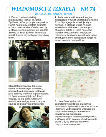 WIADOMOŚCI Z IZRAELA - NR 74 06.02.2016, szabat, Izrael 1. Zamach w beduińskiej miejscowości Rahat: 65-letnia Żydówka, która przybyła na rynek w Rahat na zakupy, została dźgnięta nożem przez Araba. Odwieziono ją w stanie średnio ciężkim do szpitala Soroka w Beer Szewie. Terrorysta uciekł. Liczne siły policji przeszukują teren. Stan Shlomit Gonen, 65-letniej rannej w dzisiejszym zamachu, poprawił się i określany jest teraz jako stabilny. Kobieta ta powiedziała, że życie uratował jej zięć, który widząc, co się stało, własnymi rękami tamował jej krew z rany w szyi aż do przybycia ambulansu. 2. Arabowie spalili święte księgi w synagodze w Givat Shorek koło Karmei Tzur. Synagoga ta znajduje się w punkcie, z którego widać miejsce znalezienia ciał trzech porwanych chłopców (2014 r.) i jest miejscem modlitw i codziennych wycieczek młodzieży. Arabowie zebrali wszystkie znajdujące się w synagodze księgi na jedno miejsce i podpalili je. 3. Unia Europejska ostro zaprotestowała dzisiaj przeciwko budowaniu żydowskich domów w Judei i Samarii. Jednocześnie wezwała do natychmiastowego zaprzestania likwidowania nielegalnie wybudowanych domów palestyńskich, z których wiele zostało ufundowanych przez UE, co złamało krajowe i międzynarodowe prawo. *Unia Europejska ingeruje w prawo i 4. Ćwiczenia ISIS na Synaju (Egipt). budownictwo na formalnych terenach państwa Izrael w Judei i Samarii. Jednocześnie zachęca do budowania nowych domów przez Palestyńczyków za fundusze UE i inne. Natomiast izraelskie sądy podejmują decyzje związane z nielegalnym budownictwem zarówno żydowskim jak i arabskim. Wyburzane są zarówno żydowskie jak i arabskie nielegalne budowle. Często są to bardzo trudne chwile dla obu stron. 5. Na przyszły tydzień zapowiadana jest zimowa pogoda. *Może to przynieść upragnione opady śniegu lub deszczu. Świat 6. Dzisiejsze trzęsienie ziemi w południowej części Tajwanu. Trzęsienie ziemi nastąpiło w sobotę około godziny 4:00 rano czasu lokalnego (21:00 czasu polskiego). Do tej pory pod gruzami domów znaleziono ciała 5 osób, w tym kilkudniowej dziewczynki oraz 40letniego mężczyzny. Służby cały czas przeszukują gruzy w poszukiwaniu ocalałych mieszkańców. Izraelskie służby ratownicze „IsraAid” dotarły tam jako pierwsze! Wiadomości oraz zdjęcia zebrał Jarosław Papiór Korekta oraz opracowanie graficzne Stowarzyszenie Służba Szalom w Oświęcimiu