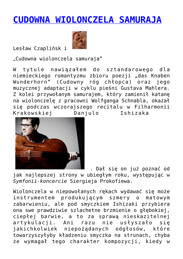 CUDOWNA WIOLONCZELA SAMURAJA Lesław Czaplińsk i „Cudowna wiolonczela samuraja” W tytule nawiązałem do sztandarowego dla niemieckiego romantyzmu zbioru poezji „das Knaben Wunderhorn” (Cudowny róg chłopca) oraz jego muzycznej adaptacji w cyklu pieśni Gustava Mahlera. Z kolei przywołanym samurajem, który zamienił katanę na wiolonczelę z pracowni Wolfganga Schnabla, okazał się podczas wczorajszego recitalu w Filharmonii Krakowskiej Danjulo Ishizaka . Dał się on już poznać od jak najlepszej strony w ubiegłym roku, występując w Symfonii-koncercie Siergieja Prokofiewa. Wiolonczela w niepowołanych rękach wydawać się może instrumentem produkującym szmery o matowym zabarwieniu, ale pod smyczkiem Ishizaki przybiera ona swe prawdziwie szlachetne brzmienie o głębokiej, ciepłej barwie, a to za sprawą nieskazitelnej artykulacji. Ani razu nie usłyszało się jakichkolwiek niepożądanych odgłosów, które towarzyszyłyby kładzeniu smyczka na strunach, chyba że wymagał tego charakter kompozycji, kiedy w Scherzu z Divertimenta Krzysztofa Pendereckiego należało stosować technikę gettata, czyli rzucania smyczkiem. Liryczna kantylena uwodziła już od pierwszych taktów Adagia i Allegra op. 70 Roberta Schumanna, choć był to zaledwie przedsmak tego, co miało nas czekać w dalszej części występu, choć w Beethovenowskiej Sonacie A-dur nr 3 op. 69 początkowo odnosiło się wrażenie, że wiolonczelista i towarzysząca mu chińska pianistka Shizhen Shen grają poniekąd obok siebie. Nić porozumienia pomiędzy nimi zaczęła się nawiązywać dopiero w Scherzu, czyli jej drugiej części, kiedy akompaniatorka, grając lekkim, acz wrażliwym dźwiękiem, z dużą subtelnością dopowiadała myśli intonowane przez solowy instrument . Japoński artysta różnicuje brzmienie w zależności od tego, czy gra dzieło klasycystyczne, jakim jest jeszcze ta sonata Beethovena, czy późnoromantyczne – transkrypcję na wiolonczelę Sonaty skrzypcowej A-dur Césara Francka. A także całkiem współczesne jak wspomniane Divertimento Krzysztofa Pendereckiego, choć nie już ono tak radykalne dźwiękowo w porównaniu z kompozycjami tego twórcy z okresu sonorystycznego. W Sarabandzie pojawiały się wszakże ekspresyjne flażolety, a w Serenadzie kilka razy rozlegał się przenikliwy dźwięk, uzyskiwany w wyniku gry na jednej strunie. Wykonanie II Suity d-moll BWV 1008 Johanna Sebastiano Bacha zachwycało od strony dźwiękowej, imponowało wirtuozerią w Sarabandzie i Gigue, ale w odróżnieniu od standardowych zestawień popularnych w tamtych czasach tańców, w przypadku lipskiego kantora otwierają one szerszą perspektywę na świat poza samą materią brzmieniową. Tego mi trochę brakowało, może poza pierwszym Menuetem, naznaczonym pewnym tchnieniem duchowości i czystego piękna, utajonych w doskonałości architektonicznej, ale być może wspomniane zastrzeżenia wynikały z nie najbardziej fortunnego zestawienia w programie, albowiem artysta mógł już być pochłonięty tym, z czym przyjdzie mu się zmierzyć niebawem, a mianowicie mającą stanowić uwieńczenie całego recitalu Sonatą Francka. W utworze tym partie grającego na instrumencie smyczkowym i fortepianu są właściwie równorzędne i wymagają zwłaszcza w Allegro i w finałowym Allegretto poco mosso niezwykłego zacięcia, graniczącego momentami z zapamiętaniem i operowaniem gwałtownymi kontrastami dynamicznymi oraz agogicznymi. Z kolei w otwierającym Allegretto ben moderato oraz w Recitativo-Fantasii kantylena nieustannie przechodzi w ustępy wypełnione szybszymi pasażami. Poza tym w przywołanym Allegro udało się artyście wydobyć trudny do osiągnięcia na wiolonczeli efekt przechodzenia w „ucha mgnieniu” od forte do piano, co oczywiście o wiele łatwiejsze jest do uzyskania z instrumentu, który w ogóle wziął od tego nazwę. Na długo też pozostanie w uszach słuchaczy środowego recitalu rozdzierającolamentacyjne „wołanie” w końcowym Allegretto poco mosso. Na bis usłyszeliśmy Largo, trzecią część z Sonaty wiolonczelowej g-moll op. 65 Fryderyka Chopina . Niewątpliwie było to jedno z najważniejszych wydarzeń muzycznych tego sezonu nie tylko w Filharmonii. Bravo Maestro! I z niecierpliwością już oczekujemy piątkowego prawykonania przez Danjulo Ishizakę Koncertu wiolonczelowego „Ukiyoe 3” Marcela Chyrzyńskiego. Zdjęcia z recitalu autorstwa Klaudyny Schubert.