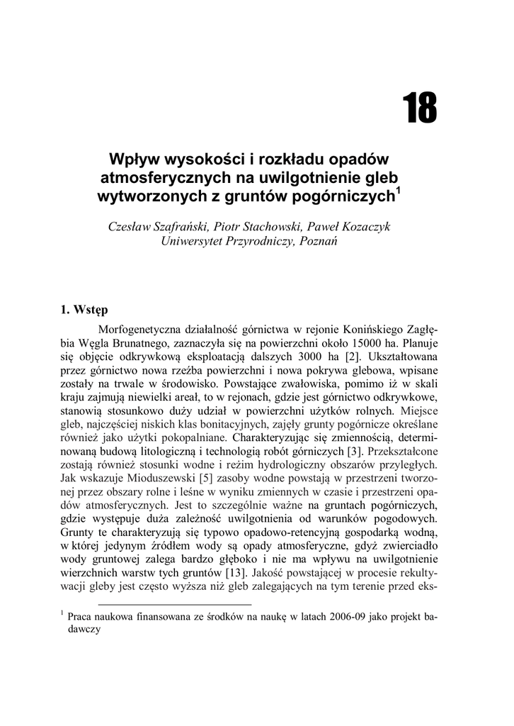 18 Wpływ wysokości i rozkładu opadów atmosferycznych na uwilgotnienie gleb wytworzonych z gruntów pogórniczych1 Czesław Szafrański, Piotr Stachowski, Paweł Kozaczyk Uniwersytet Przyrodniczy, Poznań 1. Wstęp Morfogenetyczna działalność górnictwa w rejonie Konińskiego Zagłębia Węgla Brunatnego, zaznaczyła się na powierzchni około 15000 ha. Planuje się objęcie odkrywkową eksploatacją dalszych 3000 ha [2]. Ukształtowana przez górnictwo nowa rzeźba powierzchni i nowa pokrywa glebowa, wpisane zostały na trwale w środowisko. Powstające zwałowiska, pomimo iż w skali kraju zajmują niewielki areał, to w rejonach, gdzie jest górnictwo odkrywkowe, stanowią stosunkowo duży udział w powierzchni użytków rolnych. Miejsce gleb, najczęściej niskich klas bonitacyjnych, zajęły grunty pogórnicze określane również jako użytki pokopalniane. Charakteryzując się zmiennością, determinowaną budową litologiczną i technologią robót górniczych [3]. Przekształcone zostają również stosunki wodne i reżim hydrologiczny obszarów przyległych. Jak wskazuje Mioduszewski [5] zasoby wodne powstają w przestrzeni tworzonej przez obszary rolne i leśne w wyniku zmiennych w czasie i przestrzeni opadów atmosferycznych. Jest to szczególnie ważne na gruntach pogórniczych, gdzie występuje duża zależność uwilgotnienia od warunków pogodowych. Grunty te charakteryzują się typowo opadowo-retencyjną gospodarką wodną, w której jedynym źródłem wody są opady atmosferyczne, gdyż zwierciadło wody gruntowej zalega bardzo głęboko i nie ma wpływu na uwilgotnienie wierzchnich warstw tych gruntów [13]. Jakość powstającej w procesie rekultywacji gleby jest często wyższa niż gleb zalegających na tym terenie przed eks1 Praca naukowa finansowana ze środków na naukę w latach 2006-09 jako projekt badawczy Czesław Szafrański, Piotr Stachowski, Paweł Kozaczyk ploatacją. Rolę człowieka, w tej prowadzonej z konieczności gospodarczej działalności, należy postrzegać jednak nie tylko jako dewastatora rolniczej i leśnej przestrzeni produkcyjnej, lecz również jako kreatora jej nowej jakości i wartości. Dotychczas prowadzone badania koncentrowały się głównie na zmianach zachodzących w środowisku glebowym wskutek odwadniającego oddziaływania górnictwa odkrywkowego [7, 8], jak również na zrekultywowanych terenach pogórniczych [13]. Skuteczność zabiegów rekultywacyjnych na tych terenach w dużej mierze uzależniona jest od uwilgotnienia gruntów pogórniczych [8]. Wiedza o uwilgotnieniu wierzchnich warstw gruntów pogórniczych może być bardzo przydatna przy podejmowaniu decyzji o sposobie rekultywacji i zagospodarowania zwałowisk oraz przy doborze gatunków i odmian roślin do ich obsiania i nasadzenia. Celem pracy była ocena wpływu wysokości i rozkładu opadów atmosferycznych na uwilgotnienie wierzchnich warstw użytkowanych rolniczo gleb powstałych z gruntów pogórniczych w zróżnicowanych (pod względem opadów i temperatur powietrza) okresach wegetacyjnych 2004 i 2007 roku. 2. Materiał i metody badań W pracy przedstawiono wyniki badań i obserwacji terenowych prowadzonych na terenie pola doświadczalnego Uniwersytetu Przyrodniczego w Poznaniu, zlokalizowanego 10 km na północ od Konina. Obszar objęty badaniami położony jest w południowej części zwałowiska wewnętrznego odkrywki Pątnów, na którym od trzydziestu lat prowadzone są statyczne doświadczenia polowe nad: tempem procesów glebotwórczych różnymi systemami uprawy, nawożenia oraz użytkowania gruntów pogórniczych, i wielkością uzyskiwanych plonów. Badania i obserwacje terenowe są prowadzone na 5 doświadczalnych powierzchniach o wielkości 0,14 ha każda, o zróżnicowanym ich rolniczym użytkowaniu: naturalna sukcesja, lucerna siewna, żyto ozime, ugór zielony (uprawa żyta ozimego-przyorywanego w I dekadzie czerwca, i mieszanki jednorocznych roślin motylkowych-przyorywanej w I dekadzie września na nawóz zielony) i czarny ugór. Na podstawie wykonanych wierceń i odkrywek gleboznawczych wyznaczono, na każdej powierzchni zasięgi gleb o podobnej budowie profilu. Profile te są charakterystyczne w 70-80% dla badanych powierzchni. W pracy poddano szczegółowej analizie kształtowanie się zmian zasobów wodnych w 5 profilach, typowych dla analizowanych powierzchni doświadczalnych, o nawożeniu mineralnym na poziomie 1 NPK. Przez pierwsze 10 lat zastosowano zwiększone nawożenie fosforowo-potasowe, które po 1988 roku zmniejszono zgodnie z potrzebami nawozowymi uprawianych roślin w ilości: od 160 kg N, 80 kg K2O, 40 kg P2O5. Na wybranych powierzchniach wykony258 Środkowo-Pomorskie Towarzystwo Naukowe Ochrony Środowiska Wpływ wysokości i rozkładu opadów atmosferycznych na uwilgotnienie… wano systematyczne, z częstotliwością dwutygodniową, pomiary wilgotności gleby za pomocą sondy profilowej. W wierzchnich warstwach badanych profili glebowych mierzono infiltrację (0-30 cm) i perkolację (30-60 cm) metodą podwójnych pierścieni, w 4 powtórzeniach dla każdego poziomu [6]. Skład granulometryczny oraz właściwości fizyczne, chemiczne i wodne badanych profili glebowych oznaczono w laboratorium Katedry Melioracji, Kształtowania Środowiska i Geodezji UP w Poznaniu metodami powszechnie znanymi i stosowanymi w gleboznawstwie [6, 9]: skład granulometryczny oznaczono metodą areometryczną Casagrande’a w modyfikacji Prószyńskiego z podziałem materiału glebowego na grupy granulometryczne, gęstość stałej fazy gleby (właściwa) oznaczono piknometrem, porowatość (pełną pojemność wodną) obliczono na podstawie gęstości właściwej i objętościowej, zawartość węgla organicznego oznaczono metodą Tiurina, po czym przeliczono ją na zawartość próchnicy (M.O.) wg wzoru: M.O.= C org ∙ 1,724 [6], gęstość objętościową określono na podstawie próbek objętościowych o nienaruszonej strukturze, pobran