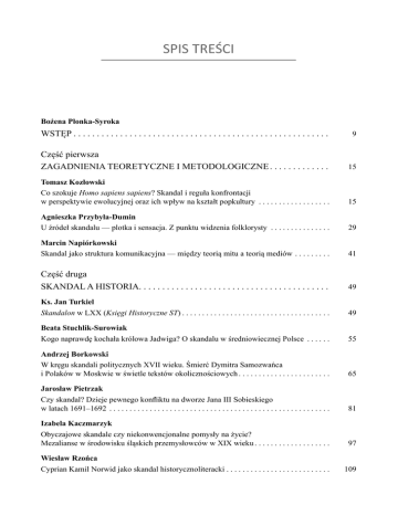 SPIS TREŚCI Bożena Płonka-Syroka WSTĘP . . . . . . . . . . . . . . . . . . . . . . . . . . . . . . . . . . . . . . . . . . . . . . . . . . . . . . . 9 Część pierwsza ZAGADNIENIA TEORETYCZNE I METODOLOGICZNE . . . . . . . . . . . . . 15 Tomasz Kozłowski Co szokuje Homo sapiens sapiens? Skandal i reguła konfrontacji w perspektywie ewolucyjnej oraz ich wpływ na kształt popkultury . . . . . . . . . . . . . . . . . . 15 Agnieszka Przybyła-Dumin U źródeł skandalu — plotka i sensacja. Z punktu widzenia folklorysty . . . . . . . . . . . . . . . 29 Marcin Napiórkowski Skandal jako struktura komunikacyjna — między teorią mitu a teorią mediów . . . . . . . . . 41 Część druga SKANDAL A HISTORIA. . . . . . . . . . . . . . . . . . . . . . . . . . . . . . . . . . . . . . . . . 49 Ks. Jan Turkiel Skandalon w LXX (Księgi Historyczne ST) . . . . . . . . . . . . . . . . . . . . . . . . . . . . . . . . . . . . . 49 Beata Stuchlik-Surowiak Kogo naprawdę kochała królowa Jadwiga? O skandalu w średniowiecznej Polsce . . . . . . 55 Andrzej Borkowski W kręgu skandali politycznych XVII wieku. Śmierć Dymitra Samozwańca i Polaków w Moskwie w świetle tekstów okolicznościowych . . . . . . . . . . . . . . . . . . . . . . . 65 Jarosław Pietrzak Czy skandal? Dzieje pewnego konfliktu na dworze Jana III Sobieskiego w latach 1691–1692 . . . . . . . . . . . . . . . . . . . . . . . . . . . . . . . . . . . . . . . . . . . . . . . . . . . . . . . 81 Izabela Kaczmarzyk Obyczajowe skandale czy niekonwencjonalne pomysły na życie? Mezalianse w środowisku śląskich przemysłowców w XIX wieku . . . . . . . . . . . . . . . . . . . 97 Wiesław Rzońca Cyprian Kamil Norwid jako skandal historycznoliteracki . . . . . . . . . . . . . . . . . . . . . . . . . . 109 6 Spis treści Natalia Lemann Czy historia może być skandalem? Rzecz o historiach alternatywnych i ich sporach z przeszłością/teraźniejszością . . . . . . . . . . . . . . . . . . . . . . . . . . . . . . . . . . . . 123 Część trzecia SKANDALE I SKANDALIŚCI: DAWNIEJ . . . . . . . . . . . . . . . . . . . . . . . . . . 139 Maciej Kostyra Skandal cynicki — jego geneza i implikacje filozoficzne oraz kulturowe . . . . . . . . . . . . . . 139 Ireneusz Szczukowski Skandal świętości. O hagiografii barokowej . . . . . . . . . . . . . . . . . . . . . . . . . . . . . . . . . . . . . 157 Marzanna Kuczyńska, Dominika Gapska Święta „skandalistka” — Ksenia Petersburska . . . . . . . . . . . . . . . . . . . . . . . . . . . . . . . . . . . 171 Jeremiah Alberg The Scandal of Jean-Jacques Rousseau . . . . . . . . . . . . . . . . . . . . . . . . . . . . . . . . . . . . . . . . 179 Marian Ursel Romantyczne skandale, romantyczni skandaliści, czyli problemy z artystami i odbiorcami . . . . . . . . . . . . . . . . . . . . . . . . . . . . . . . . . . . . . . . . . . . . . . . . . . . . 191 Magdalena Dąbrowska Konstancja Łubieńska — czy skandalistka? . . . . . . . . . . . . . . . . . . . . . . . . . . . . . . . . . . . . . 209 Paweł Zarzecki Kulturotwórcza rola skandalu w epoce Młodej Polski . . . . . . . . . . . . . . . . . . . . . . . . . . . . . 219 Wojciech Śmieja Skandaliczny proces Oskara Wilde’a — polskie echa . . . . . . . . . . . . . . . . . . . . . . . . . . . . . 233 Grzegorz Szczypa „Przynajmniej co dwa lata muszę czymś zgorszyć...” — skandale Tadeusza Boya-Żeleńskiego . . . . . . . . . . . . . . . . . . . . . . . . . . . . . . . . . . . . . . . 249 Jacek Jędrzejewicz Luis Buñuel — skandal jako aktualizacyjna forma renovatio . . . . . . . . . . . . . . . . . . . . . . . 255 Leokadia Styrcz-Przebinda Nabokov — skandalista czy świadomy postmodernista? L’affaire Lolita . . . . . . . . . . . . . . 271 Magdalena Rytlewska Skandal rodzi legendę. O fenomenie Kaliny Jędrusik . . . . . . . . . . . . . . . . . . . . . . . . . . . . . 283 Xawery Stańczyk „Gdy dymią krematoria sztuki”. O rytualnym niszczeniu własnej twórczości przez polskich artystów na przełomie lat osiemdziesiątych i dziewięćdziesiątych . . . . . . . 289 Spis treści 7 Część czwarta SKANDALE I SKANDALIŚCI: DZIŚ . . . . . . . . . . . . . . . . . . . . . . . . . . . . . . 303 Małgorzata Micuła Young British Artists — sztuka pozłacanego rynsztoku . . . . . . . . . . . . . . . . . . . . . . . . . . . . 303 Małgorzata Dąbrowska Buzz marketing jako kontrolowany przepływ informacji. Skandal elementem budowania reputacji artysty . . . . . . . . . . . . . . . . . . . . . . . . . . . . . . . . . 311 Paulina Wierzba Lady Gaga — hiperrzeczywisty buntownik na sprzedaż jako propozycja tożsamościowa dla globalnej młodzieży . . . . . . . . . . . . . . . . . . . . . . . . . . . . . . . . . . . . . . . . . . . . . . . . . . . . 325 Jakub Z. Lichański Skandal i wciskanie kitu — próba analizy retorycznej zjawiska. Na przykładzie wypowiedzi Dody [Doroty Rabczewskiej] o Biblii . . . . . . . . . . . . . . . . . . . 333 Tomasz Płonkowski „Kaziu, zakochaj się”. Analiza mechanizmów skandalizacji Kazimierza Marcinkiewicza po ujawnieniu jego romansu z Izabelą Olchowicz . . . . . . . . . . . . . . . . . . . . . . . . . . . . . . . . 349 Grzegorz Wiktorowski Janusz Palikot jako polityczny skandalista. Kreowanie wizerunku w perspektywie antropologicznej (w stronę antropologii wizerunku) . . . . . . . . . . . . . . . . . 361 Piotr Czarnecki Skandal w religii na przykładzie doktryn wybranych nowych ruchów religijnych . . . . . . . 381 Część piąta CIAŁO . . . . . . . . . . . . . . . . . . . . . . . . . . . . . . . . . . . . . . . . . . . . . . . . . . . . . . . 399 Aleksander Dykan Gnostyckie rytuały spermatyczne w relacjach Epifaniusza. Analiza w świetle teorii M. Eliadego i A. di Noli . . . . . . . . . . . . . . . . . . . . . . . . . . . . . . . . . 399 Stanislav Menzelevskyi Tod Browning’s Freaks: Tabooed Body and Scandal in Bourgeois Entertainment Culture . . . . . . . . . . . . . . . . . . . . . . . 