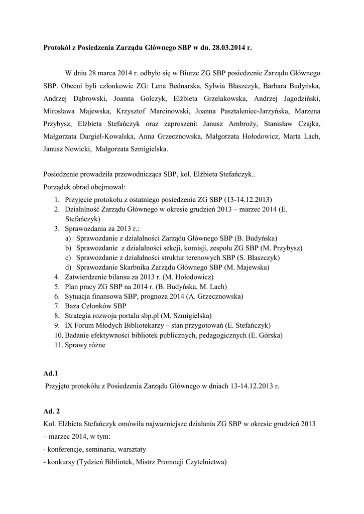 Protokół z Posiedzenia Zarządu Głównego SBP w dn. 28.03.2014 r. W dniu 28 marca 2014 r. odbyło się w Biurze ZG SBP posiedzenie Zarządu Głównego SBP. Obecni byli członkowie ZG: Lena Bednarska, Sylwia Błaszczyk, Barbara Budyńska, Andrzej Dąbrowski, Joanna Golczyk, Elżbieta Grzelakowska, Andrzej Jagodziński, Mirosława Majewska, Krzysztof Marcinowski, Joanna Pasztaleniec-Jarzyńska, Marzena Przybysz, Elżbieta Stefańczyk oraz zaproszeni: Janusz Ambroży, Stanisław Czajka, Małgorzata Dargiel-Kowalska, Anna Grzecznowska, Małgorzata Hołodowicz, Marta Lach, Janusz Nowicki, Małgorzata Szmigielska. Posiedzenie prowadziła przewodnicząca SBP, kol. Elżbieta Stefańczyk.. Porządek obrad obejmował: 1. Przyjęcie protokołu z ostatniego posiedzenia ZG SBP (13-14.12.2013) 2. Działalność Zarządu Głównego w okresie grudzień 2013 – marzec 2014 (E. Stefańczyk) 3. Sprawozdania za 2013 r.: a) Sprawozdanie z działalności Zarządu Głównego SBP (B. Budyńska) b) Sprawozdanie z działalności sekcji, komisji, zespołu ZG SBP (M. Przybysz) c) Sprawozdanie z działalności struktur terenowych SBP (S. Błaszczyk) d) Sprawozdanie Skarbnika Zarządu Głównego SBP (M. Majewska) 4. Zatwierdzenie bilansu za 2013 r. (M. Hołodowicz) 5. Plan pracy ZG SBP na 2014 r. (B. Budyńska, M. Lach) 6. Sytuacja finansowa SBP, prognoza 2014 (A. Grzecznowska) 7. Baza Członków SBP 8. Strategia rozwoju portalu sbp.pl (M. Szmigielska) 9. IX Forum Młodych Bibliotekarzy – stan przygotowań (E. Stefańczyk) 10. Badanie efektywności bibliotek publicznych, pedagogicznych (E. Górska) 11. Sprawy różne Ad.1 Przyjęto protokółu z Posiedzenia Zarządu Głównego w dniach 13-14.12.2013 r. Ad. 2 Kol. Elżbieta Stefańczyk omówiła najważniejsze działania ZG SBP w okresie grudzień 2013 – marzec 2014, w tym: - konferencje, seminaria, warsztaty - konkursy (Tydzień Bibliotek, Mistrz Promocji Czytelnictwa) - działalność wydawnicza - rozwój portalu sbp.pl - realizacja działań w ramach programów operacyjnych i innych (granty, dotacje) - stanowiska, opinie, interwencje - spotkania - Akredytacja Profesjonalna SBP - patronaty. Ad. 3 a) Kol. B. Budyńska przedstawiła sprawozdanie z działalności Zarządu Głównego w 2013 r. Sprawozdanie zostało przyjęte. b) Kol. M. Przybysz przedstawiła sprawozdanie z działalności sekcji, komisji, zespołów problemowych ZG. Kol. E. Stefańczyk zaapelowała, aby sekcje i komisje nadsyłały więcej informacji o swojej działalności na portal sbp.pl. Kol. S. Błaszczyk zauważyła, że niektóre sekcje są mało aktywne i należy zastanowić się nad sposobami ich aktywizacji. Sprawozdanie zostało przyjęte. c) Kol. S. Błaszczyk przedstawiła sprawozdanie z działalności struktur terenowych SBP. Za niepokojący uznała fakt, że nie wszystkie koła przesłały sprawozdania. Analiza sprawozdań dowodzi jednak, że struktury terenowe SBP podejmują wiele ciekawych inicjatyw integrujących środowisko, włączają się też w organizację szkoleń w macierzystych bibliotekach. Sprawozdanie zostało przyjęte. d) Kol. M. Majewska przedstawiła sprawozdanie Skarbnika SBP. Sytuacja finansowa w 2013 r. uległa pogorszeniu w stosunku do roku poprzedniego, co przede wszystkim wynikało ze znacznego spadku prenumeraty czasopism oraz poniesionych kosztów organizacji Krajowego Zjazdu Delegatów SBP. W dyskusji zastanawiano się nad sposobami poprawy tej sytuacji. Dyrektor Biura A. Grzecznowska omówiła podjęte kroki zaradcze, w tym ograniczające wydatki Stowarzyszenia (m.in. zmniejszenie zatrudnienia, renegocjacje umów z drukarniami, ograniczenie innych wydatków), a także zwiększające przychody (uruchomienie cyklu jednodniowych warsztatów, pozyskanie nowych grantów, pertraktacje z aktualnymi i potencjalnymi partnerami wspierającymi SBP). Kol. K. Marcinowski zaproponował, aby wspólnie z przewodniczącymi okręgów zastanowić się nad utworzeniem ze składek członkowskich specjalnego funduszu przeznaczonego na organizację następnego KZD, utrzymanie i rozwój portalu sbp.pl. Sprawozdanie zostało przyjęte. Ad. 4 Główna księgowa Biura, M. Hołodowicz przedstawiła bilans Stowarzyszenia za 2013 r. Sprawozdanie finansowe za 2013 r. zostało przyjęte (Uchwała nr 1/2014). Ad.5 Kol. B. Budyńska zaprezentowała plan pracy ZG SBP na 2014 r. Zwróciła uwagę na nowe tematy szkoleń, seminariów i konferencji, a także na inne działania realizowane w ramach znowelizowanej „Strategii Stowarzyszenia Bibliotekarzy Polskich na lata 2010-2021”, w tym prace prowadzone w zakresie analizy funkcjonowania bibliotek. Plan wydawniczy omówiła dyr. Marta Lach, zwracając szczególną uwagę na pozycje, które są oczekiwane przez środowisko (m.in. książka autorstwa prof. J. Wojciechowskiego, pozycje z serii „BibliotekiDzieci-Młodzież”). Plan pracy ZG SBP został przyjęty. Ad. 6 Dyrektor Biura ZG SBP, A. Grzecznowska przedstawiła prognozę finansową SBP na 2014 r. Prognoza oparta jest na danych szacunkowych, przy założeniu, że sprzedaż czasopism zostaje na poziomie zanotowanym w ub. roku, nie uwzględnia również kosztów przeprowadzki Biura. Kol. St. Czajka uznał, że to dobrze, że taki plan finansowy powstał, jest to jednak za mało, aby odnieść sukces. Prognoza powinna być instrumentem dyscyplinującym politykę finansową i wskazującym możliwości zwiększenia przychodów w sytuacji obserwowanego zmniejszenia wydatków bibliotek na prenumeratę czasopism, na co SBP nie ma wpływu. Analizy finansowe powinny być częstsze i pełniejsze. Kol. J. Pasztaleniec-Jarzyńska zauważyła, że finanse Stowarzyszenia są wynikiem tego, co się dzieje wokoło, pogłębiona dyskusja na ten temat powinna się odbyć w drugiej połowie roku. Kol. E. Stefańczyk dodała, że tzw. „grupa warszawska” ZG spotyka się co miesiąc i analizuje bieżącą sytuację finansową. Kol. J. Golczyk odniosła się do spadku sprzedaży czasopism. Stwierdzi
