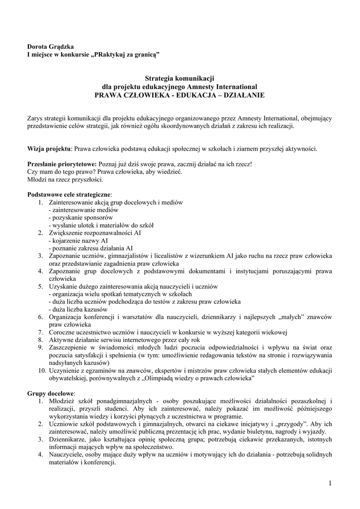 Dorota Grądzka I miejsce w konkursie „PRaktykuj za granicą” Strategia komunikacji dla projektu edukacyjnego Amnesty International PRAWA CZŁOWIEKA - EDUKACJA – DZIAŁANIE Zarys strategii komunikacji dla projektu edukacyjnego organizowanego przez Amnesty International, obejmujący przedstawienie celów strategii, jak również ogółu skoordynowanych działań z zakresu ich realizacji. Wizja projektu: Prawa człowieka podstawą edukacji społecznej w szkołach i ziarnem przyszłej aktywności. Przesłanie priorytetowe: Poznaj już dziś swoje prawa, zacznij działać na ich rzecz! Czy mam do tego prawo? Prawa człowieka, aby wiedzieć. Młodzi na rzecz przyszłości. Podstawowe cele strategiczne: 1. Zainteresowanie akcją grup docelowych i mediów - zainteresowanie mediów - pozyskanie sponsorów - wysłanie ulotek i materiałów do szkół 2. Zwiększenie rozpoznawalności AI - kojarzenie nazwy AI - poznanie zakresu działania AI 3. Zapoznanie uczniów, gimnazjalistów i licealistów z wizerunkiem AI jako ruchu na rzecz praw człowieka oraz przedstawianie zagadnienia praw człowieka 4. Zapoznanie grup docelowych z podstawowymi dokumentami i instytucjami poruszającymi prawa człowieka 5. Uzyskanie dużego zainteresowania akcją nauczycieli i uczniów - organizacja wielu spotkań tematycznych w szkołach - duża liczba uczniów podchodząca do testów z zakresu praw człowieka - duża liczba kazusów 6. Organizacja konferencji i warsztatów dla nauczycieli, dziennikarzy i najlepszych „małych” znawców praw człowieka 7. Coroczne uczestnictwo uczniów i nauczycieli w konkursie w wyższej kategorii wiekowej 8. Aktywne działanie serwisu internetowego przez cały rok 9. Zaszczepienie w świadomości młodych ludzi poczucia odpowiedzialności i wpływu na świat oraz poczucia satysfakcji i spełnienia (w tym: umożliwienie redagowania tekstów na stronie i rozwiązywania nadsyłanych kazusów) 10. Uczynienie z egzaminów na znawców, ekspertów i mistrzów praw człowieka stałych elementów edukacji obywatelskiej, porównywalnych z „Olimpiadą wiedzy o prawach człowieka” Grupy docelowe: 1. Młodzież szkół ponadgimnazjalnych - osoby poszukujące możliwości działalności pozaszkolnej i realizacji, przyszli studenci. Aby ich zainteresować, należy pokazać im możliwość późniejszego wykorzystania wiedzy i korzyści płynących z uczestnictwa w programie. 2. Uczniowie szkół podstawowych i gimnazjalnych, otwarci na ciekawe inicjatywy i „przygody”. Aby ich zainteresować, należy umożliwić publiczną prezentację ich prac, wydanie biuletynu, nagrody i wyjazdy. 3. Dziennikarze, jako kształtująca opinię społeczną grupa; potrzebują ciekawie przekazanych, istotnych informacji mających wpływ na społeczeństwo. 4. Nauczyciele, osoby mające duży wpływ na uczniów i motywujący ich do działania - potrzebują solidnych materiałów i konferencji. 1 Zarys działań: Organizacja projektu pod hasłem: „Czy mam do tego prawo? Dowiedz się, zostań ekspertem!” Projekt ma na celu zapoznanie uczniów z prawami człowieka i zwrócenie uwagi przez media na tę tematykę. Strategia komunikacji jest tworzona na długi okres czasu, przypuszczalnie jako stały program edukacyjny z prężnie działającą stroną internetową i sekcjami dla „mecenasów praw człowieka” i „młodych detektywów”. Konstytucja RP, Konwencja Narodów Zjednoczonych, Powszechna Deklaracja Praw Człowieka, działalność Międzynarodowego Trybunału Sprawiedliwości to podstawa merytoryczna projektu. Pierwszym krokiem jest zapoznanie nauczycieli i dziennikarzy z akcją. Nauczyciele powinni otrzymać biuletyny z informacjami o akcji, jak również pomoce naukowe w formie dokumentów zawierających prawa człowieka. Członkowie lokalnych oddziałów AI przybywają na zajęcia instruktarzowe i wspólnie rozmawiają, jak również analizują z młodzieżą prawa człowieka (poziom dostosowany do wieku uczniów, przewiduje się podziały na 4 kategorie wiekowe, klasy 1-3, 4-6, gimnazjum, liceum). Lekcja kończy się ogłoszeniem konkursu na kazus (dotyczący zawiłej sytuacji, w której być może osoba została pozbawiona swoich praw), który dzieci mają dostarczyć w określonym czasie. Ogłoszona zostaje również ścieżka rozwoju młodych mecenasów praw człowieka, którymi zostają wszystkie osoby uczestniczące w spotkaniu. Nauczyciel pod okiem członków AI i zainteresowanych studentów prawa, przeprowadza kilka tygodni po lekcji test, który wyłoni najlepszych znawców praw człowieka. Zostaje nim się po przekroczeniu pewnego progu punktów. Znawcy dostają dyplomy. Zadaniem znawców będzie wybór kazusów z prac uczniów okręgu, które następnie w drodze losowania będą podstawą walki o tytuł mistrza praw człowieka. Po kilku miesiącach, znawcy w okręgach będą zdawać testy na ekspertów. Eksperci dostaną dyplomy i emblematy na klapę marynarki. Po pewnym czasie mają szansę na to by zostać mistrzem. Na tym etapie, oprócz testu należy rozstrzygnąć kazus (jeden z nadsyłanych na coroczny konkurs). Każda kategoria wiekowa obejmuje trzy lata, testy odbywają się co roku w formie jednego konkursu z trzema etapami (znawca, ekspert, mistrz). Każdy znawca, ekspert i mistrz wpisywany jest na stronę internetową. Najlepsi spotykają się na warsztatach wakacyjnych. Na stronie internetowej znajduje się źródło wiedzy, a także galeria prac. Każdy chętny rozwiązuje kazusy, najlepsze są nagradzane. Dziennikarze komentują kazusy i poprawiają raporty. Nauczyciele uczestniczą w warsztatach i są zaopatrzeni w materiały dla bibliotek. Kazusy mogą być nadsyłane w dowolnej formie (nagranie, film, opis, grafika) przedstawiającej dowolną sytuację życiową, w dowolnym kraju, dowolnym czasie, która przedstawia sytuację prawdopodobnego pozbawienia przysługującego prawa lub wolności danej osoby. Liczy się kreatywność, innowacyjność oraz trafność ka
