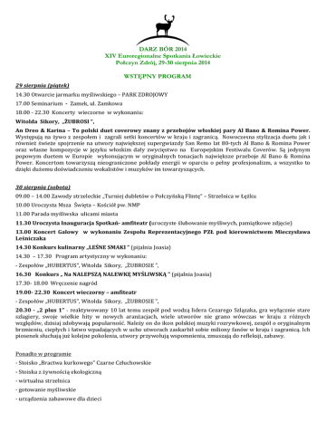 DARZ BÓR 2014 XIV Euroregionalne Spotkania Łowieckie Połczyn Zdrój, 29-30 sierpnia 2014 WSTĘPNY PROGRAM 29 sierpnia (piątek) 14.30 Otwarcie jarmarku myśliwskiego – PARK ZDROJOWY 17.00 Seminarium - Zamek, ul. Zamkowa 18.00 - 22.30 Koncerty wieczorne w wykonaniu: Witolda Sikory, „ŻUBROSI ”, An Dreo & Karina – To polski duet coverowy znany z przebojów włoskiej pary Al Bano & Romina Power. Występują na żywo z zespołem i zagrali setki koncertów w kraju i zagranicą. Nowoczesna stylizacja duetu jak i również świeże spojrzenie na utwory największej supergwiazdy San Remo lat 80-tych Al Bano & Romina Power oraz własne kompozycje w języku włoskim dały zwycięstwo na Europejskim Festiwalu Coverów. Są jedynym popowym duetem w Europie wykonującym w oryginalnych tonacjach największe przeboje Al Bano & Romina Power. Koncertom towarzyszą nieograniczone pokłady energii w oparciu o pełny profesjonalizm, a wszystko to dzięki dużemu doświadczeniu wokalistów i muzyków im towarzyszących. 30 sierpnia (sobota) 09.00 – 14.00 Zawody strzeleckie „Turniej dubletów o Połczyńską Flintę” – Strzelnica w Łężku 10.00 Uroczysta Msza Święta – Kościół pw. NMP 11.00 Parada myśliwska ulicami miasta 11.30 Uroczysta Inauguracja Spotkań- amfiteatr (uroczyste ślubowanie myśliwych, pamiątkowe zdjęcie) 13.00 Koncert Galowy w wykonaniu Zespołu Reprezentacyjnego PZŁ pod kierownictwem Mieczysława Leśniczaka 14.30 Konkurs kulinarny „LEŚNE SMAKI ” (pijalnia Joasia) 14.30 – 17.30 Program artystyczny w wykonaniu: - Zespołów „HUBERTUS”, Witolda Sikory, „ŻUBROSIE ”, 16.30 Konkurs „ Na NALEPSZĄ NALEWKĘ MYŚLIWSKĄ ” (pijalnia Joasia) 17.30- 18.00 Wręczenie nagród 19.00- 22.30 Koncert wieczorny – amfiteatr - Zespołów „HUBERTUS”, Witolda Sikory, „ŻUBROSIE ”, 20.30 - „2 plus 1” - reaktywowany 10 lat temu zespół pod wodzą lidera Cezarego Szlązaka, gra wyłącznie stare szlagiery, swoje wielkie hity w nowych aranżacjach, wiele utworów nie grano wówczas w kraju z różnych względów, dzisiaj zdobywają popularność. Należy on do ikon polskiej muzyki rozrywkowej, zespół o oryginalnym brzmieniu, ciepłych i łatwo wpadających w ucho utworach zaskarbił sobie miliony fanów w kraju i zagranicą. Ich piosenek słuchają już kolejne pokolenia, utwory przywołują wspomnienia, zmuszają do refleksji, zabawy. Ponadto w programie - Stoisko „Bractwa kurkowego” Czarne Człuchowskie - Stoiska z żywnością ekologiczną - wirtualna strzelnica - gotowanie myśliwskie - urządzenia zabawowe dla dzieci