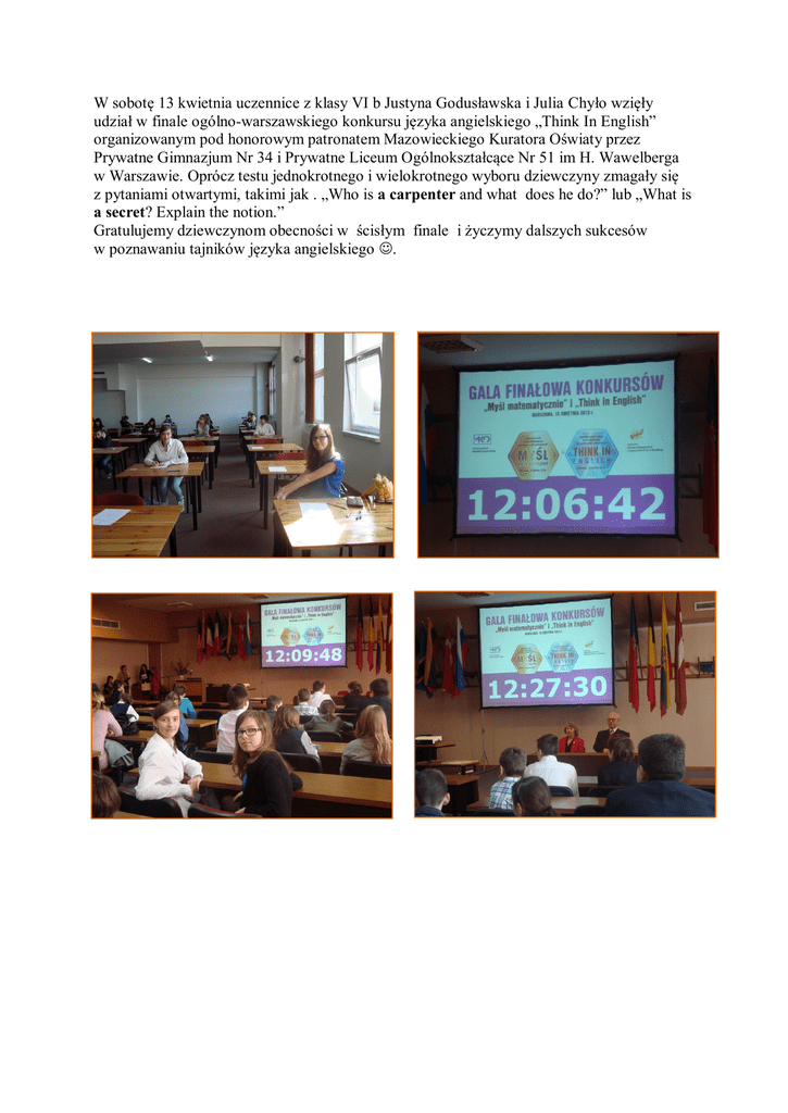 W sobotę 13 kwietnia uczennice z klasy VI b Justyna Godusławska i Julia Chyło wzięły udział w finale ogólno-warszawskiego konkursu języka angielskiego „Think In English” organizowanym pod honorowym patronatem Mazowieckiego Kuratora Oświaty przez Prywatne Gimnazjum Nr 34 i Prywatne Liceum Ogólnokształcące Nr 51 im H. Wawelberga w Warszawie. Oprócz testu jednokrotnego i wielokrotnego wyboru dziewczyny zmagały się z pytaniami otwartymi, takimi jak . „Who is a carpenter and what does he do?” lub „What is a secret? Explain the notion.” Gratulujemy dziewczynom obecności w ścisłym finale i życzymy dalszych sukcesów w poznawaniu tajników języka angielskiego .