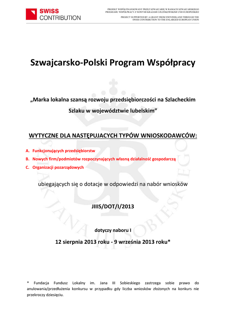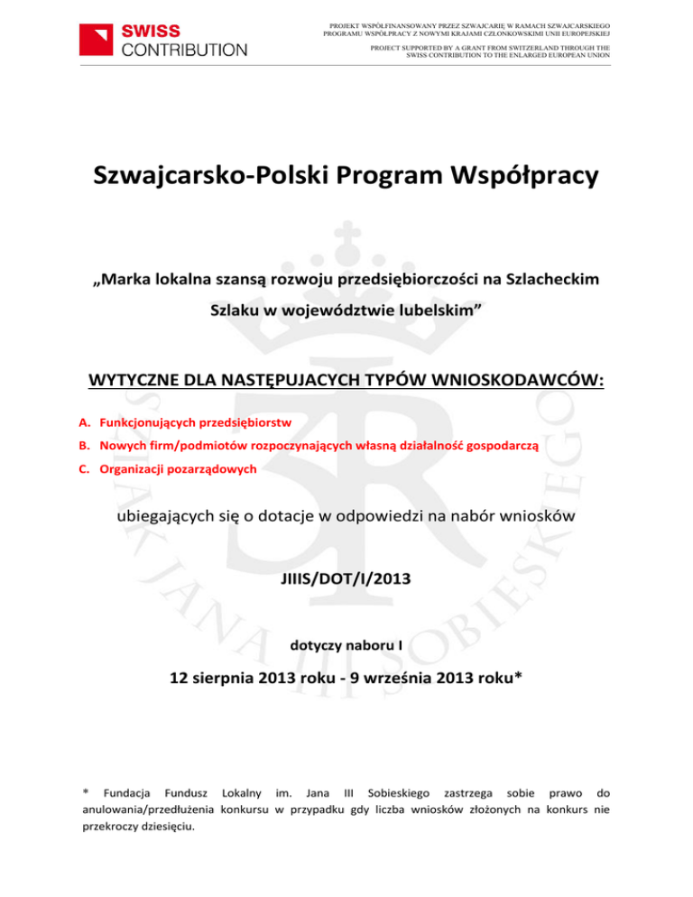 PROJEKT WSPÓŁFINANSOWANY PRZEZ SZWAJCARIĘ W RAMACH SZWAJCARSKIEGO PROGRAMU WSPÓŁPRACY Z NOWYMI KRAJAMI CZŁONKOWSKIMI UNII EUROPEJSKIEJ PROJECT SUPPORTED BY A GRANT FROM SWITZERLAND THROUGH THE SWISS CONTRIBUTION TO THE ENLARGED EUROPEAN UNION Szwajcarsko-Polski Program Współpracy „Marka lokalna szansą rozwoju przedsiębiorczości na Szlacheckim Szlaku w województwie lubelskim” WYTYCZNE DLA NASTĘPUJACYCH TYPÓW WNIOSKODAWCÓW: A. Funkcjonujących przedsiębiorstw B. Nowych firm/podmiotów rozpoczynających własną działalność gospodarczą C. Organizacji pozarządowych ubiegających się o dotacje w odpowiedzi na nabór wniosków JIIIS/DOT/I/2013 dotyczy naboru I 12 sierpnia 2013 roku - 9 września 2013 roku* * Fundacja Fundusz Lokalny im. Jana III Sobieskiego zastrzega sobie prawo do anulowania/przedłużenia konkursu w przypadku gdy liczba wniosków złożonych na konkurs nie przekroczy dziesięciu. PROJEKT WSPÓŁFINANSOWANY PRZEZ SZWAJCARIĘ W RAMACH SZWAJCARSKIEGO PROGRAMU WSPÓŁPRACY Z NOWYMI KRAJAMI CZŁONKOWSKIMI UNII EUROPEJSKIEJ PROJECT SUPPORTED BY A GRANT FROM SWITZERLAND THROUGH THE SWISS CONTRIBUTION TO THE ENLARGED EUROPEAN UNION SPIS TREŚCI 1.PROGRAM ............................................................................................................................................ 3 1.1 TŁO SZWAJCARSKO-POLSKIEGO PROGRAMU WSPÓŁPRACY ........................................................ 3 1.2 TŁO PROGRAMU ............................................................................................................................ 3 1.3 ALOKACJA FINANSOWA................................................................................................................. 4 2. REGUŁY POSTĘPOWANIA DLA NINIEJSZEGO NABORU...................................................................... 6 2.1 KRYTERIA KWALIFIKOWALNOŚCI ................................................................................................. 7 2.1.1 Kwalifikowalność Wnioskodawców – Kto może aplikować ? ................................................. 8 2.1.2 Partnerstwa i kwalifikowalność partnerów .......................................................................... 13 2.1.3 Kwalifikowalne działania: działania, o realizację których można aplikować ...................... 15 2.1.4 Kwalifikowalność kosztów: Koszty, które mogą być brane pod uwagę przy udzielaniu dotacji ............................................................................................................................................ 17 2.2 JAK APLIKOWAĆ I JAKICH PROCEDUR PRZESTRZEGAĆ .............................................................. 20 2.2.1 Wniosek ................................................................................................................................ 20 2.2.2 Miejsce i forma składanych wniosków ................................................................................. 23 2.2.3 Termin składania wniosków ................................................................................................. 24 2.2.4 Dodatkowe informacje dla wnioskodawców........................................................................ 24 2.3. OCENA I WYBÓR WNIOSKÓW ................................................................................................... 25 2.4 POWIADOMIENIE O DECYZJI ...................................................................................................... 32 2.4.1 Decyzja o wyniku oceny ........................................................................................................ 32 2.4.2 Planowany harmonogram ................................................................................................... 32 2.5 WARUNKI DOTYCZĄCE WDRAŻANIA DZIAŁAŃ NASTĘPUJĄCYCH PO DECYZJI O PRZYZNANIU DOTACJI ................................................................................................................................................. 33 2.5.1 Przyznanie dotacji ................................................................................................................. 33 2.5.2 Realizacja zamówień ............................................................................................................ 33 2.5.3 Promocja Programu.............................................................................................................. 35 3. LISTA ZAŁĄCZNIKÓW ........................................................................................................................ 36 Strona 2 z 36 PROJEKT WSPÓŁFINANSOWANY PRZEZ SZWAJCARIĘ W RAMACH SZWAJCARSKIEGO PROGRAMU WSPÓŁPRACY Z NOWYMI KRAJAMI CZŁONKOWSKIMI UNII EUROPEJSKIEJ PROJECT SUPPORTED BY A GRANT FROM SWITZERLAND THROUGH THE SWISS CONTRIBUTION TO THE ENLARGED EUROPEAN UNION 1.PROGRAM 1.1 TŁO SZWAJCARSKO-POLSKIEGO PROGRAMU WSPÓŁPRACY Wdrażanie Szwajcarsko-Polskiego Programu Współpracy ma przyczynić się do zmniejszenia różnic gospodarczych i społecznych pomiędzy Polską a bardziej rozwiniętymi państwami rozszerzonej Unii Europejskiej oraz przyczynić się w Polsce do zmniejszenia różnic gospodarczych i społecznych pomiędzy dynamicznymi ośrodkami miejskimi i słabymi strukturalnie regionami peryferyjnymi, określonymi jako obszar koncentracji geograficznej (województwo lubelskie, województwo podkarpackie, województwo świętokrzyskie i województwo małopolskie). Ponadto, Program Współpracy ma pozytywny wpływ na zacieśnienie dwustronnej współpracy pomiędzy Polską i Szwajcarią. Bezzwrotne, finansowe wsparcie Szwajcarsko-Polskiego Programu Współpracy opiewa na kwotę 489,02 mln CHF i zakłada 5-letni okres zaciągania zobowiązań i 10-letni okres wydatkowania, który rozpoczął się 14 czerwca 2007 r., tj. w dniu przyznania pomocy finansowej Polsce przez Parlament Szwajcarski. 1.2 TŁO PROGRAMU Ogólnym celem programu „Marka lokalna szansą rozwoju przedsiębiorczośc