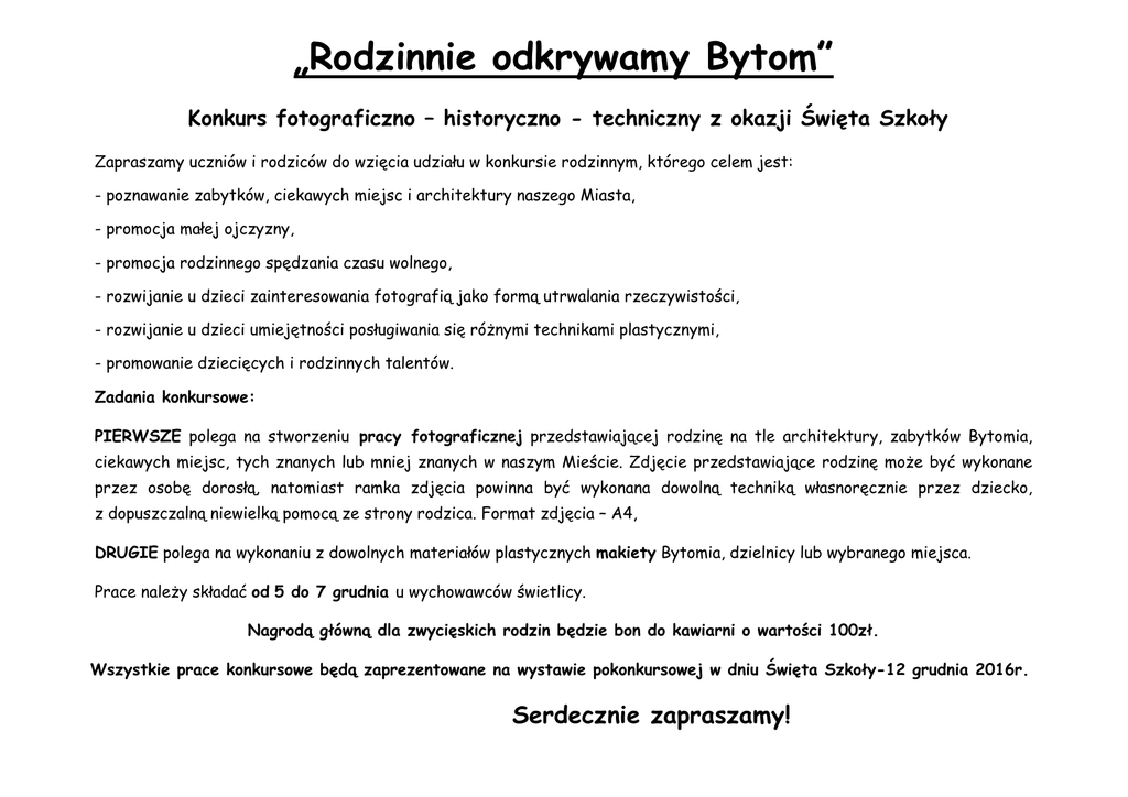 „Rodzinnie odkrywamy Bytom” Konkurs fotograficzno – historyczno - techniczny z okazji Święta Szkoły Zapraszamy uczniów i rodziców do wzięcia udziału w konkursie rodzinnym, którego celem jest: - poznawanie zabytków, ciekawych miejsc i architektury naszego Miasta, - promocja małej ojczyzny, - promocja rodzinnego spędzania czasu wolnego, - rozwijanie u dzieci zainteresowania fotografią jako formą utrwalania rzeczywistości, - rozwijanie u dzieci umiejętności posługiwania się różnymi technikami plastycznymi, - promowanie dziecięcych i rodzinnych talentów. Zadania konkursowe: PIERWSZE polega na stworzeniu pracy fotograficznej przedstawiającej rodzinę na tle architektury, zabytków Bytomia, ciekawych miejsc, tych znanych lub mniej znanych w naszym Mieście. Zdjęcie przedstawiające rodzinę może być wykonane przez osobę dorosłą, natomiast ramka zdjęcia powinna być wykonana dowolną techniką własnoręcznie przez dziecko, z dopuszczalną niewielką pomocą ze strony rodzica. Format zdjęcia – A4, DRUGIE polega na wykonaniu z dowolnych materiałów plastycznych makiety Bytomia, dzielnicy lub wybranego miejsca. Prace należy składać od 5 do 7 grudnia u wychowawców świetlicy. Nagrodą główną dla zwycięskich rodzin będzie bon do kawiarni o wartości 100zł. Wszystkie prace konkursowe będą zaprezentowane na wystawie pokonkursowej w dniu Święta Szkoły-12 grudnia 2016r. Serdecznie zapraszamy!