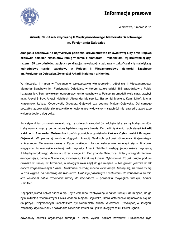 Informacja prasowa Warszawa, 5 marca 2011 Arkadij Naiditsch zwycięzcą II Międzynarodowego Memoriału Szachowego im. Ferdynanda Dziedzica Zmagania szachowe na najwyższym poziomie, arcymistrzowie ze światowej elity oraz krajowa czołówka polskich szachistów ramię w ramie z amatorami i miłośnikami tej królewskiej gry, razem 188 zawodników, zacięta rywalizacja, rewelacyjna zabawa zakończył się największy jednodniowy turniej szachowy w Polsce: II Międzynarodowy Memoriał Szachowy im. Ferdynanda Dziedzica. Zwyciężył Arkadij Naiditsch z Niemiec. W niedzielę, 4 marca w Trzciance w województwie wielkopolskim, odbył się II Międzynarodowy Memoriał Szachowy im. Ferdynanda Dziedzica, w którym wzięło udział 188 zawodników z Polski i z zagranicy. Ten największy jednodniowy turniej szachowy w Polsce zgromadził wiele sław, przybyli m.in. Alexei Shirov, Arkadij Naiditsch, Alexander Moiseenko, Bartłomiej Macieja, Kamil Mitoń, Michal Krasenkow, Łukasz Cyborowski, Grzegorz Gajewski czy Joanna Majdan-Gajewska. Od samego początku zapowiadało się niezwykle emocjonujące widowisko – szachiści nie zawiedli, zwycięzcę wyłoniła dopiero dogrywka. Po całym dniu rozgrywek okazało się, że czterech zawodników zdobyło taką samą liczbę punktów i aby wyłonić zwycięzcę potrzebne będzie rozegranie baraży. Do partii błyskawicznych stanęli Arkadij Naiditsch, Alexander Moiseenko i dwóch polskich arcymistrzów Łukasz Cyborowski i Grzegorz Gajewski. W pierwszej rundzie dogrywki Arkadij Naiditsch pokonał Grzegorza Gajewskiego, a Alexander Moiseenko Łukasza Cyborowskiego i to oni ostatecznie zmierzyli się w finałowej rozgrywce. Po niezwykle zaciętej partii zwyciężył Arkadij Naiditsch zostając jednocześnie zwycięzcą II Międzynarodowego Memoriału Szachowego im. Ferdynanda Dziedzica. Polacy rozegrali niemniej emocjonującą partię o 3 miejsce, zwycięzcą okazał się Łukasz Cyborowski. To już drugie podium Łukasza w turnieju w Trzciance, w ubiegłym roku zajął drugie miejsce. – Nie grałem jeszcze w tak dobrze zorganizowanym turnieju. Doskonałe zawody, mocna konkurencja. Cieszę się, że udało mi się tu dziś wygrać, bo naprawdę nie było łatwo. Gratuluję pozostałym szachistom i do zobaczenia za rok. Już wpisałem sobie trzcianecki turniej do kalendarza – powiedział zwycięzca turnieju, Arkadij Naiditsch. Najlepszą wśród kobiet okazała się Edyta Jakubiec, zdobywając w całym turnieju 31 miejsce, druga była aktualna wicemistrzyni Polski Joanna Majdan-Gajewska, która ostatecznie uplasowała się na 36 pozycji. Najmłodszym uczestnikiem był siedmioletni Michał Wieczorek. Zwycięzcą w kategorii Najlepszy Wychowanek Ferdynanda Dziedzica został, tak jak w ubiegłym roku, Paweł Bęben. Zawodnicy chwalili organizacje turnieju, a także wysoki poziom zawodów. Publiczność była Informacja prasowa zachwycona możliwością obserwowania gry, a także porozmawiania z wielkimi arcymistrzami, którzy w przerwach turnieju chętnie objaśniali nawet najbardziej skomplikowane posunięcia szachowe. Każdy mógł zmierzyć się z takimi sławami, jak Alexei Shirov czy Kamil Mitoń. Obaj arcymistrzowie w oczekiwaniu na oficjalne wyniki turnieju rozgrywali partie błyskawiczne z każdym, kto chciał sprawdzić swoje szachowe możliwości. Młodzi zawodnicy cierpliwie czekali na swoją kolei i z wielkim zainteresowaniem obserwowali wszystkie partie. Nowością w tegorocznym Memoriale była transmisja internetowa rozgrywek prowadzonych na 10 pierwszych szachownicach na stronie www.memorialszachowy.pl. Dla tych, którzy nie mogli przyjechać do Trzcianki była to doskonała okazja do śledzenia na żywo gry najwyżej rozstawionych zawodników w turnieju. Sędzią głównym zawodów był Waldemar Kopydłowski, sędzią pomocniczym i jednocześnie inicjatorem turnieju był Maciej Cybulski. Zawody rozgrywano systemem szwajcarskim, na dystansie 9 rund, 15 minut na zawodnika. Turniej był otwarty dla wszystkich, każdy mógł wziąć w nim udział i zmierzyć się z wielkimi arcymistrzami. Jednym z głównych sponsorów II Międzynarodowego Memoriału Szachowego im. Ferdynanda Dziedzica była agencja Public Relations Partner of Promotion. Patronat nad imprezą objął Wielkopolski Związek Szachowy. Pierwsza 10 klasyfikacji II Międzynarodowego Memoriału Szachowego im. Ferdynanda Dziedzica Wyniki II Miejsce Imię i Nazwisko 1. Arkadij Naiditsch 2. Alexander Moiseekno 3. Łukasz Cyborowski 4. Grzegorz Gajewski 5. Alexei Shirov 6. Michal Krasenkow 7. Michał Olszewski 8. Klaudiusz Urban 9. Tomasz Markowski 10. Vitali Koziak Międzynarodowego Memoriału Szachowego można obejrzeć na stronie http://chessarbiter.com/turnieje/2012/ti_323/final_standings&9.html ### Ferdynand Dziedzic był zawodnikiem z pierwszą kategorią, sędzią klasy pierwszej i wychowawcą wielu pokoleń szachistów w Trzciance. Jego największą pasją były szachy. Grał i wygrywał, ale nie poprzestał na tym. Chciał, aby miłość do szachów poczuli także jego uczniowie i rzeczywiście – jego wychowankowie z sukcesami startują w turniejach już nie tylko polskich, ale też międzynarodowych. Pracował jako instruktor w Młodzieżowym Domu Informacja prasowa Kultury, a także jako organizator turniejów, m.in. był inicjatorem i organizatorem Memoriału Szachowego im. Ireny Krawiec. Ferdynand Dziedzic za pracę zawodową i społeczną został odznaczony Krzyżem Kawalerskim Odrodzenia Polski, Złotym Krzyżem Zasługi, Medalem Komisji Edukacji Narodowej, Odznaką Honorową "Zasłużony dla Województwa Pilskiego i Poznańskiego". Aby upamiętnić jego dokonania trzcianecka młodzież z Młodzieżowego klubu Sportowego MDK postanowiła zorganizować wydarzenie, o jakim on zawsze marzył – największy jednodniowy turniej w Polsce. I Memoriał im. Ferdynanda Dziedzica odbył się w Trzciance 6 marca 2011 roku, jego zwycięzcą został Orest Gritsak z Ukrainy. Dodatkowych