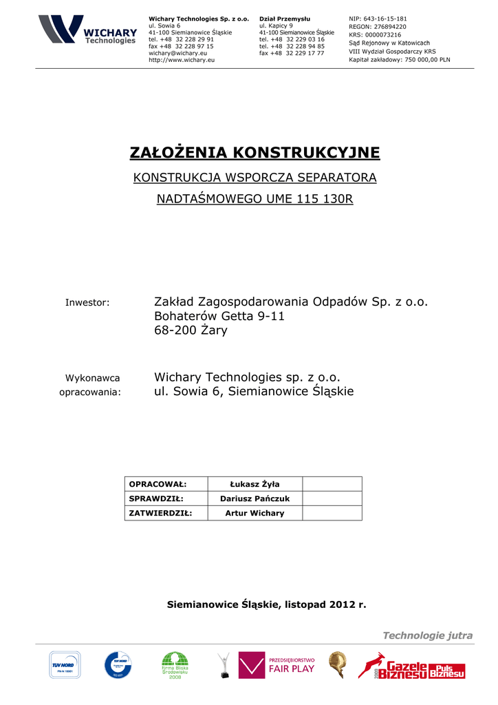 ZAŁOŻENIA KONSTRUKCYJNE KONSTRUKCJA WSPORCZA SEPARATORA NADTAŚMOWEGO UME 115 130R Inwestor: Zakład Zagospodarowania Odpadów Sp. z o.o. Bohaterów Getta 9-11 68-200 Żary Wykonawca Wichary Technologies sp. z o.o. ul. Sowia 6, Siemianowice Śląskie opracowania: OPRACOWAŁ: Łukasz Żyła SPRAWDZIŁ: Dariusz Pańczuk ZATWIERDZIŁ: Artur Wichary Siemianowice Śląskie, listopad 2012 r. SPIS TREŚCI 1. DANE OGÓLNE 1.1. Przedmiot opracowania 1.2. Cel opracowania 1.3. Zakres opracowania 1.4. Podstawa opracowania 1.5. Podstawowe normy i przepisy związane 2. ZAŁOŻENIA OBLICZENIOWE 3. ZAŁOŻENIA KONSTRUKCYJNE 4. POŁĄCZENIA SPAWANE 5. POŁĄCZENIA SKRĘCANE 6. POSTANOWIENIA KOŃCOWE 1. 2. 3. 4. 5. 6. ZAŁĄCZNIKI Rys. „Inwentaryzacja” Rys. „Zabudowa separatora UME 115 130R” Rys. „Konstrukcja wsporcza separatora UME 115 130R” Karta katalogowa TD_UME_R Karta katalogowa EBV_UME_R_Q Karta katalogowa TD_UMX_AGH 1. DANE OGÓLNE 1.1. Przedmiot opracowania Przedmiotem opracowania są założenia konstrukcyjne dla konstrukcji wsporczej separatora elektromagnetycznego nadtaśmowego UME 115 130R. Separator przewidziany jest do zabudowy w istniejącej linii sortowania odpadów komunalnych, celem wychwycenia znajdujących się w strudze transportowanego materiału elementów ferromagnetycznych. Urządzenie będzie współpracowało z przenośnikiem taśmowym płaskim, wychodzącym z kabiny sortowniczej. Separator zlokalizowany jest w końcowej części przenośnika, pomiędzy kabiną sortowniczą a kontenerami odbierającymi materiał z przenośnika. Odbiór materiału z separatora nadtaśmowego za pomocą zsuwni do mobilnych pojemników. 1.2. Cel opracowania Celem niniejszego opracowania jest przedstawienie wytycznych konstrukcyjnych i materiałowych dla konstrukcji wsporczej, umożliwiających prawidłową zabudowę separatora nadtaśmowego. Niniejsze opracowanie stanowi podstawę do wykonania szczegółowej dokumentacji warsztatowej przedmiotowej konstrukcji wsporczej. 1.3. Zakres opracowania Zakres niniejszego opracowania obejmuje wyłącznie wytyczne konstrukcyjne i materiałowe dla konstrukcji wsporczej (nośnej) separatora elektromagnetycznego nadtaśmowego UME 115 130R. Dla powyższego urządzenia zakłada się wykonanie niezależnej stalowej konstrukcji wsporczej, w postaci ramy, zakotwionej do betonowego podłoża. Niniejsze opracowanie nie uwzględnia zsuwni materiałów czy ewentualnej przebudowy elementów istniejącej infrastruktury. Nie przewiduje się również pomostów roboczych czy stałych środków dostępu do maszyn. Zakłada się, że prace konserwacyjne i serwisowe będą prowadzone przy użyciu tymczasowych pomostów roboczych i odpowiednich środków dostępu. Zapewnienie i odpowiednie wykonanie powyższych elementów pozostaje w gestii Inwestora. 1.4. • • • • Podstawa opracowania Zlecenie Inwestora, Wizja lokalna, pomiary inwentaryzacyjne, Wytyczne Inwestora, dane producenta urządzenia, Obowiązujące przepisy i normy do projektowania. 1.5. • • • • • • • • • • • Podstawowe normy i przepisy związane Dyrektywa Maszynowa 2006/42/WE. PN-EN ISO 12100-1:2005 Bezpieczeństwo maszyn. Pojęcia podstawowe, ogólne zasady projektowania. Część 1 i 2. PN-82/B-02000 Obciążenia budowli. Zasady ustalania wartości. PN-82/B-02001 Obciążenia budowli. Obciążenia stałe. PN-82/B-02003 Obciążenia budowli. Obciążenia zmienne technologiczne. Podstawowe obciążenia technologiczne i montażowe. PN-80/B-02010 Obciążenia w obliczeniach statycznych. Obciążenia śniegiem. PN-77/B-02011 Obciążenia w obliczeniach statycznych. Obciążenia wiatrem. PN-87/B-02013 Obciążenia budowli. Obciążenia zmienne środowiskowo. Obciążenia oblodzeniem. PN-90/B-03200 Konstrukcje stalowe. Obliczenia statyczne i projektowanie. PN-B-06200 Konstrukcje stalowe budowlane. Warunki wykonania i odbioru. Wymagania podstawowe. PN-EN 25817:1999 Złącza stalowe spawane łukowo. Wytyczne do określania poziomów jakości według niezgodności spawalniczych. 2. ZAŁOŻENIA OBLICZENIOWE • system obliczeń: - metoda stanów granicznych zgodnie z normą statyczne i projektowanie”. PN/B-03200 „Konstrukcje stalowe. Obliczenia • warunki wykonania i odbioru: - zgodnie z normą PN-B-06200 „Konstrukcje stalowe budowlane. Warunki wykonania i odbioru. Wymagania podstawowe”. • materiał: - stal niestopowa konstrukcyjna S235JR z atestem zgodnie z PN-EN 10025:2004 (lub St3S z atestem zgodnie z PN-89/H-84023). • wytrzymałość obliczeniowa stali - fd = 215 MPa (dla t ≤ 16 mm) wg PN/B-03200 tablica 2. • obliczeniowy współczynnik bezpieczeństwa n=2,3 • obciążenia stałe: - separator magnetyczny nadtaśmowy UME 115 130R. współczynniki obciążenia: - ciężary własne urządzeń stacjonarnych - współczynnik dynamiczny urządzeń transportu wewnętrznego 3550kg γf = 1,2 (PN/B-02003) γ = 1,2 (PN/B-02003) • obciążenia zmienne: - obciążenie śniegiem, wg. PN-80/B-02010 (wraz z Az1), γf = 1,5 - obciążenie wiatrem, wg. PN-77/B-02011 (wraz z Az1) , γf = 1,5 - obciążenie oblodzeniem, wg. PN-87/B-02013, γf = 1,5 3. ZAŁOŻENIA KONSTRUKCYJNE Separator magnetyczny nadtaśmowy UME 115 130R Separator magnetyczny zawieszony na stalowej konstrukcji wsporczej, poprzecznie nad przenośnikiem taśmowym. Maksymalna wysokość zawieszenia separatora nad taśmą przenośnika 490mm. Zawiesia w postaci drągów gwintowanych M24 długości 1300mm, umożliwiających regulację wysokości zawieszenia separatora, nachylonych pod kątem 8° w obu kierunkach (podkładka klinowa). Konstrukcja stalowa z profili walcowanych na gorąco, spawana oraz skręcana. Konstrukcja posadowiona na betonowym podłożu za pomocą stalowych kotew rozporowych M20x200 (np. Hilti HST). Profile główne konstrukcji: - belka poprzeczna nośna: zestaw ceowników zwykłych 2 C 160 w rozstawie s=120mm, l=2,55m; przewiązki łączące profile - blacha pionowa gr. min. 8mm spawana do profil