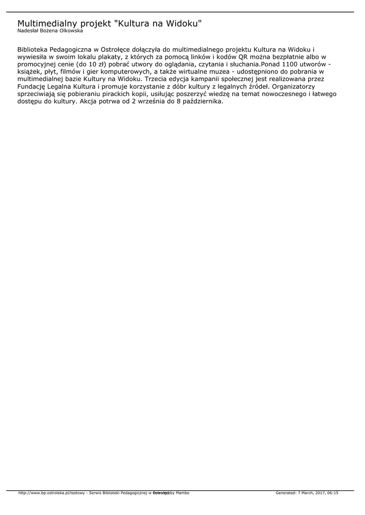 Multimedialny projekt "Kultura na Widoku" Nadesłał Bożena Olkowska Biblioteka Pedagogiczna w Ostrołęce dołączyła do multimedialnego projektu Kultura na Widoku i wywiesiła w swoim lokalu plakaty, z których za pomocą linków i kodów QR można bezpłatnie albo w promocyjnej cenie (do 10 zł) pobrać utwory do oglądania, czytania i słuchania.Ponad 1100 utworów książek, płyt, filmów i gier komputerowych, a także wirtualne muzea - udostępniono do pobrania w multimedialnej bazie Kultury na Widoku. Trzecia edycja kampanii społecznej jest realizowana przez Fundację Legalna Kultura i promuje korzystanie z dóbr kultury z legalnych źródeł. Organizatorzy sprzeciwiają się pobieraniu pirackich kopii, usiłując poszerzyć wiedzę na temat nowoczesnego i łatwego dostępu do kultury. Akcja potrwa od 2 września do 8 października. http://www.bp.ostroleka.pl/testowy - Serwis Biblioteki Pedagogicznej w Ostrołęce Powered by Mambo Generated: 7 March, 2017, 06:15