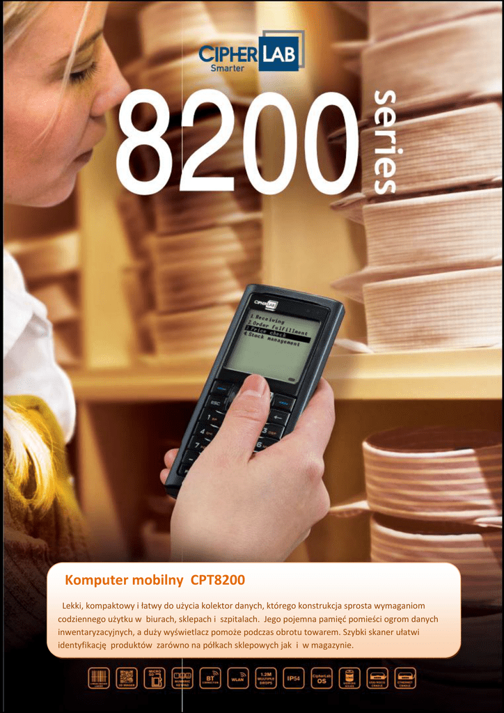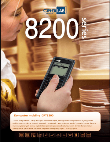 Komputer mobilny CPT8200 Lekki, kompaktowy i łatwy do użycia kolektor danych, którego konstrukcja sprosta wymaganiom codziennego użytku w biurach, sklepach i szpitalach. Jego pojemna pamięć pomieści ogrom danych inwentaryzacyjnych, a duży wyświetlacz pomoże podczas obrotu towarem. Szybki skaner ułatwi identyfikację produktów zarówno na półkach sklepowych jak i w magazynie. 8200 8230 Procesor 32-bit Pamięć ulotna Platforma systemowa Komunikacja Odczyt kodów 4/8MB SRAM Pamięć stała 8MB Flash ROM Rozszerzenia port microSD z obsługą SDHC do 8GB Zasilanie Czas pracy / Podtrzymanie danych Sygnalizacja Akumulator Litowy 3,7V 1200mAh TBD / 25 dni Dwukolorowe LEDy (czerw/ziel, nieb/ziel)oraz dźwięk i wibracje WLAN -- Zabezpieczenia -- WPAN -- Profile BT -- Port szeregowy ieee802.11 b/g -WEP,EAP,WPA (PSK) -WPA2(TKIP,AES,PSK) Bluetooth 2.1+EDR class2 SPP,DUN,HID,Headset,FTP USB (Vcom,Vcom-cdc,HID,MassStorage) , RS232, Stacja dokująca I/F Skaner Wyświetlacz Laser / Dioda / Imager 2D 160x160 pikseli z podświetleniem LED (białe) Klawiatura Dane fizyczne Wymiary 24 klawisze z podświetleniem 136x58x25 mm (Dioda) 136x58x32 (Laser) Waga Dane Środowiskowe Temperatura pracy T. przechowywania Wilgotność Odporność upadkowa Odp. elektrostatyczna Normy EMC 8266 150g od -10o C do 60o C od -20o C do 70o C 5-95% (przechowywanie) 10-90% (praca) wiele upadków na beton z wysokości 1,2m ±15kV (powietrze) ±8kV (bezpośrednio) FCC,IC,CE,C-tic,BSMI FCC,IC,CE,Green,C-tic,SRMC,CCC,BSMI,NCC Wsparcie programistyczne Kompilatory BLAZE C i BASIC Aplikacje Akcesoria FORGE–generator aplikacji, STREAM Wireless studio, MIRROR–terminal emulator Doki komunikacyjne RS/USB/Ethernet, 4-pozycyjna ładowarka, uchwyt pistoletowy (GUN-Grip) Gwarancja 1 ROK