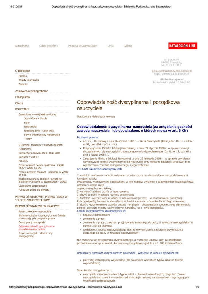 19.01.2015 Odpowiedzialność dyscyplinarna i porządkowa nauczyciela Biblioteka Pedagogiczna w Szamotułach Aktualności Gdzie jesteśmy Pogoda w Szamotułach Linki Galeria ul. Staszica 4 64500 Szamotuły; tel. 61 29 21 521 O Bibliotece [email protected] http://szamotuly.pbp.poznan.pl Historia Biblioteka czynna: Poniedziałek piątek 10.0017.00 Zasady korzystania Zadania Zestawienia bibliograficzne Czasopisma Oferta POLECAMY Czasopisma w wersji elektronicznej Języki Obce w Szkole Lider N@uczyciel Niebieska Linia spisy treści Serwis Informacyjny Narkomania Trendy Elearning literatura w naszych zbiorach MegaMatma Nowa edycja serwisu Ibuk Ibuk Libra Nowości w 2o14 r. POLONA Praca socjalna/ pomoc społeczna książki IRSS w wersji online Praca z uczniem zdolnym poradniki w wersji online Książki mówione w zbiorach Powiatowej Biblioteki Publicznej w Szamotułach wykaz Czasopisma pedagogiczne Fundusze unijne dla oświaty PRAWO OŚWIATOWE I PRAWO PRACY W "GŁOSIE NAUCZYCIELSKIM" PRAWO OŚWIATOWE W PRAKTYCE Awans zawodowy nauczyciela Biblioteki szkolne i pedagogiczne w świetle obowiązujących przepisów prawa Ocena pracy nauczyciela Odpowiedzialność dyscyplinarna i porządkowa nauczyciela Prawa i obowiązki członka rady pedagogicznej Odpowiedzialność dyscyplinarna i porządkowa nauczyciela Opracowała Małgorzata Kowzan Odpowiedzialność dyscyplinarna nauczyciela (za uchybienia godności zawodu nauczyciela lub obowiązkom, o których mowa w art. 6 KN) Podstawa prawna: art. 75 85 Ustawy z dnia 26 stycznia 1982 r. – Karta Nauczyciela (tekst jedn.: Dz. U. z 2006 r. nr 97, poz. 674 z późn. zm.), Rozporządzenie Ministra Edukacji Narodowej z dnia 22 stycznia 1998 r. w sprawie komisji dyscyplinarnych dla nauczycieli i trybu postępowania dyscyplinarnego (Dz. U. Nr 15, poz. 64 z dnia 3 lutego 1998 r.), Zarządzenie Ministra Edukacji Narodowej z dnia 26 listopada 2010 r. w sprawie powołania Odwoławczej Komisji Dyscyplinarnej dla Nauczycieli przy Ministrze Edukacji Narodowej oraz wyznaczenia rzecznika dyscyplinarnego i jego zastępców. Art. 6 KN Nauczyciel obowiązany jest: 1) rzetelnie realizować zadania związane z powierzonym mu stanowiskiem oraz podstawowymi funkcjami szkoły: dydaktyczną, wychowawczą i opiekuńczą, w tym zadania związane z zapewnieniem bezpieczeństwa uczniom w czasie zajęć organizowanych przez szkołę; 2) wspierać każdego ucznia w jego rozwoju; 3) dążyć do pełni własnego rozwoju osobowego; 4) kształcić i wychowywać młodzież w umiłowaniu Ojczyzny, w poszanowaniu Konstytucji Rzeczypospolitej Polskiej, w atmosferze wolności sumienia i szacunku dla każdego człowieka; 5) dbać o kształtowanie u uczniów postaw moralnych i obywatelskich zgodnie z ideą demokracji, pokoju i przyjaźni między ludźmi różnych narodów, ras i światopoglądów. Karami dyscyplinarnymi dla nauczycieli są: nagana z ostrzeżeniem zwolnienie z pracy zwolnienie z pracy z zakazem przyjmowania ukaranego do pracy w zawodzie nauczycielskim w okresie 3 lat od ukarania wydalenie z zawodu nauczycielskiego (jest to równoznaczne z zakazem przyjmowania ukaranego do pracy w zawodzie nauczycielskim) Nie wszczyna się postępowania dyscyplinarnego, a wszczęcie umarza, gdy za popełnione przewinienie nauczyciel został ukarany karą porządkową zgodnie z art. 108 Kodeksu Pracy. Orzekanie w sprawach dyscyplinarnych nauczycieli właściwe są komisje dyscyplinarne: pierwszej instancji przy wojewodzie (dla nauczycieli wszystkich typów szkół na terenie województwa) Skład komisji dyscyplinarnych: nauczyciele mianowani różnych typów szkół i placówek oświatowych, mogą być również nauczyciele zatrudnieni w urzędach administracji rządowej na stanowiskach wymagających kwalifikacji pedagogicznych, http://szamotuly.pbp.poznan.pl/?odpowiedzialnoscdyscyplinarnaiporzadkowanauczyciela,108 1/6 19.01.2015 Odpowiedzialność dyscyplinarna i porządkowa nauczyciela Biblioteka Pedagogiczna w Szamotułach członków powołuje , odwołuje, ustala liczbę i funkcje (przewodniczącego i zastępców) wojewoda i właściwy minister, przy którym komisja działa, w porozumieniu ze związkami zawodowymi, kandydatów, wraz z podaniem uzasadnienia, zgłaszają: organy administracji rządowej, samorządowej oraz rady pedagogiczne, kadencja komisji trwa 4 lata, obowiązki członka komisji można pełnić nie dłużej niż przez dwie kolejne kadencje. Komisja pierwszej instancji orzeka w składzie trzyosobowym. Komisja drugiej instancji orzeka w składzie: trzech członków, gdy orzeczono karę nagany z ostrzeżeniem, zwolnienia z pracy lub zwolnienia z pracy z zakazem przyjmowania do pracy w zawodzie nauczyciela w okresie 3 lat, pięciu członków, gdy orzeczono karę wydalenia z zawodu nauczyciela. Przewodniczący komisji: zaznajamia się z każdą sprawą wpływającą do komisji ustala składy orzekające powołuje przewodniczącego składu, jeżeli sam nie przewodniczy składowi wyznacza termin pierwszego posiedzenia składu zapewnia szybki i sprawny przebieg postępowania dyscyplinarnego czuwa nad zgodnością postępowania z obowiązującymi przepisami Rzecznik dyscyplinarny powołuje go (oraz jego zastępców) organ, przy którym działa komisja dyscyplinarna, spośród pracowników zatrudnionych odpowiednio w kuratorium oświaty, MEN oraz MKiDN, w celu przeprowadzenia czynności mających ustalić zasadność zarzutu uchybienia godności zawodu lub obowiązkom oraz okoliczności przewinienia. Zadania rzecznika dyscyplinarnego przy wojewodzie: prowadzenie postępowania wyjaśniającego na plecenie wojewody, składanie wniosków o wszczęcie postępowania dyscyplinarnego do komisji albo umorzenie postępowania wyjaśniającego, uczestniczenie w rozprawach dyscyplinarnych w charakterze strony, wnoszenie zażaleń na postanowienia i odwołań od orzeczeń komisji dyscyplinarnej przy wojewodzie do odwoławczej komisji dyscyplinarnej przy właściwym ministrze, składanie podań do wła