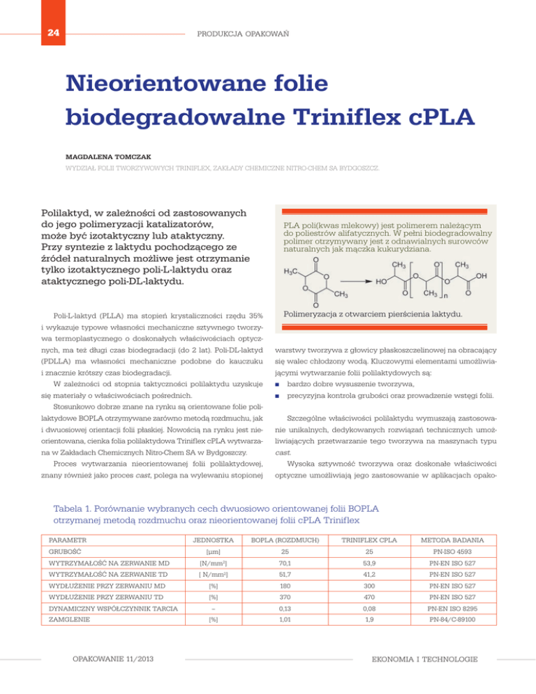 od obecnych dotychczas na rynku folii BOPLA. Folia cPLA o dobrych właściwościach mechanicznych, charakteryzująca się