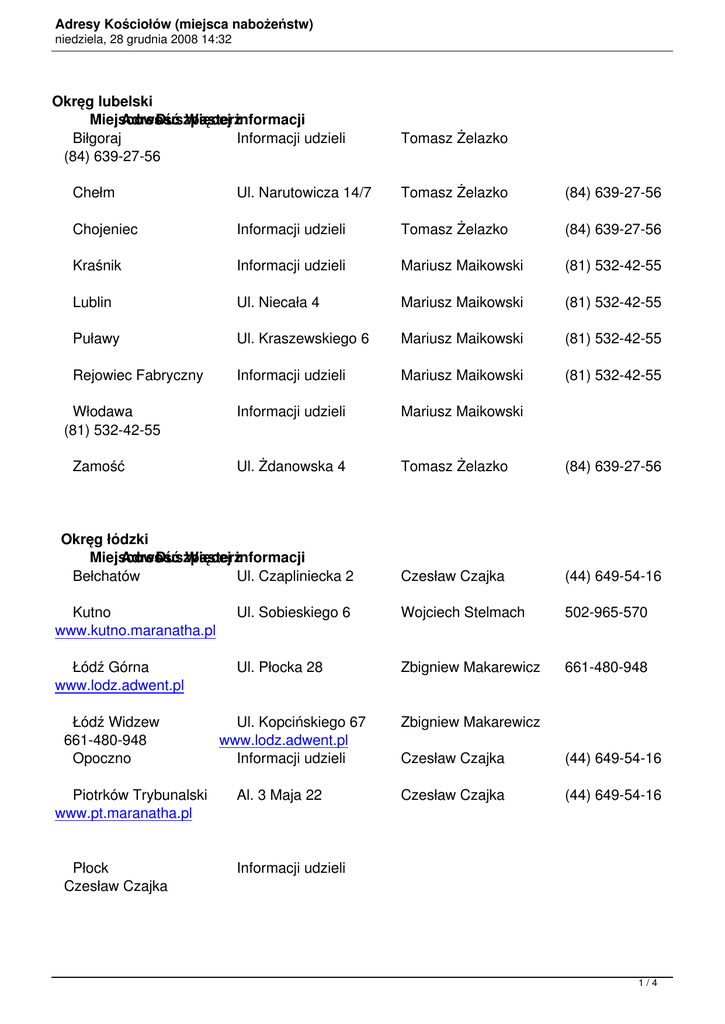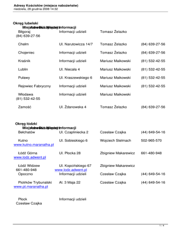 Adresy Kościołów (miejsca nabożeństw) niedziela, 28 grudnia 2008 14:32 Okręg lubelski Miejscowość AdresDuszpasterz Więcej informacji Biłgoraj Informacji udzieli (84) 639-27-56 Tomasz Żelazko Chełm Ul. Narutowicza 14/7 Tomasz Żelazko (84) 639-27-56 Chojeniec Informacji udzieli Tomasz Żelazko (84) 639-27-56 Kraśnik Informacji udzieli Mariusz Maikowski (81) 532-42-55 Lublin Ul. Niecała 4 Mariusz Maikowski (81) 532-42-55 Puławy Ul. Kraszewskiego 6 Mariusz Maikowski (81) 532-42-55 Rejowiec Fabryczny Informacji udzieli Mariusz Maikowski (81) 532-42-55 Informacji udzieli Mariusz Maikowski Ul. Żdanowska 4 Tomasz Żelazko (84) 639-27-56 Czesław Czajka (44) 649-54-16 Włodawa (81) 532-42-55 Zamość Okręg łódzki Miejscowość AdresDuszpasterz Więcej informacji Bełchatów Ul. Czapliniecka 2 Kutno www.kutno.maranatha.pl Ul. Sobieskiego 6 Wojciech Stelmach 502-965-570 Łódź Górna www.lodz.adwent.pl Ul. Płocka 28 Zbigniew Makarewicz 661-480-948 Łódź Widzew 661-480-948 Opoczno Piotrków Trybunalski www.pt.maranatha.pl Płock Czesław Czajka Ul. Kopcińskiego 67 www.lodz.adwent.pl Informacji udzieli Al. 3 Maja 22 Zbigniew Makarewicz Czesław Czajka (44) 649-54-16 Czesław Czajka (44) 649-54-16 Informacji udzieli 1/4 Adresy Kościołów (miejsca nabożeństw) niedziela, 28 grudnia 2008 14:32 (44) 649-54-16 Szarów Informacji udzieli Zduńska Wola Ul. Ogrodowa 7 www.zdunskawola.maranatha.pl Zgierz Wojciech Stelmach Wojciech Stelmach 502 965 570 Wojciech Stelmach 502 965 570 Jarosław Trojanowski 570 690 420 ul. Śniechowskiego 23 502 965 570 Okręg Mazowiecki Miejscowość AdresDuszpasterz Więcej informacji Ciechanów Informacji udzieli Grodzisk Mazowiecki Informacji udzieli Mariusz Zaborowski 604-414-144 Lipsk Informacji udzieli Remigiusz Krok 509-112-452 Łuków ul. Wyszyńskiego 22 I piętro Konrad Pasikowski 669 450 105 Mszczonów Informacji udzieli Mariusz Zaborowski www.fzz.pl Ostrowiec Świętokrzyski ul. Górzysta 5/11 Remigiusz Krok 509-112-452 Podkowa Leśna Ul. Jana Pawła II 39 Mariusz Zaborowski www.nadzieja.tv Radom ul. Okulickiego 32a Remigiusz Krok 509-112-452 Siedlce Ul. Brzechwy 11 Konrad Pasikowski www.adwentyscisiedlce.info Sochaczew Informacji udzieli Mariusz Zaborowski 604-414-144 Starachowice Informacji udzieli Warszawa Centrum Ul. Foksal 8 warszawa.adwent.pl Warszawa Zbór UkraińskiUl. Foksal 8 604-414-144 604-414-144 669-450-105 Remigiusz Krok 509-112-452 Krzysztof Romanowski 501-935-643 Mikołaj Krzyżanowski 888-878-889 501-935-643 Warszawa Ursynów Informacji udzieli Krzysztof Romanowski Warszawa Żoliborz Informacji udzieli Krzysztof Romanowski 2/4 Adresy Kościołów (miejsca nabożeństw) niedziela, 28 grudnia 2008 14:32 501-935-643 Węgrów www.zoliborz.adwent.pl Informacji udzieli Wyszków 888 878 889 Informacji udzieli Okręg Podlaski Miejscowość AdresDuszpasterz Więcej informacji Białystok Ul. Jurowiecka 24 Konrad Pasikowski 669 450 105 Mikołaj Krzyżanowski Adam Grześkowiak 661 348 416 Bielsk Podlaski Ul. Hołowieska 49 Adam Grześkowiak 661 348 416 Hajnówka Ul. Południowa 20 Adam Grześkowiak 661 348 416 Krasna Wieś Krasna Wieś 40 Adam Grześkowiak 661 348 416 Łomża Informacji udzieli Piotr Gołaszewski 604-135-721 Ostrołęka Informacji udzieli Wojciech Didyk 696-140-602 Ostrów Mazowiecka Informacji udzieli Piotr Gołaszewski 604-135-721 Adam Ples (89) 624-56-88 Suwałki Mieczysław Tarasiuk 501-757-207 informacji udzieli Okręg Warmińsko-Mazurski Miejscowość AdresDuszpasterz Więcej informacji Górkowo Informacji udzieli Iława Informacji udzieli Adam Ples (89) 624-56-88 Kętrzyn Informacji udzieli Adam Ples (89) 624-56-88 Lidzbark Warmiński Ul. Poniatowskiego 20 Piotr Bylina 793-316-584 Mrągowo Informacji udzieli Adam Ples (89) 624-56-88 Nidzica Informacji udzieli Adam Ples (89) 624-56-88 3/4 Adresy Kościołów (miejsca nabożeństw) niedziela, 28 grudnia 2008 14:32 Olsztyn Ul. Gdyńska 2a Adam Ples (89) 624-56-88 Ramsówko Informacji udzieli Adam Ples (89) 624-56-88 Szczytno Ul. Sobieszczańskiego 12Adam Ples (89) 624-56-88 Wilkasy Mieczysław Tarasiuk 501-757-207 Informacji udzieli 4/4