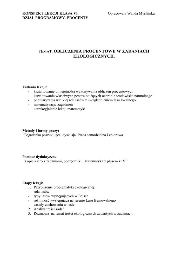 KONSPEKT LEKCJI KLASA VI DZIAŁ PROGRAMOWY- PROCENTY Opracowała Wanda Myślińska TEMAT: OBLICZENIA PROCENTOWE W ZADANIACH EKOLOGICZNYCH. Zadania lekcji: - kształtowanie umiejętności wykonywania obliczeń procentowych - kształtowanie właściwych postaw służących ochronie środowiska naturalnego - popularyzacja wielkiej roli lasów z uwzględnieniem lasu lokalnego - matematyzacja zagadnień - uatrakcyjnienie lekcji matematyki Metody i formy pracy: Pogadanka poszukująca, dyskusja. Praca samodzielna i zbiorowa. Pomoce dydaktyczne: Kopie ksero z zadaniami, podręcznik ,, Matematyka z plusem kl VI” Etapy lekcji: 1. Przybliżenie problematyki ekologicznej: - rola lasów - typy lasów występujących w Polsce - roślinność występująca na terenie Lasu Bemowskiego - zasady zachowania w lesie 2. Analiza treści zadań. 3. Rozmowa na temat treści ekologicznych zawartych w zadaniach. KONSPEKT LEKCJI KLASA VI DZIAŁ PROGRAMOWY- PROCENTY Opracowała Wanda Myślińska Etap I Sprawdzenie obecności. Podanie tematu lekcji. Zapisują temat lekcji w zeszycie. •Pogadanka na temat ekologii – nauce badającej organizmy w ich środowiskach, populacje roślinne i zwierzęce oraz różnego typu zespoły organizmów ich strukturę funkcjonowanie i zmienność na tle środowiska. Przykładem takiego środowiska są lasy Uczniowie wymieniają przyczyny: ( kiedyś pokrywały większą część lądów, po - zostały wycięte by dać miejsce wielu z nich nie pozostał żaden ślad). uprawom roślinnym i miastom - zanieczyszczenia przemysłowe - pożary - surowiec dla przemysłu Wymieniają: •Typy lasów: - iglaste ( W lasach liściastych rosną takie drzewa jak: - liściaste dęby, klony, buki. Tracą liście, co jesień. mieszane Występują tam gdzie lato ciepłe, a zima chłodna. Obfitują w zwierzynę. Liczne ptaki, ale także: sarny, dziki, wiewiórki. W lasach iglastych rosną przede wszystkim sosny i świerki. Drzewa mają igły zamiast liści. Nie zrzucają ich na zimę). Uczniowie wymieniają Jakie gatunki roślin i zwierząt występują w Lesie Bemowskim? Podają przykłady: •Rola lasów. - drzewa pobierają CO 2 - wydzielają tlen - gromadzą wodę - zatrzymują pyły - jest to miejsce wypoczynku, rekreacji - środowisko życia zwierząt • Jakie zachowanie człowieka chroni las przed Uczniowie wymieniają: - nie wchodzimy do lasu gdy jest zakaz pożarem? - nie pozostawiamy szklanych przedmiotów - nie bawimy się zapałkami Etap II 1. Zadanie 4 str. 135 Podręcznik ,, Matematyka Uczniowie czytają treść zadania analizują zamieszczoną mapę Polski. z plusem kl 6” Na mapie zamieszczono, jaki procent Odpowiadają na pytania zamieszczone w powierzchni województw zajmują lasy. zadaniu. KONSPEKT LEKCJI KLASA VI DZIAŁ PROGRAMOWY- PROCENTY a) Które województwo jest najbardziej zalesione? b) Wyraź w procentach, jaka część powierzchni twojego województwa nie jest zalesiona. c) Lasy w Polsce stanowią 28,3% powierzchni. Porównaj tę informację z danymi dotyczącymi twojego województwa. d) W których województwach lasy 1 stanowią ponad powierzchni? 3 e) W których województwach ponad 3 powierzchni stanowią obszary 4 zalesione? Rozdanie kartek z treścią zadań 2 i 3. 2. Zadanie Ogólna powierzchnia kompleksu Las Bemowo wynosi około 514 ha. 46,7% tej powierzchni zajmuje sosna. Ile ha lasu zajmuje sosna? Ile ha zajmują inne gatunki roślin? 3. Zadanie W 1998 roku spłonęło 15 ha lasu świerkowego. W następnym roku posadzono nowy las, którego powierzchnia była większa od spalonego o 20%. W nowo posadzonym lesie Opracowała Wanda Myślińska Uczniowie czytają treść zadania i zastanawiają się nad rozwiązaniem. Pracują samodzielnie. Obliczenia wykonują w zeszytach, odczytują i sprawdzają poprawność wyników. Uczniowie czytają samodzielnie zadanie i ciekawostkę. Zastanawiają się nad rozwiązaniem. Zapisują rozwiązanie na tablicy i w zeszycie. KONSPEKT LEKCJI KLASA VI DZIAŁ PROGRAMOWY- PROCENTY Opracowała Wanda Myślińska 1 33 % powierzchni zajmują drzewa, a resztę 3 lasu zarośla i polanki. ,,Ciekawostka” Wiadomo, że świerk osiąga wysokość 40 m do 50 m. Przestaje rosnąć między 70-tym a 120tym rokiem życia. W lasach rzadko przekracza wiek 150 lat, natomiast dziko rosnące świerki mogą dożyć 350 lat, a świerki w puszczach do 600 lat. a) Ile hektarów zajmuje teraz nowy las? b) Ile ha zajmują drzewa, a ile polanki i zarośla? c) W którym roku świerki osiągną wiek 70 lat, a w którym 120 lat. Etap III Podsumowanie lekcji: zadawanie pytań dotyczących wiadomości zdobytych podczas lekcji - rola i znaczenie lasu - zachowanie w lesie nie stwarzające zagrożenia Zadanie domowe: - wykonaj diagram kołowy do zadania 2 - narysuj plakat: ,,Bezpieczne zachowanie w lesie" Uczniowie odpowiadają na pytania.