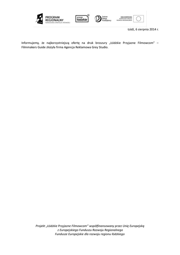 Łódź, 6 sierpnia 2014 r. Informujemy, że najkorzystniejszą ofertę na druk broszury „Łódzkie Przyjazne Filmowcom” – Filmmakers Guide złożyła firma Agencja Reklamowa Grey Studio. Projekt „Łódzkie Przyjazne Filmowcom” współfinansowany przez Unię Europejską z Europejskiego Funduszu Rozwoju Regionalnego Fundusze Europejskie dla rozwoju regionu łódzkiego