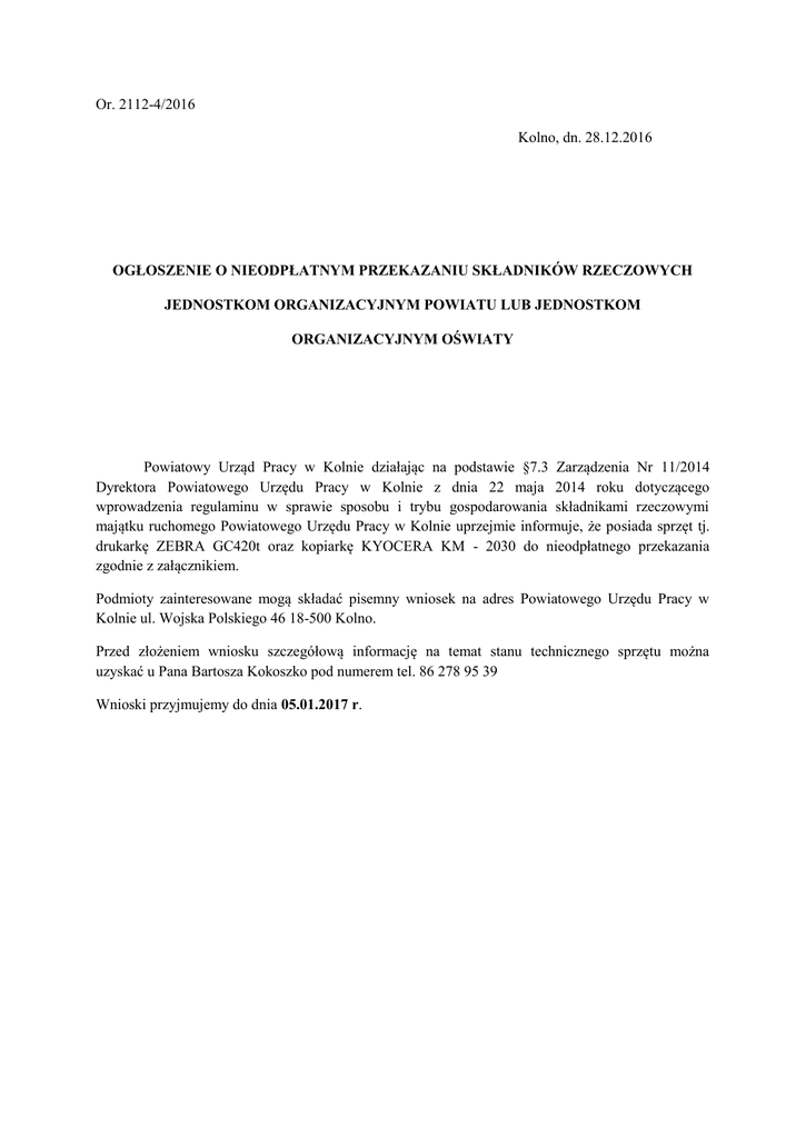 Or. 2112-4/2016 Kolno, dn. 28.12.2016 OGŁOSZENIE O NIEODPŁATNYM PRZEKAZANIU SKŁADNIKÓW RZECZOWYCH JEDNOSTKOM ORGANIZACYJNYM POWIATU LUB JEDNOSTKOM ORGANIZACYJNYM OŚWIATY Powiatowy Urząd Pracy w Kolnie działając na podstawie §7.3 Zarządzenia Nr 11/2014 Dyrektora Powiatowego Urzędu Pracy w Kolnie z dnia 22 maja 2014 roku dotyczącego wprowadzenia regulaminu w sprawie sposobu i trybu gospodarowania składnikami rzeczowymi majątku ruchomego Powiatowego Urzędu Pracy w Kolnie uprzejmie informuje, że posiada sprzęt tj. drukarkę ZEBRA GC420t oraz kopiarkę KYOCERA KM - 2030 do nieodpłatnego przekazania zgodnie z załącznikiem. Podmioty zainteresowane mogą składać pisemny wniosek na adres Powiatowego Urzędu Pracy w Kolnie ul. Wojska Polskiego 46 18-500 Kolno. Przed złożeniem wniosku szczegółową informację na temat stanu technicznego sprzętu można uzyskać u Pana Bartosza Kokoszko pod numerem tel. 86 278 95 39 Wnioski przyjmujemy do dnia 05.01.2017 r. Spis sprzętu do nieodpłatnego przekazania Lp. Nazwa składnika Ilość Rok nabycia Numer fabryczny Nr inwentarzowy 1 Kopiarka KIOCERA Mita2030 2003 S/N: 37153462 ŚT-8-80-803-3/2003 2 Drukarka etykiet Zebra GC 420t 2013 S/N: 54J123700264 W-315/2013 KWOTA DO ZNIESIENIA Wartość 15 006,00 2 054,10 17 060,10 Lokalizacja (pokój) Pokój 4 Pokój 11 Przyczyna zgłoszenia do likwidacji Wyszczególniony sprzęt nie nadaje się do użytku z powodu wyeksploatowania i z uwagi na przestarzałość technologiczną uniemożliwiającą sprawne wykonywanie obowiązków służbowych. Sprzęt ten nie może być używany w naszej jednostce bez dodatkowej modernizacji, a ta jest nieopłacalna. Poza tym drukarka Zebra nie posiada interfejsu sieciowego co jest niezbędne do sprawnego działania systemu EZD. Dodatkowym powodem zgłoszenia do likwidacji środków jest brak miejsca składowania wymienionych składników , co w konsekwencji spowoduje trwałe uszkodzenie sprzętu (wysoka wilgotność powietrza, kurz w pomieszczeniu). Proszę o zagospodarowanie sprzętu.
