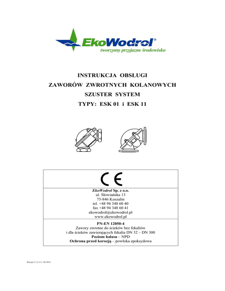 INSTRUKCJA OBSŁUGI ZAWORÓW ZWROTNYCH KOLANOWYCH SZUSTER SYSTEM TYPY: ESK 01 i ESK 11 EkoWodrol Sp. z o.o. ul. Słowiańska 13 75-846 Koszalin tel. +48 94 348 60 40 fax +48 94 348 60 41 [email protected] www.ekowodrol.pl PN-EN 12050-4 Zawory zwrotne do ścieków bez fekaliów i dla ścieków zawierających fekalia DN 32 – DN 300 Poziom hałasu – NPD Ochrona przed korozją – powłoka epoksydowa Wersja 2.1.2.1.2 / 02.2011 SPIS TREŚCI: 1. OPIS TECHNICZNY ............................................................................................................. 3 1.1. PRZEZNACZENIE ......................................................................................................... 3 1.2. BUDOWA ....................................................................................................................... 4 2. MONTAŻ ............................................................................................................................... 5 3. EKSPLOATACJA I PRZECHOWYWANIE ........................................................................ 6 3.1. EKSPLOATACJA ........................................................................................................... 6 3.2. PRZECHOWYWANIE ................................................................................................... 6 4. SERWIS ................................................................................................................................. 6 5. USTERKI - PRZYCZYNY I SPOSOBY USUWANIA ........................................................ 9 6. WARUNKI GWARANCJI .................................................................................................. 10 2 1. OPIS TECHNICZNY 1.1. PRZEZNACZENIE Zawory zwrotne kolanowe SZUSTER system typ ESK 01 (z przyłączami gwintowanymi) i ESK 11 (z przyłączami kołnierzowymi) przeznaczone są do pracy w układach pompowych - służą do samoczynnego zabezpieczenia przed przepływem zwrotnym medium z przewodu odpływowego w momencie, kiedy przestaje działać pompa. Mają zastosowanie w instalacjach ściekowych bez fekaliów i z fekaliami, o temperaturze do 40ºC i pH 4-8. Zakresy ciśnień pracy są dostosowane do ciśnień występujących w sieciach kanalizacyjnych (10/16 bar). Rys.1. Przykład zastosowania zaworów SZUSTER system 3 1.2. BUDOWA Zawory zwrotne kolanowe SZUSTER system typ ESK 01 i ESK 11 są zabezpieczone antykorozyjnie. Rys.2 Wykaz części zaworów typu: ESK 01 i ESK 11 Tabela 1. Wykaz elementów zaworów Nr elementu Nazwa elementu 1 Korpus 2 Pokrywa 3 Kula NBR / EPDM3 4 Uszczelka NBR / EPDM3 5 Wkręt z gniazdem A2, PN 82314 6 Nakrętka A2, PN 82144 7 Podkładka A2, PN 82005 Wykonanie EN-GJL-250, PN-EN 1561 EN-GJS-400-15, PN-EN 15631 EN-GJS-500-7, PN-EN 15632 EN-GJL-250, PN-EN 1561:2000 EN-GJS-400-15, PN-EN 1563:20001 EN-GJS-500-7, PN-EN 15632 Przy projektowaniu zaworów zastosowano się do norm: PN - EN 1092-2 – Kołnierze i ich połączenia – kołnierze okrągłe do rur, armatury, łączników i osprzęt z oznaczeniem PN. Kołnierze żeliwne. PN - EN 10226-1 – Gwinty rurowe połączeń ze szczelnością uzyskiwaną na gwincie. Część 1: Gwinty stożkowe zewnętrzne i gwinty walcowe wewnętrzne. Wymiary, tolerancje i oznaczenie. 1 Dla ESK 11 DN200.L Dla ESK 11 DN200, 250, 300 3 W standardzie montowane są elementy wykonane z NBR 2 4 PN - EN 12050-4 – Przepompownie ścieków w budynkach i ich otoczeniu. Zasady budowy i badania. Część 4: Zawory zwrotne do przepompowni ścieków bez fekaliów i z fekaliami. PN - EN 19: 2005 - Armatura przemysłowa. Znakowanie armatury metalowej. 2. MONTAŻ Zawory zwrotne kolanowe SZUSTER system typ ESK 01 i ESK 11 mogą być montowane w pozycjach jak na Rys.3. UWAGA! Kierunek przepływu czynnika roboczego oznaczony jest strzałką na zaworze zwrotnym kolanowym. UWAGA! Odchylenie od pionu większe niż wskazane na Rys.3, dopuszczalne jest tylko za zgodą producenta. Rys. 3. Sposoby montażu zaworów zwrotnych kolanowych typu ESK 01 i ESK 11 5 Zawory typu ESK 01 posiadają przyłącza gwintowane, a zawory typu ESK 11 przyłącza kołnierzowe. Podczas montażu zaworów należy zwrócić uwagę, aby nie były one narażone na naprężenia wynikające z ich obciążenia masą niepodpartego rurociągu. Po zamontowaniu zaworu w odpowiedniej pozycji należy doprowadzić medium do rurociągu i równocześnie obserwować szczelność elementów zaworu. Podczas pierwszego uruchomienia należy sprawdzić czy funkcja blokowania zwrotnego przepływu cieczy działa poprawnie. 3. EKSPLOATACJA I PRZECHOWYWANIE 3.1. EKSPLOATACJA Temperatura medium przepływającego przez zawór nie powinna przekraczać 40ºC, a pH powinno zawierać się w zakresie 4-8. 3.2. PRZECHOWYWANIE Zawory zwrotne kolanowe SZUSTER system typ ESK 01 i ESK 11 należy przechowywać w pomieszczeniach zabezpieczonych przed wpływem czynników atmosferycznych. Na czas transportu zawory te powinny być ułożone stabilnie oraz zabezpieczone przed przemieszczaniem się. Dodatkowo powinny być zabezpieczone przed wpływem czynników atmosferycznych (używać krytych środków transportu). 4. SERWIS Zawory zwrotne kolanowe SZUSTER system są zaworami samooczyszczającymi się, jednak zaleca się ich okresowe przeglądy celem sprawdzenia stanu powierzchni kuli. W czasie serwisowania możliwe jest ułożenie pokrywy jak na Rys. 4. Rys. 4. Położenia serwisowe pokryw zaworów typ: ESK 01, ESK 11 6 UWAGA! Pamiętać należy, aby przed montażem pokrywy na korpusie zaworu właściwie ułożyć uszczelkę typu o-ring, jak pokazano na Rys. 5. uszczelka Rys. 5. Umieszczenie uszczelki typu o-ring na obwodzie pokrywy zaworu Zawory zwrotne SZUSTER system typ ESK 01 i ESK 11, wyposażone są w elementy gwarantujące prawidłowy montaż ich korpusów i pokryw (Rys.6, 7 i 8). Zamek gwarantujący prawidłowy montaż zaworu Rys. 6. Zamek montażowy zaworów ESK 01 DN32- DN40 7 Zamek gwarantujący prawidłowy montaż zaworu Rys. 7. Zamek m