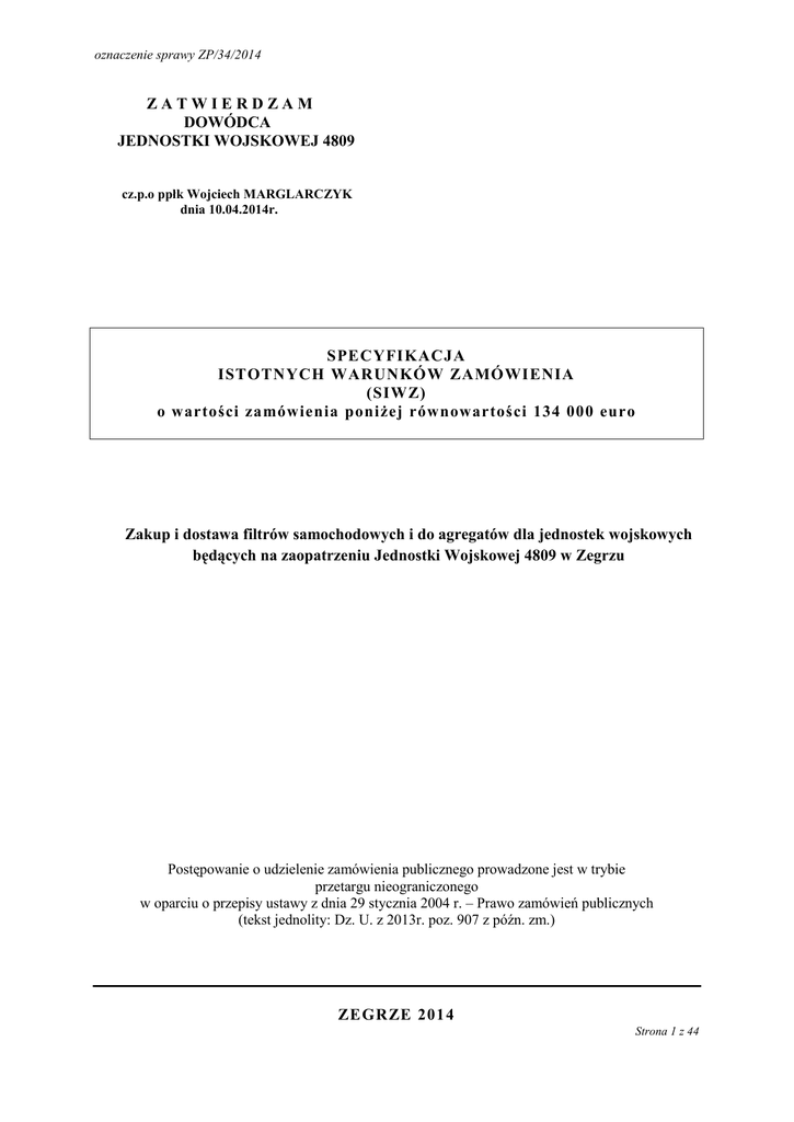 oznaczenie sprawy ZP/34/2014 ZATWIERDZAM DOWÓDCA JEDNOSTKI WOJSKOWEJ 4809 cz.p.o ppłk Wojciech MARGLARCZYK dnia 10.04.2014r. SPECYFIKACJA ISTOTNYCH WARUNKÓW ZAMÓWIENIA (SIWZ) o wartości zamówienia poniżej równowartości 134 000 euro Zakup i dostawa filtrów samochodowych i do agregatów dla jednostek wojskowych będących na zaopatrzeniu Jednostki Wojskowej 4809 w Zegrzu Postępowanie o udzielenie zamówienia publicznego prowadzone jest w trybie przetargu nieograniczonego w oparciu o przepisy ustawy z dnia 29 stycznia 2004 r. – Prawo zamówień publicznych (tekst jednolity: Dz. U. z 2013r. poz. 907 z późn. zm.) ZEGRZE 201 4 Strona 1 z 44 oznaczenie sprawy ZP/34/2014 ROZDZIAŁ I NAZWA ORAZ ADRES ZAMAWIAJĄCEGO Zamawiającym jest: JEDNOSTKA WOJSKOWA 4809 Adres: ul. Juzistek 2, 05-131 Zegrze Numer telefonu: 48 (22) 68 83 895 Numer faksu: 48 (22) 68 83 868 Adres strony internetowej: www.26wog.wp.mil.pl Godziny urzędowania: od poniedziałku do czwartku od 7 00 – 15 30 , w piątek od 7 00 – 13 00 . Godziny otwarcia Urzędu Pocztowego w Zegrzu: poniedziałek, środa, piątek – od godz. 1100 do godz. 1800 wtorek, czwartek – od godz. 0800 do godz. 1500 ROZDZIAŁ II TRYB UDZIELENIA ZAMÓWIENIA 1. Postępowanie prowadzone jest w trybie przetargu nieograniczonego na podst. art. 39-46 ustawy Prawo zamówień publicznych (tekst jednolity Dz. U. z 2013r. poz. 907 z późn. zm.), zwanej dalej ustawą Pzp, w związku z art. 10 ust. 1 ustawy Pzp, o wartości szacunkowej zamówienia poniżej równowartości 134 000 euro. 2. Postępowanie oznaczone jest numerem sprawy: ZP/34/2014. Wykonawcy we wszelkich kontaktach z Zamawiającym powinni powoływać się na ten znak. 3. Ogłoszenie zostało opublikowane w Biuletynie Zamówień Publicznych pod nr 123506-2014 w dniu 10.04.2014r. 4. Ogłoszenie zostało zamieszczone na tablicy informacyjnej w siedzibie Zamawiającego (Biuro Przepustek) oraz na stronie internetowej www.26wog.wp.mil.pl. ROZDZIAŁ III OPIS PRZEDMIOTU ZAMÓWIENIA 1. Przedmiotem zamówienia jest zakup i dostawa filtrów samochodowych i do agregatów dla jednostek wojskowych będących na zaopatrzeniu Jednostki Wojskowej 4809 w Zegrzu. Zamawiający podzielił przedmiot zamówienia na części: 1.1. Część I – filtry samochodowe, 1.2. Część II – filtry do agregatów. 2. Szczegółowy wykaz przedmiotu zamówienia zawarty został w Załączniku nr 2 i 2a do SIWZ – Formularz cenowy. 3. Towar musi odpowiadać obowiązującym normom z zakresu gatunku pierwszego. 4. Towar musi być fabrycznie nowy, nieużywany, oraz spełniać wymagania techniczno – jakościowe określone w dokumentacji technicznej producenta na dany wyrób oraz odpowiednie normy. Strona 2 z 44 oznaczenie sprawy ZP/34/2014 5. Towar musi być dostarczony w oryginalnym opakowaniu fabrycznym z zabezpieczeniami stosowanymi przez producenta. Opakowanie musi umożliwić pełną identyfikację towaru np. ilość, rodzaj, parametry, data ważności itp. bez konieczności naruszania opakowania. 6. Towar musi być dostarczony w opakowaniu zabezpieczającym przed zmianami ilościowymi i jakościowymi. 7. Wartość brutto oferowanego towaru musi obejmować wszelkie koszty związane z realizacją umowy, w tym podatek od towarów i usług VAT, inne opłaty i podatki, opłaty celne, ubezpieczenia, koszty opakowania oraz koszty dostawy (transportu) produktów do miejsca wskazanego przez Zamawiającego wraz z kosztami rozładunku. 8. W przypadku zaoferowania materiałów równoważnych (zamienników), wobec asortymentu określonego w Załączniku nr 2 i 2a do SIWZ, Wykonawca zobowiązany jest dołączyć do oferty opisy techniczne oferowanych filtrów. 9. Wykonawca zobowiązany jest do dostarczenia przedmiotu zamówienia wg producenta oraz typu określonego w złożonej ofercie. 10. Dostawa winna być zrealizowana w godzinach od 7.30 do 12.30, w dniach pracy Zamawiającego zgodnie z rozdzielnikiem stanowiącym Załącznik nr 3 (dotyczy części I) do umowy. 11. Wykonawca o planowanej dostawie powiadomi Zamawiającego, z co najmniej 2 – dniowym wyprzedzeniem (dwa dni robocze) telefonicznie lub faksem na numer ……… 12. Okres gwarancji na cały przedmiot zamówienia musi być zgodny z warunkami producenta i wynosić nie mniej niż 12 miesięcy od daty odbioru towaru, tj. od daty podpisania protokołu odbioru. 13. Szczegółowe warunki realizacji zamówienia określa projekt umowy stanowiący Załącznik nr 6 do SIWZ. 14. W prowadzonym postępowaniu Zamawiający nie dopuszcza składania ofert wariantowych, tj. ofert przewidujących odmienny niż określony w niniejszym SIWZ sposób wykonania zamówienia. 15. Oznaczenie wg Wspólnego Słownika Zamówień KOD CPV: 42913000-9 – filtry wlotu oleju, paliwa i powietrza. 16. Wykonawca może złożyć ofertę na jedną lub dwie części, przy czym w danej części może złożyć tylko jedną ofertę. ROZDZIAŁ IV TERMIN WYKONANIA ZAMÓWIENIA I MIEJSCE DOSTAWY 1. Termin realizacji zamówienia: 30 dni od dnia podpisania umowy. 2. Miejsce dostawy: 2.1. Część I (wg Rozdzielnika – Załącznik nr 3 do umowy): 2.1.1. Grupa Zabezpieczenia, 05-131 Zegrze, ul. Juzistek 2, Strona 3 z 44 oznaczenie sprawy ZP/34/2014 2.1.2. Grupa Zabezpieczenia Przasnysz 06-300 Przasnysz, ul. Makowska 1 2.1.3. Grupa Zabezpieczenia Kazuń 05-152 Kazuń, Czosnów, ul. Wojska Polskiego 1 2.1.4. Grupa Zabezpieczenia Wesoła 05-075 Warszawa – Wesoła, ul. Okuniewska 1 2.1.5. Grupa Zabezpieczenia Ostrów Mazowiecka 07-310 Ostrów Mazowiecka, Komorowo, ul. Bociańskiego 1 2.1.6. Grupa Zabezpieczenia Białobrzegi 05-127 Białobrzegi, ul. Osiedle Wojskowe 93 2.2. Część II: 2.2.1. Grupa Zabezpieczenia, 05-131 Zegrze, ul. Juzistek 2 ROZDZIAŁ V OFERTY WSPÓLNE 1. Wykonawcy mogą wspólnie ubiegać się o udzielenie zamówienia. 2. Wykonawcy składający ofertę wspólną ustanawiają pełnomocnika do reprezentowania ich w postępowaniu o udzielenie zamówienia albo do reprezentowania ich w postępowaniu i