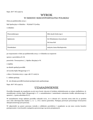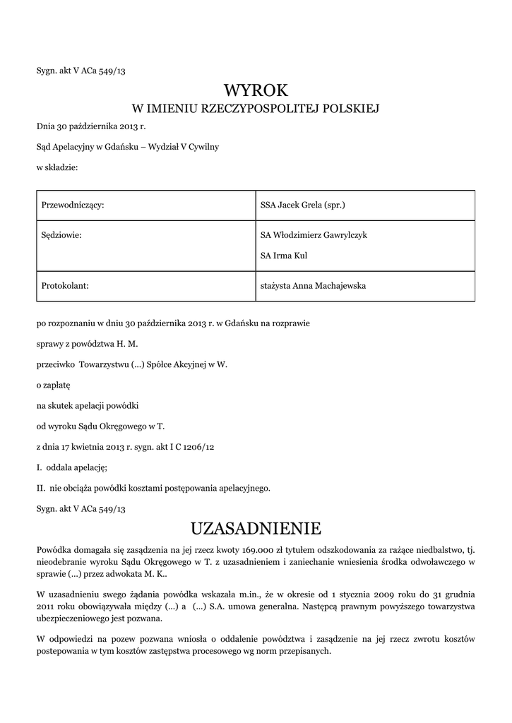 Sygn. akt V ACa 549/13 WYROK W IMIENIU RZECZYPOSPOLITEJ POLSKIEJ Dnia 30 października 2013 r. Sąd Apelacyjny w Gdańsku – Wydział V Cywilny w składzie: Przewodniczący: SSA Jacek Grela (spr.) Sędziowie: SA Włodzimierz Gawrylczyk SA Irma Kul Protokolant: stażysta Anna Machajewska po rozpoznaniu w dniu 30 października 2013 r. w Gdańsku na rozprawie sprawy z powództwa H. M. przeciwko Towarzystwu (...) Spółce Akcyjnej w W. o zapłatę na skutek apelacji powódki od wyroku Sądu Okręgowego w T. z dnia 17 kwietnia 2013 r. sygn. akt I C 1206/12 I. oddala apelację; II. nie obciąża powódki kosztami postępowania apelacyjnego. Sygn. akt V ACa 549/13 UZASADNIENIE Powódka domagała się zasądzenia na jej rzecz kwoty 169.000 zł tytułem odszkodowania za rażące niedbalstwo, tj. nieodebranie wyroku Sądu Okręgowego w T. z uzasadnieniem i zaniechanie wniesienia środka odwoławczego w sprawie (...) przez adwokata M. K.. W uzasadnieniu swego żądania powódka wskazała m.in., że w okresie od 1 stycznia 2009 roku do 31 grudnia 2011 roku obowiązywała między (...) a (...) S.A. umowa generalna. Następcą prawnym powyższego towarzystwa ubezpieczeniowego jest pozwana. W odpowiedzi na pozew pozwana wniosła o oddalenie powództwa i zasądzenie na jej rzecz zwrotu kosztów postepowania w tym kosztów zastępstwa procesowego wg norm przepisanych. W uzasadnieniu przyznała m.in., że jej poprzednika łączyła generalna umowa ubezpieczenia od odpowiedzialności cywilnoprawnej z (...)w W.. Dodała, że powódka w żaden sposób nie wykazała, aby wyrok Sądu Okręgowego w T. z dnia 13 czerwca 2011 roku w sprawie (...) był merytorycznie niesłuszny i było wysokie prawdopodobieństwo jego zmiany na korzyść powódki w przypadku skutecznego wniesienia apelacji. Na rozprawie strony podtrzymały swoje stanowiska. Wyrokiem z dnia 17 kwietnia 2013 r., zapadłym w sprawie o sygn. akt I C 1206/12, Sąd Okręgowy w T.: 1. oddalił powództwo, 2. kosztami postępowania, od uiszczenia których zwolniona była powódka, obciążył Skarb Państwa, 3. nie obciążył powódki obowiązkiem zwrotu kosztów postępowania pozwanemu. Podjęte rozstrzygnięcie, Sąd Okręgowy uzasadnił w następujący sposób: H. M. zwróciła się do Adwokata M. K., który prowadzi Kancelarię Adwokacką w Ł. o wystąpienie w jej imieniu do Sądu Okręgowego w T. przeciwko Bankowi (...) w B. o zapłatę kwoty 196.066,05 zł wraz z ustawowymi odsetkami od dnia 12 marca 2007 roku do dnia zapłaty. Pełnomocnictwa do występowania w sprawie udzieliła Adwokatowi M. K. w dniu 10 grudnia 2009 roku. Na podstawie udzielonego pełnomocnictwa M. K. wystąpił do Sądu z pozwem o wydanie nakazu zapłaty w postępowaniu upominawczym przeciwko wskazanemu bankowi. Postępowanie w sprawie zarejestrowane zostało w Sądzie Okręgowym w T. pod sygnaturą akt (...). W uzasadnieniu żądania pełnomocnik powódki wskazał, iż powódka prowadziła skup żywca i w zamian za dostarczany do Zakładów (...) spółka z o.o. otrzymywała wynagrodzenie za pośrednictwem pozwanego Banku. Od grudnia 2001 do maja 2003 roku duża część kwot należnych powódce została wypłacona na podstawie (...) dowodów wypłat. Na dowodach tych (...) podpisy powódki lub jej matki Ł. J. w rubryce otrzymałem. W przypadku 19 dowodów wypłaty ustalono, iż (...) dokonały (...) (...) G. B.. (...) dowody opiewały na kwotę dochodzoną w pozwie. Pełnomocnik powódki wskazał, iż podstawą odpowiedzialności banku jest przepis art. 120§1 k.p. w zw. z art. 415 (art. 422) k.c. Szkoda wyrządzona powódce, która nie otrzymała należnych jej pieniędzy spowodowana została przez (...), (...) Nakazem zapłaty w postępowaniu upominawczym z dnia 24 lutego 2010 roku wydanym przez Sąd Okręgowy w T. nakazano pozwanemu Bankowi (...) w B. aby zapłacił na rzecz H. M. kwotę 196.066,05 zł wraz z ustawowymi odsetkami od dnia 12 marca 2007 roku do dnia zapłaty i wraz z kosztami postepowania w wysokości 3600 zł. Sprzeciw od powyższego nakazu złożył pozwany Bank (...) w B. i zażądał oddalenia powództwa i zasądzenia na jego rzecz zwrotu kosztów postępowania w tym kosztów zastępstwa procesowego. W uzasadnieniu pełnomocnik pozwanego wskazał, iż powódka powołała się na orzeczenie wydane przez Sąd Rejonowy w B. w sprawie karnej (...). Tymczasem w sprawie wydane zostało także inne orzeczenie, w którym prawomocnie stwierdzono niepopełnienie przestępstwa (...). Twierdzenia powódki, iż od grudnia 2001 roku do maja 2003 roku duża część kwot należnych pani M. nie dotarła do powódki jest całkowicie nieuzasadniona. Zebrany przez Prokuraturę Rejonową w B. materiał dowodowy w postaci wydruków operacji na kontach bankowych Ł. J. i jej córki H. M. potwierdził, iż pieniądze były przekazywane na konto bankowe H. M. i Ł. J. i nie zostały przywłaszczone przez inne osoby. Na rozprawie w dniu 29 lipca 2010 roku pełnomocnik powódki cofnął pozew w zakresie kwoty 26.076,72 zł. Na rozprawie tej pełnomocnik pozwanego banku podniósł zarzut przedawnienia roszczenia. Postanowieniem z dnia 13 sierpnia 2010 roku Sąd Okręgowy w T. w sprawie (...) uznał zarzut przedawnienia za usprawiedliwiony co do zasady. Odpis postanowienia wraz z uzasadnieniem przesłano do pełnomocnika powódki. Żadna ze stron postępowania nie złożyła zażalenia na powyższe postanowienie. Wyrokiem z dnia 13 czerwca 2011 roku Sąd Okręgowy w T. oddalił powództwo H. M. przeciwko Bankowi (...) w B. o zapłatę i nie obciążył powódki kosztami zastępstwa procesowego pozwanego. Na publikacji orzeczenia nie stawili się ani pełnomocnik powódki ani powódka. W dniu 15 czerwca 2011 roku pełnomocnik powódki Adwokat M. K. wysłał do Sądu wniosek o sporządzenie i doręczenie mu odpisu wyroku Sądu Okręgowego z dnia 13 czerwca 2011 roku w sprawie (...) wraz z pisemnym uzasadnieniem. Wniosek wpłynął do Sądu Okręgowego w T. w dniu 20 czerwca 2011 