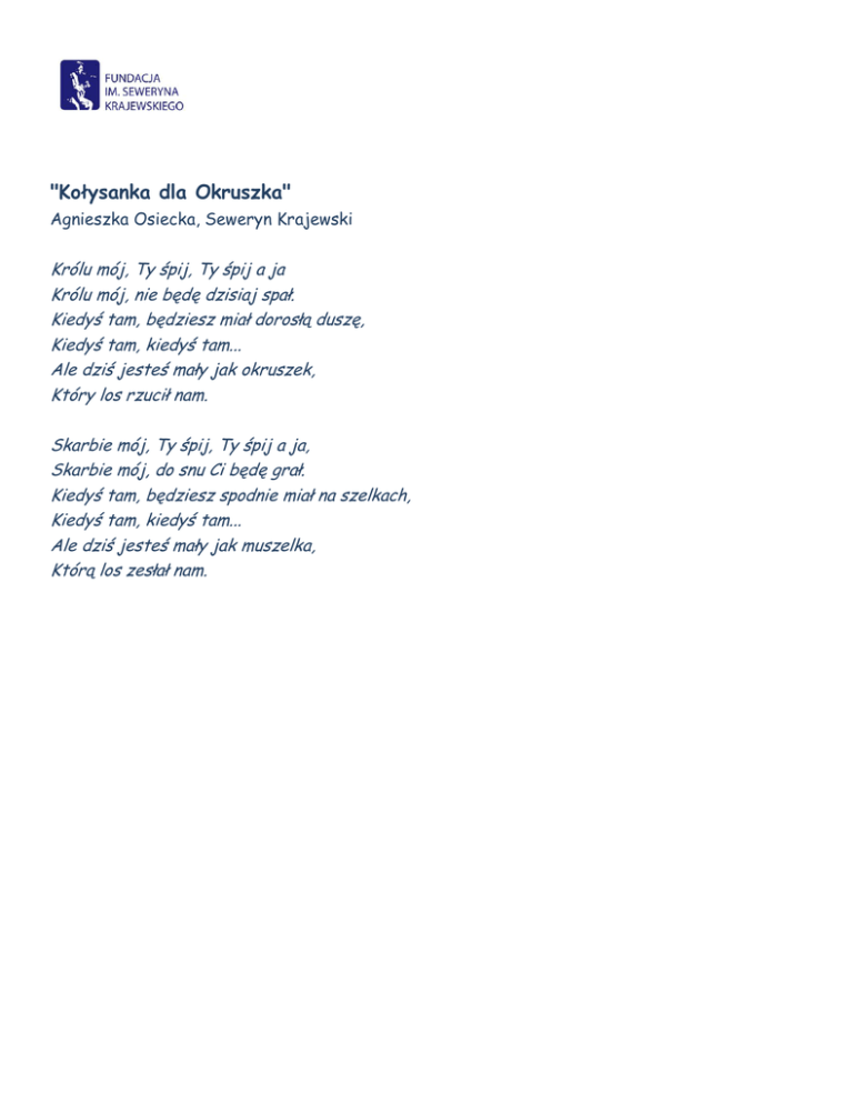 "Kołysanka dla Okruszka" Agnieszka Osiecka, Seweryn Krajewski Królu mój, Ty śpij, Ty śpij a ja Królu mój, nie będę dzisiaj spał. Kiedyś tam, będziesz miał dorosłą duszę, Kiedyś tam, kiedyś tam... Ale dziś jesteś mały jak okruszek, Który los rzucił nam. Skarbie mój, Ty śpij, Ty śpij a ja, Skarbie mój, do snu Ci będę grał. Kiedyś tam, będziesz spodnie miał na szelkach, Kiedyś tam, kiedyś tam... Ale dziś jesteś mały jak muszelka, Którą los zesłał nam.