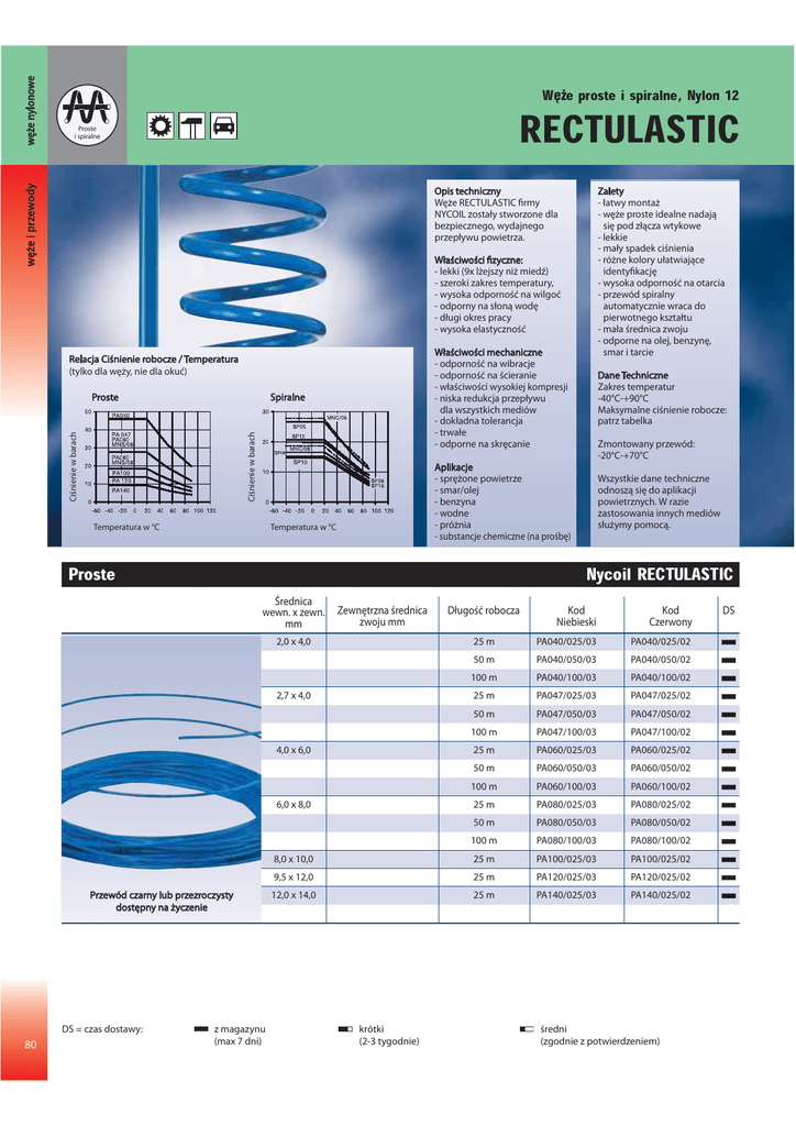 RECTULASTIC Proste i spiralne węże i przewody węże nylonowe Wõēe proste i spiralne, Nylon 12 Opis techniczny Węże RECTULASTIC firmy NYCOIL zostały stworzone dla bezpiecznego, wydajnego przepływu powietrza. Właściwości fizyczne: - lekki (9x lżejszy niż miedź) - szeroki zakres temperatury, - wysoka odporność na wilgoć - odporny na słoną wodę - długi okres pracy - wysoka elastyczność Właściwości mechaniczne - odporność na wibracje - odporność na ścieranie - właściwości wysokiej kompresji - niska redukcja przepływu dla wszystkich mediów - dokładna tolerancja - trwałe - odporne na skręcanie Relacja Ciśnienie robocze / Temperatura (tylko dla węży, nie dla okuć) Ciśnienie w barach Spiralne Ciśnienie w barach Proste Temperatura w °C Temperatura w °C Zmontowany przewód: -20°C-+70°C Wszystkie dane techniczne odnoszą się do aplikacji powietrznych. W razie zastosowania innych mediów służymy pomocą. Nycoil RECTULASTIC Średnica wewn. x zewn. mm Zewnętrzna średnica zwoju mm 2,0 x 4,0 2,7 x 4,0 4,0 x 6,0 6,0 x 8,0 Przewód czarny lub przezroczysty dostępny na życzenie DS = czas dostawy: Dane Techniczne Zakres temperatur -40°C-+90°C Maksymalne ciśnienie robocze: patrz tabelka Aplikacje - sprężone powietrze - smar/olej - benzyna - wodne - próżnia - substancje chemiczne (na prośbę) Proste 80 Zalety - łatwy montaż - węże proste idealne nadają się pod złącza wtykowe - lekkie - mały spadek ciśnienia - różne kolory ułatwiające identyfikację - wysoka odporność na otarcia - przewód spiralny automatycznie wraca do pierwotnego kształtu - mała średnica zwoju - odporne na olej, benzynę, smar i tarcie z magazynu (max 7 dni) Długość robocza Kod Niebieski Kod Czerwony 25 m PA040/025/03 PA040/025/02 PA040/050/02 50 m PA040/050/03 100 m PA040/100/03 PA040/100/02 25 m PA047/025/03 PA047/025/02 PA047/050/02 50 m PA047/050/03 100 m PA047/100/03 PA047/100/02 25 m PA060/025/03 PA060/025/02 50 m PA060/050/03 PA060/050/02 100 m PA060/100/03 PA060/100/02 25 m PA080/025/03 PA080/025/02 50 m PA080/050/03 PA080/050/02 100 m PA080/100/03 PA080/100/02 8,0 x 10,0 25 m PA100/025/03 PA100/025/02 9,5 x 12,0 25 m PA120/025/03 PA120/025/02 12,0 x 14,0 25 m PA140/025/03 PA140/025/02 krótki (2-3 tygodnie) średni (zgodnie z potwierdzeniem) DS