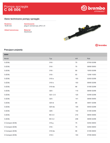 Pompa sprzęgła C 06 006 Dane techniczne pompy sprzęgła Średnica 19,05 mm Gwintowanie plug-in connect.sys.,Ø12 x 9 Układ hamulcowy Materiał Aluminium Pasujące pojazdy BMW Model Typ kW Rok 3 (E36) 316 i 75 07/93 02/98 3 (E36) 316 i 75 09/90 09/93 3 (E36) 318 i 85 10/93 02/98 3 (E36) 318 i 83 12/90 10/93 3 (E36) 318 is 103 03/93 02/98 3 (E36) 318 is 103 09/95 02/98 3 (E36) 318 tds 66 01/95 02/98 3 (E36) 320 i 110 09/90 02/98 3 (E36) 323 i 2.5 125 03/95 02/98 3 (E36) 325 i 141 09/90 09/95 3 (E36) 325 td 85 09/91 02/98 3 (E36) 325 tds 105 05/93 02/98 3 (E36) 328 i 142 01/95 02/98 3 (E36) M3 3.0 210 08/94 09/95 3 (E36) M3 3.2 236 09/95 02/98 3 Compact (E36) 316 g 75 03/94 08/00 3 Compact (E36) 316 i 75 03/94 08/00 3 Compact (E36) 318 tds 66 01/95 08/00 3 Compact (E36) 318 ti 103 07/95 08/00 3 Compact (E36) 318 ti 103 11/94 08/95 3 Compact (E36) 323 ti 125 08/97 08/00 3 Convertible (E36) 318 i 85 01/94 04/99 3 Convertible (E36) 320 i 110 12/93 04/99 3 Convertible (E36) 323 i 125 06/95 04/99 3 Convertible (E36) 325 i 141 03/93 03/95 3 Convertible (E36) 328 i 142 03/95 04/99 3 Convertible (E36) M3 3.0 210 01/94 10/95 3 Convertible (E36) M3 3.2 236 10/95 04/99 3 Coupe (E36) 316 i 75 09/93 04/99 3 Coupe (E36) 318 is 103 03/92 10/95 3 Coupe (E36) 318 is 103 09/95 04/99 3 Coupe (E36) 320 i 110 03/92 04/99 3 Coupe (E36) 323 i 125 03/95 04/99 3 Coupe (E36) 325 i 141 03/92 04/99 3 Coupe (E36) 328 i 142 01/95 04/99 3 Coupe (E36) M3 3.0 217 01/95 10/95 3 Coupe (E36) M3 3.0 210 10/92 01/95 3 Coupe (E36) M3 3.2 236 10/95 04/99 3 Touring (E36) 316 i 75 01/96 10/99 3 Touring (E36) 318 i 85 07/95 10/99 3 Touring (E36) 318 tds 66 01/95 10/99 3 Touring (E36) 320 i 110 01/95 10/99 3 Touring (E36) 323 i 125 09/95 10/99 3 Touring (E36) 325 tds 105 01/95 10/99 3 Touring (E36) 328 i 142 01/95 10/99 Z3 (E36) 1.8 i 85 10/95 10/98 Z3 (E36) 1.9 i 85 01/99 01/03 Z3 (E36) 1.9 i 87 07/98 01/03 Z3 (E36) 1.9 i 103 10/95 03/99 Z3 (E36) 2.0 i 110 04/99 01/03 Z3 (E36) 2.2 i 125 08/00 01/03 Z3 (E36) 2.8 i 141 04/97 06/00 Z3 (E36) 3.0 i 170 06/00 01/03 Z3 (E36) M 3.2 236 03/97 06/01 Z3 (E36) M 3.2 239 06/01 01/03 Z3 Coupe (E36) 2.8 i 141 07/97 06/00 Z3 Coupe (E36) 3.0 i 170 06/00 06/03 Z3 Coupe (E36) M 236 02/98 06/01 Z3 Coupe (E36) M 239 06/01 06/03 Numery OE Pasujące kody OE BMW 1159031 BMW 1162303 BMW 1163900 BMW 21521159031 BMW 21521162303 BMW 21526758829 BMW 6758820 BMW 6758829