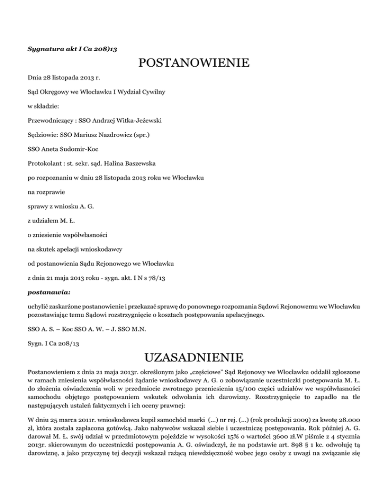 Sygnatura akt I Ca 208)13 POSTANOWIENIE Dnia 28 listopada 2013 r. Sąd Okręgowy we Włocławku I Wydział Cywilny w składzie: Przewodniczący : SSO Andrzej Witka-Jeżewski Sędziowie: SSO Mariusz Nazdrowicz (spr.) SSO Aneta Sudomir-Koc Protokolant : st. sekr. sąd. Halina Baszewska po rozpoznaniu w dniu 28 listopada 2013 roku we Włocławku na rozprawie sprawy z wniosku A. G. z udziałem M. Ł. o zniesienie współwłasności na skutek apelacji wnioskodawcy od postanowienia Sądu Rejonowego we Włocławku z dnia 21 maja 2013 roku - sygn. akt. I N s 78/13 postanawia: uchylić zaskarżone postanowienie i przekazać sprawę do ponownego rozpoznania Sądowi Rejonowemu we Włocławku pozostawiając temu Sądowi rozstrzygnięcie o kosztach postępowania apelacyjnego. SSO A. S. – Koc SSO A. W. – J. SSO M.N. Sygn. I Ca 208/13 UZASADNIENIE Postanowieniem z dnia 21 maja 2013r. określonym jako „częściowe” Sąd Rejonowy we Włocławku oddalił zgłoszone w ramach zniesienia współwłasności żądanie wnioskodawcy A. G. o zobowiązanie uczestniczki postępowania M. Ł. do złożenia oświadczenia woli w przedmiocie zwrotnego przeniesienia 15/100 części udziałów we współwłasności samochodu objętego postępowaniem wskutek odwołania ich darowizny. Rozstrzygnięcie to zapadło na tle następujących ustaleń faktycznych i ich oceny prawnej: W dniu 25 marca 2011r. wnioskodawca kupił samochód marki (...) nr rej. (...) (rok produkcji 2009) za kwotę 28.000 zł, która została zapłacona gotówką. Jako nabywców wskazał siebie i uczestniczę postępowania. Rok później A. G. darował M. Ł. swój udział w przedmiotowym pojeździe w wysokości 15% o wartości 3600 zł.W piśmie z 4 stycznia 2013r. skierowanym do uczestniczki postępowania A. G. oświadczył, że na podstawie art. 898 § 1 kc. odwołuję tą darowiznę, a jako przyczynę tej decyzji wskazał rażącą niewdzięczność wobec jego osoby z uwagi na związanie się partnerki z innym mężczyzną, pomimo pozostawania w związku konkubenckim z darczyńcą. W stosunku do M. Ł. toczy się obecnie postępowanie przygotowawcze i jest ona podejrzana o to, że w dniu 1 kwietnia 2011r. we W. posłużyła się jako autentycznym dokumentem zaadresowanym do Starostwa Powiatowego we W., a zawierającym pełnomocnictwo udzielone jej przez wnioskodawcę w dniu 31 marca 2011r. do rejestracji samochodu (...), który to sporządziła i podrobiła na nim podpis A. G. tj. o czyn z art. 270 § 1 kk. Dokonując powyższych ustaleń Sąd I instancji podkreślił, że nie było konieczności prowadzenia postępowania dowodowego (poza dowodami z dokumentów), bowiem oceny zasadności żądania można było dokonać nawet przy założeniu, że twierdzenia wnioskodawcy są zgodne z rzeczywistością. Nawet bowiem przyjmując, że strony pozostawały w konkubinacie to zachowanie uczestniczki postępowania – wskazane jako podstawa odwołania darowizny – nie cechuje się „rażącą niewdzięcznością” w rozumieniu art. 898 § 1 kc. Zarzucane jej postępowanie (sugerowane zerwanie związku z wnioskodawcą i związanie się z innym mężczyzną) mieści się w ramach życiowych konfliktów, które nie uzasadniają odwołania darowizny. Nie miała ona żadnego prawnego ani nawet moralnego obowiązku pozostawania z A. G. w jakimkolwiek związku. Darczyńca może spodziewać się po obdarowanym okazania wdzięczności czy spełnienia oczekiwań, ale nie wszystkich. Obdarowany może samodzielnie, bez nacisków i wpływów osób trzecich decydować o swoim życiu, a w szczególności gdzie i z kim chce je spędzić. Zakończenie związku konkubenckiego z woli jednej z jego stron trudno uznać więc za zachowanie nieetyczne i mogące być ocenione jako wyjątkowo naganne. Sąd a quo podkreślił jednocześnie, że oceniając przesłanki odwołania darowizny jest związany przyczyną wskazaną w odwołaniu darowizny, co wyklucza dokonywanie ustaleń i ocen pod kątem innych czynów, które ewentualnie wypełniałyby znamiona rażącej niewdzięczności. Prawną podstawą orzeczenia był przepis art. 898 § 1 kc „ a contrario” , a w płaszczyźnie procesowej art. 361 kpc w zw. z art. 317 § 1 kpc. Apelację od powyższego postanowienia wniósł wnioskodawca zarzucając naruszenie prawa materialnego tj. art. 898 § 1 kc poprzez jego błędną wykładnię wskutek przyjęcia, iż związanie się przed jednego z konkubentów z innym partnerem w trakcie trwania związku z dotychczasowym nie stanowi rażącej niewdzięczności i w konsekwencji nierozpoznanie istoty sprawy, brak przeprowadzenia postępowania dowodowego i niedokonania ustaleń w przedmiocie rudymentarnych dla rozstrzygnięcia sprawy okoliczności. Powołując się na powyższe skarżący wniósł o uchylenie kwestionowanego postanowienia i przekazanie sprawy do ponownego rozpoznania względnie o jego zmianę i zobowiązanie wnioskodawczyni do złożenia oświadczenia woli o treści zgodnej z wnioskiem przy uwzględnieniu kosztów postępowania apelacyjnego. Uczestniczka postępowania nie zajęła stanowiska odnoście złożonego środka odwoławczego. Sąd Okręgowy zważył co następuje: Apelacji nie sposób odmówić słuszności. W orzecznictwie za ugruntowany można przyjąć pogląd, że ocena, czy określone fakty mają dla rozstrzygnięcia sprawy istotne znaczenie zależy nie tylko od tego, jakie są to fakty, lecz także – a nawet w pierwszej kolejności – od tego, jak sformułowana i rozumiana jest norma prawna, która w rozstrzyganej sprawie została zastosowana (przykładowo postanowienie Sądu Najwyższego z 10 lutego 2012r. II CSK 357/11 nie publ., LEX nr 1133804, wyroki tego Sądu: z 27 stycznia 2011r. I CSK 237/10 nie publ.; LEX nr 784987 i z 26 lipca 2000r. I CKN 975/98 nie publ., LEX 50825, wyrok Sądu Apelacyjnego w Łodzi z 18 lipca 2013r. I ACa 230/13 nie publ.. LEX nr 1349960). Inaczej mówiąc stan faktyczny w każdej sprawie jest oceniany w aspekcie prze