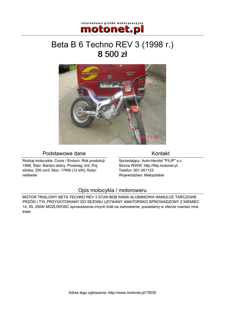 Beta B 6 Techno REV 3 (1998 r.) 8 500 zł Podstawowe dane Rodzaj motocykla: Cross / Enduro, Rok produkcji: 1998, Stan: Bardzo dobry, Przebieg: b/d, Poj. silnika: 250 cm3, Moc: 17KM (12 kW), Kolor: niebieski Kontakt Sprzedający: Auto-Handel ''FILIP'' s.c. Strona WWW: http://filip.motonet.pl Telefon: 501 451133 Województwo: Małopolskie Opis motocykla / motoroweru MOTOR TRIALOWY BETA TECHNO REV 3 STAN BDB RAMA ALUMINIOWA HAMULCE TARCZOWE PRZÓD I TYŁ PRZYGOTOWANY DO SEZONU UZYWANY AMATORSKO SPROWADZONY Z NIEMIEC 14, 05, 2004r MOZLIWOSC sprowadzenia innych triali na zamowienie, posiadamy w ofercie rowniez inne triale Adres tego ogłoszenia: http://www.motonet.pl/?3035