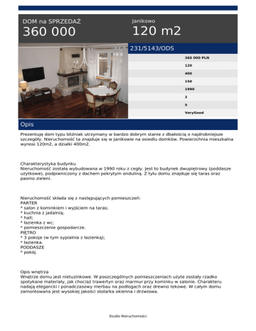 DOM na SPRZEDAŻ 360 000 Janikowo 120 m2 231/5143/ODS 360 000 PLN 120 400 150 1990 2 5 VeryGood Opis Prezentuję dom typu bliźniak utrzymany w bardzo dobrym stanie z dbałością o najdrobniejsze szczegóły. Nieruchomość ta znajduje się w Janikowie na osiedlu domków. Powierzchnia mieszkalna wynosi 120m2, a działki 400m2. Charakterystyka budynku Nieruchomość została wybudowana w 1990 roku z cegły. Jest to budynek dwupiętrowy (poddasze użytkowe), podpiwniczony z dachem pokrytym onduliną. Z tyłu domu znajduje się taras oraz pasmo zieleni. Nieruchomość składa się z następujących pomieszczeń: PARTER * salon z kominkiem i wyjściem na taras; * kuchnia z jadalnią; * hall; * łazienka z wc; * pomieszczenie gospodarcze. PIĘTRO * 3 pokoje (w tym sypialnia z łazienką); * łazienka. PODDASZE * pokój. Opis wnętrza Wnętrze domu jest nietuzinkowe. W poszczególnych pomieszczeniach użyte zostały rzadko spotykane materiały, jak chociaż trawertyn oraz marmur przy kominku w salonie. Charakteru nadają elegancki i ponadczasowy merbau na podłogach oraz drewno tekowe. W całym domu zamontowana jest wysokiej jakości stolarka okienna i drzwiowa. Studio Nieruchomości Lokalizacja Nieruchomość mieści się na osiedlu domków jednorodzinnych w Janikowie, w niewielkiej odległości od centrum miasta. Co ważne, dookoła panuje cisza i spokój. Dom jest ogrodzony, a działka, na której jest posadowiony zagospodarowana. Dopełnieniem tego jest widok na pobliskie jezioro. Dostępne media: * prąd; * ogrzewanie: ekogroszek, gazowe oraz kominkowe; * kanalizacja miejska; * miejska woda. Dodatkowe informacje Pod budynkiem znajduje się garaż. W cenie nieruchomości pozostaje część wyposażenia, w tym zabudowa kuchni wraz ze sprzętem AGD, szafy wnękowe oraz wyposażenie łazienek. Ta nieruchomość może być Twoja za cenę 360.000 zł (cena do negocjacji). Wszystkich zainteresowanych zachęcam już dziś do zobaczenia domu, ponieważ zdjęcia nie oddają walorów tego miejsca. Więcej naszych ofert znajdziecie na stronie www.studio-nieruchomosci.com tel. 502 908 680 email: [email protected] Studio Nieruchomości Powered by TCPDF (www.tcpdf.org)