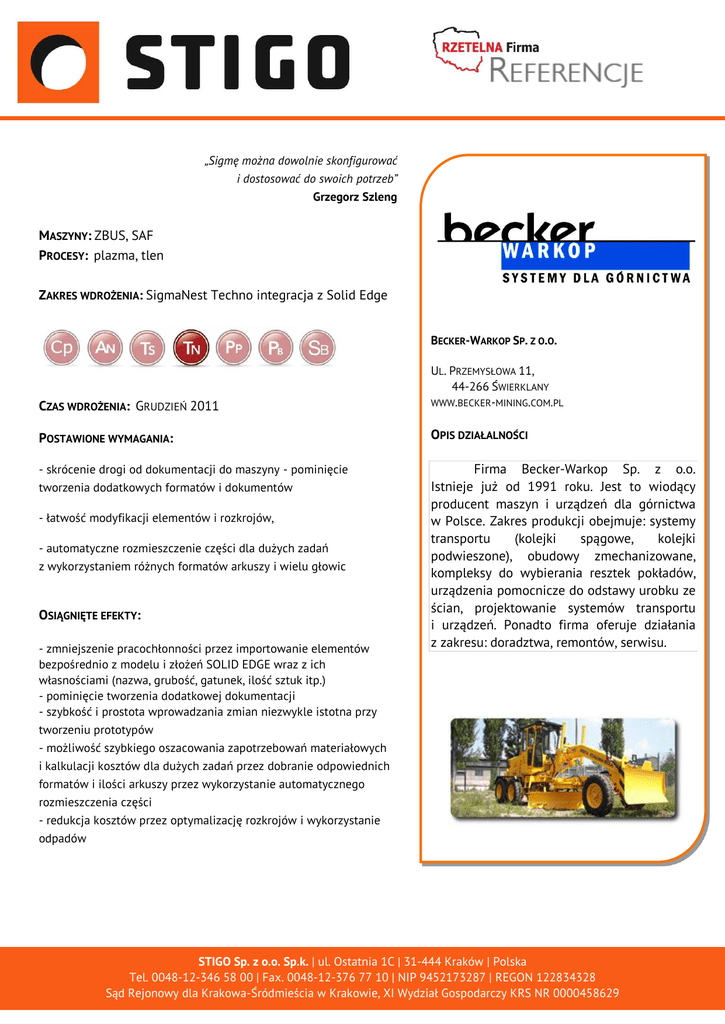 „Sigmę można dowolnie skonfigurować i dostosować do swoich potrzeb” Grzegorz Szleng MASZYNY: ZBUS, SAF PROCESY: plazma, tlen ZAKRES WDROŻENIA: SigmaNest Techno integracja z Solid Edge BECKER-WARKOP SP. Z O.O. CZAS WDROŻENIA: GRUDZIEŃ 2011 UL. PRZEMYSŁOWA 11, 44-266 ŚWIERKLANY WWW.BECKER-MINING.COM.PL POSTAWIONE WYMAGANIA: OPIS DZIAŁALNOŚCI - skrócenie drogi od dokumentacji do maszyny - pominięcie tworzenia dodatkowych formatów i dokumentów Firma Becker-Warkop Sp. z o.o. Istnieje już od 1991 roku. Jest to wiodący producent maszyn i urządzeń dla górnictwa w Polsce. Zakres produkcji obejmuje: systemy transportu (kolejki spągowe, kolejki podwieszone), obudowy zmechanizowane, kompleksy do wybierania resztek pokładów, urządzenia pomocnicze do odstawy urobku ze ścian, projektowanie systemów transportu i urządzeń. Ponadto firma oferuje działania z zakresu: doradztwa, remontów, serwisu. - łatwość modyfikacji elementów i rozkrojów, - automatyczne rozmieszczenie części dla dużych zadań z wykorzystaniem różnych formatów arkuszy i wielu głowic OSIĄGNIĘTE EFEKTY: - zmniejszenie pracochłonności przez importowanie elementów bezpośrednio z modelu i złożeń SOLID EDGE wraz z ich własnościami (nazwa, grubość, gatunek, ilość sztuk itp.) - pominięcie tworzenia dodatkowej dokumentacji - szybkość i prostota wprowadzania zmian niezwykle istotna przy tworzeniu prototypów - możliwość szybkiego oszacowania zapotrzebowań materiałowych i kalkulacji kosztów dla dużych zadań przez dobranie odpowiednich formatów i ilości arkuszy przez wykorzystanie automatycznego rozmieszczenia części - redukcja kosztów przez optymalizację rozkrojów i wykorzystanie odpadów STIGO Sp. z o.o. Sp.k. | ul. Ostatnia 1C | 31-444 Kraków | Polska Tel. 0048-12-346 58 00 | Fax. 0048-12-376 77 10 | NIP 9452173287 | REGON 122834328 Sąd Rejonowy dla Krakowa-Śródmieścia w Krakowie, XI Wydział Gospodarczy KRS NR 0000458629 [email protected] | www.stigo.com.pl