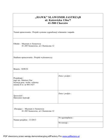 „HAWK” SŁAWOMIR JASTRZĄB ul. Katowicka 136a/7 41-500 Chorzów Temat opracowania : Projekt systemu sygnalizacji włamania i napadu Obiekt : Muzeum w Sosnowcu 41-205 Sosnowiec, ul. Chemiczna 12 Stadium opracowania : Projekt wykonawczy Branża : SSWiN Data i podpis : Projektant : mgr inż. Mariusz Gac licencja prac. techn. ochrony mienia II st. nr 0011427 Data i podpis : Sprawdził : Sławomir Jastrząb Zlecający : Muzeum w Sosnowcu 41-205 Sosnowiec, ul. Chemiczna 12 Nr egzemplarza : Numer projektu : 13/2013 Nr rewizji : PDF stworzony przez wersję demonstracyjną pdfFactory Pro www.pdffactory.pl Oświadczenie Dokumentacja projektowa jest wykonana zgodnie z umową, obowiązującymi przepisami, normami i zasadami wiedzy technicznej, a w swej formie jest kompletna z punktu widzenia celu, któremu ma służyć i nie narusza praw autorskich osób trzecich. PDF stworzony przez wersję demonstracyjną pdfFactory Pro www.pdffactory.pl Spis treści 1. Strona tytułowa 2. Przedmiot i podstawa opracowania 3. Zakres opracowania 4. Dobór systemu 5. Miejsca instalacji elementów systemu 6. Instalacja przewodowa 7. Warunki eksploatacji systemu i wytyczne 8. Zestawienie urządzeń 9. Informacja BIOZ Załączniki: - Notatka służbowa - Licencja pracownika zabezpieczenia technicznego drugiego stopnia, - Zaświadczenie o ukończeniu kursu PISA, - Zaświadczenie o ukończeniu kursu dla projektantów systemów zabezpieczających organizowany przez Narodowy Instytut Muzealnictwa i Ochrony Zabytków. Spis rysunków: 1. 2. 3. 4. 5. System sygnalizacji włamania i napadu – rzut piwnic System sygnalizacji włamania i napadu – rzut parteru System sygnalizacji włamania i napadu – rzut I piętra System sygnalizacji włamania i napadu – rzut poddasza System sygnalizacji włamania i napadu – schemat blokowy rysunek nr : 1 rysunek nr : 2 rysunek nr : 3 rysunek nr : 4 rysunek nr : 5 2. Przedmiot i podstawa opracowania Przedmiotem opracowania jest projekt wykonawczy systemu sygnalizacji włamania i napadu (SSWIN) dla Muzeum w Sosnowcu zlokalizowanego przy ul. Chemicznej 12. Przeznaczeniem systemu będzie ochrona życia lub mienia albo obu tych wartości. Podstawą wykonania projektu jest: - zlecenie na wykonawstwo projektu, - projekt instalacji antywłamaniowej opracowany przez FRUH ”Jupiter” (07.1995r.), - podkłady budowlane otrzymane od inwestora, - wizja lokalna obiektu, bieżące uzgodnienia, - karty katalogowe urządzeń, - normy i przepisy branżowe. Założenia projektowe oraz wymagania określone przez Inwestora, dotyczące zaprojektowania i wykonania systemu są następujące: - ochroną przeciwwłamaniową należy objąć poszczególne pomieszczenia przedstawione w części rysunkowej, PDF stworzony przez wersję demonstracyjną pdfFactory Pro www.pdffactory.pl - w zakresie detekcji zagrożenia włamaniowego projektowany system wykorzystywał będzie punktowe czujki PIR i czujki magnetyczne (kontaktrony) na wybranych drzwiach, - rezygnacja z montażu czujek magnetycznych (kontaktronów) na oknach, - przewody instalacji SSWiN układane będą podtynkowo, - alarm włamaniowy rozgłaszany będzie za pomocą sygnalizatorów akustyczno-optycznych, montowanych we wskazanych miejscach w części rysunkowej. Warunki ogólne Wykonawca jest zobowiązany do wykonania kompletnych instalacji opisanych w niniejszym projekcie wykonawczym. Wykonawca jest zobowiązany do zrealizowania brakujących i pominiętych w niniejszym opracowaniu elementów instalacji wraz z dostarczeniem koniecznych materiałów i urządzeń dla kompletnego wykonania instalacji. Rysunki i część opisowa są w dokumentacji wzajemnie uzupełniającymi się. Wszystkie elementy ujęte w części opisowej, a nie pokazane na rysunkach oraz pokazane na rysunkach, a nie ujęte w opisie winny być traktowane jakby były ujęte w obu. Założenia ogólne Przyjęto, iż podczas normalnej pracy (otwarcia) Muzeum większa część systemu będzie wyłączona z dozorowania. Uwzględniając lokalizację i przeznaczenie obiektu, jego najbliższe otoczenie, charakterystykę architektoniczną, układ komunikacji wewnętrznej oraz układ funkcjonalny pomieszczeń należy przyjąć, że możliwymi zagrożeniami mogą być: włamanie od strony czynnej części obiektu, włamanie od strony pomieszczeń technicznych, kradzież mienia przez osoby, które ukryły się w obiekcie, kradzież eksponatów, akty wandalizmu. W związku z powyższym obiekt został wyposażony w system sygnalizacji włamania i napadu ułatwiający ochronie fizycznej nadzór nad bezpieczeństwem całości obiektu. System sygnalizacji włamania zapewnia: - ochronę każdej z wydzielonych funkcjonalnie stref, - kontrolę sal wystawowych, - możliwość wezwania pomocy przez pracowników (ochronę) muzeum (radiowe przyciski antynapadowe). Dla umożliwienia spełnienia założeń funkcjonalnych system sygnalizacji włamania i napadu został podzielony na strefy dozorowe. Strefy dozorowe w budynku podzielono w taki sposób aby umożliwić niezależną pracę poszczególnych jego części. Biorąc pod uwagę funkcjonowanie przyjęto następujący podział obiektu: Strefa A: restauracja-piwnica Strefa B: wymiennikownia i węzeł cieplny-piwnica Strefa C: pomieszczenia na parterze Strefa D: WC na parterze Strefa E: wybrane sale wystawowe na I piętrze (33-36) Strefa F: wybrane sale wystawowe na I piętrze (29,30) Strefa G: sala audiowizualna na I piętrze (39) Strefa H: pozostałe pomieszczenia na I piętrze Strefa I: magazyn (56) na poddaszu Strefa J: magazyny (59) na poddaszu Strefa K: biuro (67) na poddaszu Strefa L: pokój gościnny (76) i korytarz (65) na poddaszu Strefa M: pozostałe pomieszczenia i korytarze na poddaszu Włączenie lub wyłączenie dozorowania w w/w strefach jest możliwe wyłącznie dla osoby uprawnionej z poziomu klawiatury strefowej lub manipulatora. W budynku istnieje stała ochrona fizyczna zapewniającą wykrywanie i zapobieganie aktom wandalizmu oraz kradz