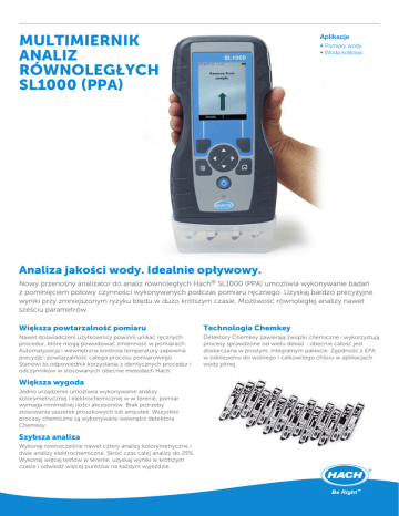 MULTIMIERNIK ANALIZ RÓWNOLEGŁYCH SL1000 (PPA) Aplikacje • Pomiary wody • Woda kotłowa Analiza jakości wody. Idealnie opływowy. Nowy przenośny analizator do analiz równoległych Hach® SL1000 (PPA) umożliwia wykonywanie badań z pominięciem połowy czynności wykonywanych podczas pomiaru ręcznego. Uzyskaj bardzo precyzyjne wyniki przy zmniejszonym ryzyku błędu w dużo krótszym czasie. Możliwość równoległej analizy nawet sześciu parametrów. Większa powtarzalność pomiaru Technologia Chemkey Nawet doświadczeni użytkownicy powinni unikać ręcznych procedur, które mogą powodować zmienność w pomiarach. Automatyzacja i wewnętrzna kontrola temperatury zapewnia precyzję i powtarzalność całego procesu pomiarowego. Stanowi to odpowiednik korzystania z identycznych procedur i odczynników w stosowanych obecnie metodach Hach. Detektory Chemkey zawierają związki chemiczne i wykorzystują procesy sprawdzone od wielu dekad - obecnie całość jest dostarczana w prostym, integralnym pakiecie. Zgodność z EPA w odniesieniu do wolnego i całkowitego chloru w aplikacjach wody pitnej. Większa wygoda Jedno urządzenie umożliwia wykonywanie analizy kolorymetrycznej i elektrochemicznej w w terenie, pomiar wymaga minimalnej ilości akcesoriów. Brak potrzeby stosowania saszetek proszkowych lub ampułek. Wszystkie procesy chemiczne są wykonywane wewnątrz detektora Chemkey. Szybsza analiza Wykonaj równocześnie nawet cztery analizy kolorymetryczne i dwie analizy elektrochemiczne. Skróć czas całej analizy do 25%. Wykonaj więcej testów w terenie, uzyskaj wyniki w krótszym czasie i odwiedź więcej punktów na każdym wyjeździe. 2 Multimiernik analiz równoległych SL1000 (PPA) Dane techniczne* Rodzaj baterii Akumulator litowo-jonowy Czas pracy baterii >200 Chemkey (na pełną baterię) Zakres temperatury pracy 5 - 50 °C / maksymalna wilgotność względna 85% (bez skroplin) Certyfikaty Certyfikat CE Klasa ochrony III Detektor Fotodioda silikonowa Wymiary (Wys. x Szer. x Głęb.) 258,3 mm x 130,8 mm x 58,9 mm Warunki przechowywania -20 - 60 °C / maksymalna wilgotność względna 85% (bez skroplin) Stopień ochrony IP64 Interfejs Mini USB Waga 1,2 kg Transmitancja (%), Absorbancja (Abs), Koncentracja (Conc) Gwarancja 2 lata Tryby pomiarowe *Może ulec zmianie bez powiadomienia. Informacje do zamówień LPV443.99.10002 Przenośny wieloparametrowy miernik SL1000 (PPA) Komplet zawiera: miernik SL1000, walizka, 1 pojemnik na próbki, 2 pojemniki na próbki z elektrodą, akumulator, ładowarkę do akumulatora, uchwyt do przenoszenia, instrukcję obsługi i kabel USB. LPV443.99.20002 Pełny zestaw przenośnego analizatora PPA SL1000 Zestaw zawiera: komplet miernika SL1000, 1 elektrodę pH, 1 elektrodę konduktometryczną oraz 1 opakowanie odczynników Chemkey do wykrywania wolnego chloru, chloru całkowitego, monochloraminy, azotynów i wolnego amoniaku. Odczynniki Chemkey 8636200 Chemkey do badania całkowitej alkaliczności, niski zakres (op. 25 sztuk) 8636400 Chemkey do badania twardości, niski zakres (op. 25 sztuk) 8636500 Chemkey do badania ortofosforanów, wysoki zakres (op. 25 sztuk) 8636600 Chemkey do badania ortofosforanów, niski zakres (op. 25 sztuk) Akcesoria opcjonalne 9427900 Odczynnik do chloru Chemkey 9436800 Detektor Chemkey do sprawdzania systemu 9374200 Ładowarka samochodowa do przenośnego analizatora pomiarów równoległych PPA SL1000 PHC20101 Standardowa żelowa elektroda pH Intellical PHC201, kabel dł. 1 m 9429000 Detektory wolnego chloru Chemkey (op. 25 sztuk) 8499300 Detektory wolnego chloru Chemkey (op. 300 sztuk) CDC40101 9429100 Detektory chloru całkowitego Chemkey (op. 25 sztuk) Standardowa elektroda przewodności Intellical CDC401, kabel dł. 1 m LDO10101 8499400 Detektory chloru całkowitego Chemkey (op. 300 sztuk) 9429400 Detektory monochloraminy Chemkey (op. 25 sztuk) Standardowa elektroda do luminescencyjnego/optycznego pomiaru tlenu rozpuszczonego Intellical LDO101, kabel dł. 1 m 9429600 Detektory wolnego amoniaku i monochloraminy Chemkey (op. 25 sztuk) ISENO318101 Intellical ISENO3181 Standardowa elektroda ISE do azotanów , 1 m 9429300 Detektory azotynów Chemkey (op. 25 sztuk) ISEF12101 9425200 Detektory amoniaku całkowitego Chemkey (op. 25 sztuk) Intellical ISEF121 Standardowa elektroda ISE do fluorków , 1 m ISECL18101 9429200 Detektory miedzi Chemkey (op. 25 sztuk) Intellical ISECL181 Standardowa elektroda ISE do chlorków, 1 m 8636000 Chemkey do badania żelaza rozpuszczonego (op. 25 sztuk) 2522905 Patyczek bawełniany 8636100 Chemkey do badania całkowitej alkaliczności, wysoki zakres (op. 25 sztuk) www.pl.hach.com DOC052.60.25007.May16 Konfiguracja analizatora SL1000