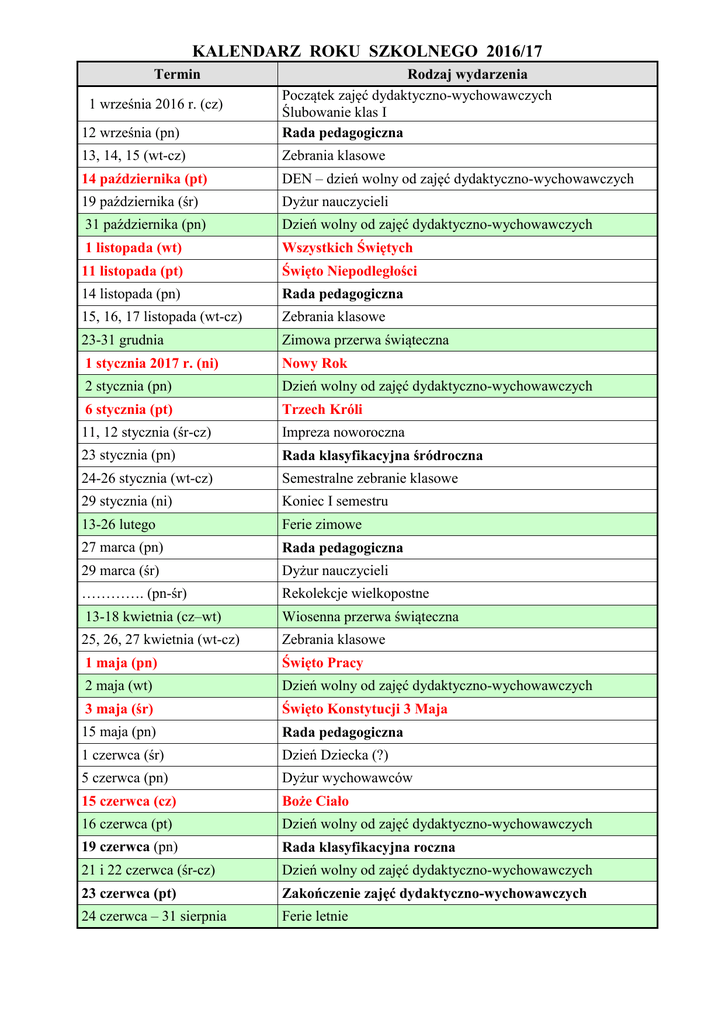 KALENDARZ ROKU SZKOLNEGO 2016/17 Termin 12 września (pn) Rodzaj wydarzenia Początek zajęć dydaktyczno-wychowawczych Ślubowanie klas I Rada pedagogiczna 13, 14, 15 (wt-cz) Zebrania klasowe 14 października (pt) DEN – dzień wolny od zajęć dydaktyczno-wychowawczych 19 października (śr) Dyżur nauczycieli 31 października (pn) Dzień wolny od zajęć dydaktyczno-wychowawczych 1 listopada (wt) Wszystkich Świętych 11 listopada (pt) Święto Niepodległości 14 listopada (pn) Rada pedagogiczna 15, 16, 17 listopada (wt-cz) Zebrania klasowe 23-31 grudnia Zimowa przerwa świąteczna 1 stycznia 2017 r. (ni) Nowy Rok 2 stycznia (pn) Dzień wolny od zajęć dydaktyczno-wychowawczych 6 stycznia (pt) Trzech Króli 11, 12 stycznia (śr-cz) Impreza noworoczna 23 stycznia (pn) Rada klasyfikacyjna śródroczna 24-26 stycznia (wt-cz) Semestralne zebranie klasowe 29 stycznia (ni) Koniec I semestru 13-26 lutego Ferie zimowe 27 marca (pn) Rada pedagogiczna 29 marca (śr) Dyżur nauczycieli …………. (pn-śr) Rekolekcje wielkopostne 13-18 kwietnia (cz–wt) Wiosenna przerwa świąteczna 25, 26, 27 kwietnia (wt-cz) Zebrania klasowe 1 maja (pn) Święto Pracy 2 maja (wt) Dzień wolny od zajęć dydaktyczno-wychowawczych 3 maja (śr) Święto Konstytucji 3 Maja 15 maja (pn) Rada pedagogiczna 1 czerwca (śr) Dzień Dziecka (?) 5 czerwca (pn) Dyżur wychowawców 15 czerwca (cz) Boże Ciało 16 czerwca (pt) Dzień wolny od zajęć dydaktyczno-wychowawczych 19 czerwca (pn) Rada klasyfikacyjna roczna 21 i 22 czerwca (śr-cz) Dzień wolny od zajęć dydaktyczno-wychowawczych 23 czerwca (pt) Zakończenie zajęć dydaktyczno-wychowawczych 24 czerwca – 31 sierpnia Ferie letnie 1 września 2016 r. (cz)