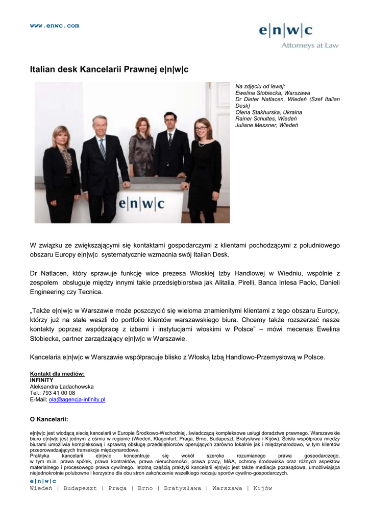 www.enwc.com Italian desk Kancelarii Prawnej e|n|w|c Na zdjęciu od lewej: Ewelina Stobiecka, Warszawa Dr Dieter Natlacen, Wiedeń (Szef Italian Desk) Olena Stakhurska, Ukraina Rainer Schultes, Wiedeń Juliane Messner, Wiedeń W związku ze zwiększającymi się kontaktami gospodarczymi z klientami pochodzącymi z południowego obszaru Europy e|n|w|c systematycznie wzmacnia swój Italian Desk. Dr Natlacen, który sprawuje funkcję wice prezesa Włoskiej Izby Handlowej w Wiedniu, wspólnie z zespołem obsługuje między innymi takie przedsiębiorstwa jak Alitalia, Pirelli, Banca Intesa Paolo, Danieli Engineering czy Tecnica. „TakŜe e|n|w|c w Warszawie moŜe poszczycić się wieloma znamienitymi klientami z tego obszaru Europy, którzy juŜ na stałe weszli do portfolio klientów warszawskiego biura. Chcemy takŜe rozszerzać nasze kontakty poprzez współpracę z izbami i instytucjami włoskimi w Polsce” – mówi mecenas Ewelina Stobiecka, partner zarządzający e|n|w|c w Warszawie. Kancelaria e|n|w|c w Warszawie współpracuje blisko z Włoską Izbą Handlowo-Przemysłową w Polsce. Kontakt dla mediów: INFINITY Aleksandra Ladachowska Tel.: 793 41 00 08 E-Mail: [email protected] O Kancelarii: e|n|w|c jest wiodącą siecią kancelarii w Europie Środkowo-Wschodniej, świadczącą kompleksowe usługi doradztwa prawnego. Warszawskie biuro e|n|w|c jest jednym z ośmiu w regionie (Wiedeń, Klagenfurt, Praga, Brno, Budapeszt, Bratysława i Kijów). Ścisła współpraca między biurami umoŜliwia kompleksową i sprawną obsługę przedsiębiorców operujących zarówno lokalnie jak i międzynarodowo, w tym klientów przeprowadzających transakcje międzynarodowe. Praktyka kancelarii e|n|w|c koncentruje się wokół szeroko rozumianego prawa gospodarczego, w tym m.in. prawa spółek, prawa kontraktów, prawa nieruchomości, prawa pracy, M&A, ochrony środowiska oraz róŜnych aspektów materialnego i procesowego prawa cywilnego. Istotną częścią praktyki kancelarii e|n|w|c jest takŜe mediacja pozasądowa, umoŜliwiająca niejednokrotnie polubowne i korzystne dla obu stron zakończenie wszelkiego rodzaju sporów cywilno-gospodarczych. e|n|w|c Wiedeń | Budapeszt | Praga | Brno | Bratysława | Warszawa | Kijów Obecnie, e|n|w|c Kancelaria Prawna zrzesza ponad 70 prawników w regionie Europy Środkowo-Wschodniej, którzy doradzają znaczącym krajowym i międzynarodowym przedsiębiorstwom w takich dziedzinach jak: handel, transport, przemysł, technologia i świadczenie usług, banki i ubezpieczenia. Ponadto sieć e|n|w|c jest członkiem Interlaw – międzynarodowej organizacji skupiającej wiodące Kancelarie prawa gospodarczego w ponad 125 krajach na świecie, dysponujące ponad 5000 adwokatami i radcami prawnymi. W warszawskim biurze e|n|w|c do dyspozycji pozostaje zespół prawników biegle władających językami obcymi: angielskim, niemieckim i francuskim. Eksperci e|n|w|c posiadają zarówno wiedzę wynikającą z międzynarodowej praktyki kancelarii jak i doskonałą znajomość lokalnych uwarunkowań prawnych, z którymi musi zmierzyć się przedsiębiorca. WyróŜnienia: W edycji 2009 rankingu Legal 500 warszawskie biuro e|n|w|c zostało rekomendowane w kategorii prawa nieruchomości i prawa korporacyjnego, w szczególności M&A. To prestiŜowe wyróŜnienie zostało teŜ przyznane kancelarii w roku 2010 i 2011. W kwietniu 2010 e|n|w|c otrzymało wyróŜnienie „Kancelaria Miesiąca” od ogólnopolskiej Gazety Finansowej za doradztwo przy projekcie „Rondo Office” dla Grupy S+B. Projekt ten zaowocował powstaniem jednego z najnowocześniejszych biurowców w centrum Warszawy – „Zebra Tower”. W październiku 2010 Mecenas Ewelina Stobiecka została wyróŜniona w rankingu Gazety Finansowej „Perły Polskiego Biznesu 2010” jako jedna z 25 najbardziej przedsiębiorczych kobiet w Polsce. W listopadzie 2010 znalazła się wśród 10 finalistek konkursu Sukces Pisany Szminką – Bizneswoman Roku 2009 Radia PIN. e|n|w|c Wiedeń | Budapeszt | Praga | Brno | Bratysława | Warszawa | Kijów 2