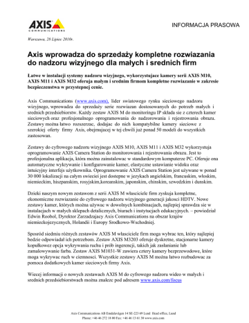 INFORMACJA PRASOWA Warszawa, 28 Lipiec 2010r. Axis wprowadza do sprzedaży kompletne rozwiazania do nadzoru wizyjnego dla małych i srednich firm Łatwe w instalacji systemy nadzoru wizyjnego, wykorzystujace kamery serii AXIS M10, AXIS M11 i AXIS M32 oferuja małym i srednim firmom kompletne rozwiazanie w zakresie bezpieczenstwa w przystepnej cenie. Axis Communications (www.axis.com), lider swiatowego rynku sieciowego nadzoru wizyjnego, wprowadza do sprzedaży serie rozwiazan dostosowanych do potrzeb małych i srednich przedsiebiorstw. Każdy zestaw AXIS M do monitoringu IP składa sie z czterech kamer sieciowych oraz profesjonalnego oprogramowania do nadzorowania i rejestrowania obrazu. Zestawy można łatwo rozszerzac, dodajac do nich kompatybilne kamery sieciowe z szerokiej oferty firmy Axis, obejmujacej w tej chwili już ponad 50 modeli do wszystkich zastosowan. Zestawy do cyfrowego nadzoru wizyjnego AXIS M10, AXIS M11 i AXIS M32 wykorzystuja oprogramowanie AXIS Camera Station do monitorowania i rejestrowania obrazu. Jest to profesjonalna aplikacja, która można zainstalowac w standardowym komputerze PC. Oferuje ona automatyczne wykrywanie i konfigurowanie kamer, elastyczne ustawianie widoku oraz intuicyjny interfejs użytkownika. Oprogramowanie AXIS Camera Station jest używane w ponad 30 000 lokalizacji na całym swieciei jest dostepne w jezykach angielskim, francuskim, włoskim, niemieckim, hiszpanskim, rosyjskim,koreanskim, japonskim, chinskim, szwedzkim i dunskim. Dzieki naszym nowym zestawom z serii AXIS M własciciele firm zyskuja kompletne, ekonomiczne rozwiazanie do cyfrowego nadzoru wizyjnego generacji jakosci HDTV. Nowe zestawy kamer, których można używac w dowolnych kombinacjach, najlepiej sprawdza sie w instalacjach w małych sklepach detalicznych, biurach i instytucjach edukacyjnych. – powiedział Edwin Roobol, Dyrektor Zarzadzajacy Axis Communications na obszar krajów niemieckojezycznych, Holandii i Europy Srodkowo-Wschodniej. Sposród siedmiu różnych zestawów AXIS M własciciele firm moga wybrac ten, który najlepiej bedzie odpowiadał ich potrzebom. Zestaw AXIS M3203 oferuje dyskretne, stacjonarne kamery kopułkowez opcja wykrywania ruchu i prób ingerencji, takich jak zasłanianie lub zamalowywanie farba. Zestaw AXIS M1031-W zawiera cztery kamery bezprzewodowe, które moga wykrywac ruch w ciemnosci. Wszystkie zestawy AXIS M można łatwo rozbudowac za pomoca dodatkowych kamer sieciowych firmy Axis. Wiecej informacji o nowych zestawach AXIS M do cyfrowego nadzoru wideo w małych i srednich przedsiebiorstwach można znalezc pod adresem www.axis.com/focus Axis Communications AB Emdalavägen 14 SE-223 69 Lund Head office, Lund Phone: +46 46 272 18 00 Fax: +46 46 13 61 30 www.axis.com Dystrybutorami produktów Axis Communications w Polsce sa firmy: Anixter Polska ( www.anixter.pl), Softex Data (www.softexdata.pl), Tech Data Polska / TDAzlan ( www.techdata.pl) i Videor (www.videor.com). Infomacje dodatkowe: Firma Axis Communications jest światowym liderem branży sieciowych systemów wizyjnych z udziałem w rynku kamer sieciowych wynoszącym 31,2%. Szacuje się, że sam rynek kamer sieciowych na świecie osiągnie wartość ponad 2,5 miliarda USD do 2013 r. Założona stopa rocznego wzrostu dla rynku kamer sieciowych wyniesie ponad 28 procent w okresie kolejnych pięciu lat, zgodnie z prognozami opublikowanymi przez ośrodek IMS Research ( www.imsresearch.com) w swoim najnowszym raporcie zatytułowanym ‘Światowy Rynek Urządzeń CCTV i Wideo służących do Monitoringu - wydanie 2009’, opublikowanym w sierpniu 2009 r. O firmie Axis: Axis jest szwedzką firmą IT oferującą sieciowe rozwiązania wizyjne do profesjonalnych instalacji. Firma jest światowym liderem w dziedzinie sieciowego nadzoru wideo i promuje przechodzenie z systemów nadzoru analogowego na cyfrowy. Produkty i rozwiązania firmy Axis skupiają się na zdalnym nadzorze i monitorowaniu. Są one oparte na innowacyjnych, otwartych platformach technologicznych. Biura Axisa są zlokalizowane w 20 krajach, a firma współpracuje z partnerami w ponad 70 krajach. Axis Communications zostało założone w 1984 r., jest notowane na giełdzie NASDAQ OMX w Sztokholmie, a jego symbol to AXIS. Więcej informacji o firmie Axis można znaleźć na stronie www.axis.com Więcej informacji o firmie Axis udziela: Edwin Roobol Dyrektor Regionalny na obszar Europy Środkowej Axis Communications Tel.: +49 811 555 080 E-mail: [email protected] Agata Majkucińska Key Account Manager Axis Communications E-mail: [email protected] Kontakt dla prasy w Polsce: Kamila Wierzbicka Grayling Poland Tel.: +48 22 536 04 69 Tel. kom.: +48 0 607 104 872 E-mail: [email protected] Axis Communications AB Emdalavägen 14 SE-223 69 Lund Head office, Lund Phone: +46 46 272 18 00 Fax: +46 46 13 61 30 www.axis.com