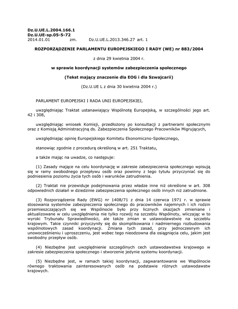 Dz.U.UE.L.2004.166.1 Dz.U.UE-sp.05-5-72 2014.01.01 zm. Dz.U.UE.L.2013.346.27 art. 1 ROZPORZĄDZENIE PARLAMENTU EUROPEJSKIEGO I RADY (WE) nr 883/2004 z dnia 29 kwietnia 2004 r. w sprawie koordynacji systemów zabezpieczenia społecznego (Tekst mający znaczenie dla EOG i dla Szwajcarii) (Dz.U.UE L z dnia 30 kwietnia 2004 r.) PARLAMENT EUROPEJSKI I RADA UNII EUROPEJSKIEJ, uwzględniając Traktat ustanawiający Wspólnotę Europejską, w szczególności jego art. 42 i 308, uwzględniając wniosek Komisji, przedłożony po konsultacji z partnerami społecznymi oraz z Komisją Administracyjną ds. Zabezpieczenia Społecznego Pracowników Migrujących, uwzględniając opinię Europejskiego Komitetu Ekonomiczno-Społecznego, stanowiąc zgodnie z procedurą określoną w art. 251 Traktatu, a także mając na uwadze, co następuje: (1) Zasady mające na celu koordynację w zakresie zabezpieczenia społecznego wpisują się w ramy swobodnego przepływu osób oraz powinny z tego tytułu przyczyniać się do podniesienia poziomu życia tych osób i warunków zatrudnienia. (2) Traktat nie przewiduje podejmowania przez władze inne niż określone w art. 308 odpowiednich działań w dziedzinie zabezpieczenia społecznego osób innych niż zatrudnione. (3) Rozporządzenie Rady (EWG) nr 1408/71 z dnia 14 czerwca 1971 r. w sprawie stosowania systemów zabezpieczenia społecznego do pracowników najemnych i ich rodzin przemieszczających się we Wspólnocie było przy licznych okazjach zmieniane i aktualizowane w celu uwzględnienia nie tylko rozwój na szczeblu Wspólnoty, wliczając w to wyroki Trybunału Sprawiedliwości, ale także zmian w ustawodawstwie na szczeblu krajowym. Takie czynniki przyczyniły się do skomplikowania i nadmiernego rozbudowania wspólnotowych zasad koordynacji. Zmiana tych zasad, przy jednoczesnym ich unowocześnieniu i uproszczeniu, jest wobec tego nieodzowna dla osiągnięcia celu, jakim jest swobodny przepływ osób. (4) Niezbędne jest uwzględnienie szczególnych cech ustawodawstwa krajowego w zakresie zabezpieczenia społecznego i stworzenie jedynie systemu koordynacji. (5) Niezbędne jest, w ramach takiej koordynacji, zagwarantowanie we Wspólnocie równego traktowania zainteresowanych osób na podstawie różnych ustawodawstw krajowych. (6) Ścisły związek pomiędzy ustawodawstwem w zakresie zabezpieczenia społecznego i tymi postanowieniami umownymi, które uzupełniają lub zastępują takie ustawodawstwo, a które były przedmiotem decyzji władz publicznych, które nadały im charakter obligatoryjny lub rozszerzyły ich zakres stosowania, może wymagać podobnej ochrony w odniesieniu do stosowania tych przepisów, jak ochrona przyznana przez niniejsze rozporządzenie. Pierwszym krokiem mogłaby być ocena doświadczeń Państw Członkowskich, które zgłosiły takie systemy. (7) Ze względu na poważne różnice istniejące pomiędzy ustawodawstwami krajowymi co do objętych nimi osób, wskazane jest wprowadzenie zasady, że niniejsze rozporządzenie ma się stosować do obywateli Państwa Członkowskiego, bezpaństwowców i uchodźców mających miejsce zamieszkania na terytorium Państwa Członkowskiego, którzy podlegają lub podlegali ustawodawstwu w zakresie zabezpieczenia społecznego jednego lub kilku Państw Członkowskich oraz do członków ich rodzin i osób pozostałych przy życiu. (8) Ogólna zasada równego traktowania ma szczególne znaczenie dla pracowników, którzy nie mają miejsca zamieszkania w Państwie Członkowskim ich zatrudnienia, włącznie z pracownikami przygranicznymi. (9) Trybunał Sprawiedliwości przy kilku okazjach wydał opinię w sprawie możliwości równego traktowania świadczeń, dochodu i okoliczności; zasada ta powinna być ściśle przyjęta i rozwijana, przy jednoczesnym przestrzeganiu istoty i ducha postanowień prawnych. (10) Jednakże zasada traktowania pewnych okoliczności lub wydarzeń mających miejsce na terytorium innego Państwa Członkowskiego tak, jak gdyby miały one miejsce na terytorium Państwa Członkowskiego, którego ustawodawstwo ma w danej sytuacji zastosowanie, nie powinna kolidować z zasadą sumowania okresów ubezpieczenia, zatrudnienia, pracy na własny rachunek lub zamieszkania spełnionych na podstawie ustawodawstwa innego Państwa Członkowskiego, z okresami spełnionymi na podstawie ustawodawstwa właściwego Państwa Członkowskiego. Okresy spełnione na podstawie ustawodawstwa innego Państwa Członkowskiego powinny wobec tego być brane pod uwagę wyłącznie przy zastosowaniu zasady sumowania okresów. (11) Uwzględnianie okoliczności lub wydarzeń mających miejsce w Państwie Członkowskim nie może w żaden sposób sprawiać, że właściwym dla nich stanie się inne Państwo Członkowskie ani że będzie się do nich stosować jego ustawodawstwo. (12) W świetle zasady proporcjonalności należy zadbać o to, by zasada uwzględniania okoliczności lub wydarzeń nie prowadziła do obiektywnie nieuzasadnionych rezultatów ani do kumulacji świadczeń tego samego rodzaju za ten sam okres. (13) Zasady koordynacji zasad muszą gwarantować, że osoby przemieszczające się we Wspólnocie, osoby pozostające na ich utrzymaniu i osoby pozostałe przy życiu zachowują prawa i korzyści już nabyte i te, które są w trakcie nabywania. (14) Cele te muszą być osiągane w szczególności poprzez sumowanie wszystkich okresów branych pod uwagę na podstawie ustawodawstw różnych krajów w celu nabycia i zachowania prawa do świadczeń i w celu obliczania wysokości świadczeń, a także poprzez przewidzenie świadczeń dla różnych grup osób objętych niniejszym rozporządzeniem. (15) Niezbędne jest poddanie osób przemieszczających się we Wspólnocie systemem zabezpieczenia społecznego tylko jednego Państwa Członkowskiego w celu uniknięcia zbiegu mających tu zastosowanie przepisów ustawodawstw krajowych oraz komplikacji, które mogłyby z tego wynikać. (16) W zasadzie nie ma 