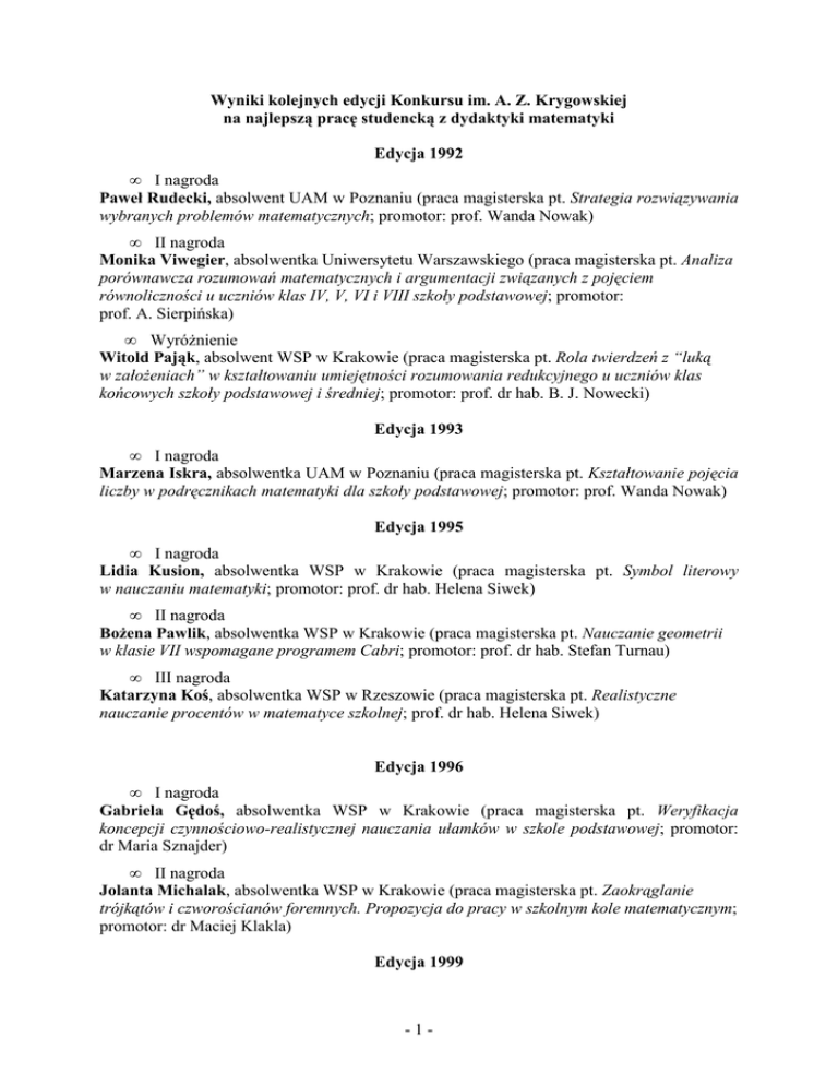 Wyniki kolejnych edycji Konkursu im. A. Z. Krygowskiej na najlepszą pracę studencką z dydaktyki matematyki Edycja 1992 • I nagroda Paweł Rudecki, absolwent UAM w Poznaniu (praca magisterska pt. Strategia rozwiązywania wybranych problemów matematycznych; promotor: prof. Wanda Nowak) • II nagroda Monika Viwegier, absolwentka Uniwersytetu Warszawskiego (praca magisterska pt. Analiza porównawcza rozumowań matematycznych i argumentacji związanych z pojęciem równoliczności u uczniów klas IV, V, VI i VIII szkoły podstawowej; promotor: prof. A. Sierpińska) • WyróŜnienie Witold Pająk, absolwent WSP w Krakowie (praca magisterska pt. Rola twierdzeń z “luką w załoŜeniach” w kształtowaniu umiejętności rozumowania redukcyjnego u uczniów klas końcowych szkoły podstawowej i średniej; promotor: prof. dr hab. B. J. Nowecki) Edycja 1993 • I nagroda Marzena Iskra, absolwentka UAM w Poznaniu (praca magisterska pt. Kształtowanie pojęcia liczby w podręcznikach matematyki dla szkoły podstawowej; promotor: prof. Wanda Nowak) Edycja 1995 • I nagroda Lidia Kusion, absolwentka WSP w Krakowie (praca magisterska pt. Symbol literowy w nauczaniu matematyki; promotor: prof. dr hab. Helena Siwek) • II nagroda BoŜena Pawlik, absolwentka WSP w Krakowie (praca magisterska pt. Nauczanie geometrii w klasie VII wspomagane programem Cabri; promotor: prof. dr hab. Stefan Turnau) • III nagroda Katarzyna Koś, absolwentka WSP w Rzeszowie (praca magisterska pt. Realistyczne nauczanie procentów w matematyce szkolnej; prof. dr hab. Helena Siwek) Edycja 1996 • I nagroda Gabriela Gędoś, absolwentka WSP w Krakowie (praca magisterska pt. Weryfikacja koncepcji czynnościowo-realistycznej nauczania ułamków w szkole podstawowej; promotor: dr Maria Sznajder) • II nagroda Jolanta Michalak, absolwentka WSP w Krakowie (praca magisterska pt. Zaokrąglanie trójkątów i czworościanów foremnych. Propozycja do pracy w szkolnym kole matematycznym; promotor: dr Maciej Klakla) Edycja 1999 -1- • I nagroda Agata Dąbrowska, absolwentka WSP w Krakowie (praca magisterska pt. Strefy moŜliwości i najbliŜszych moŜliwości przy kształtowaniu pojęcia dziesiątkowego systemu pozycyjnego; promotor: prof. dr hab. Helena Siwek) • II nagroda Irena Bryk, absolwentka WSP w Rzeszowie (praca magisterska pt. Operatywne rozumienie pojęcia funkcji przez uczniów szkoły podstawowej; prof. dr hab. Helena Siwek) Edycja 2000 • II nagroda Jerzy Rogowski, absolwent AP w Krakowie (praca magisterska pt. Wykorzystanie grafów w nauczaniu matematyki; promotor: prof. dr hab. Bogdan Nowecki) (Uwaga: I nagrody nie przyznano) Edycja 2002 • I nagroda – ex aequo dwie osoby: Barbara Dubiecka-Kruk, absolwentka AP w Krakowie (praca magisterska pt. Rola kalkulatorów graficznych w procesie rozwiązywania zadań matematycznych; promotor: prof. dr hab. Helena Siwek) Tomasz Karolak, absolwent UAM w Poznaniu (praca magisterska pt. Dostrzeganie i wykorzystanie analogii w rozumowaniach matematycznych na róŜnych poziomach nauczania; promotor: prof. dr hab. Maria Korcz) Edycja 2004 • I nagroda Katarzyna Radoń, absolwentka AP w Krakowie (praca magisterska pt. Odkrywanie i formułowanie twierdzeń przez uczniów szkoły średniej; promotor: prof. dr hab. Helena Siwek) • WyróŜnienie Małgorzata Drozdowicz, absolwentka WSP Towarzystwa Wiedzy Powszechnej w Warszawie (praca magisterska pt. Rola zadań tekstowych w integrowaniu treści i metod we współczesnych projektach dydaktycznych dla klas I-III; promotor: prof. dr hab. Helena Siwek) Magdalena Glac, absolwentka AP w Krakowie (praca magisterska pt. Realizacja ścieŜek edukacyjnych w projekcie Matematyka 2001 na drugim etapie kształcenia; promotor: prof. dr hab. Bogdan Nowecki) Halina Zbijowska, absolwentka AP w Krakowie (praca magisterska pt. Rola komputera w rozwiązywaniu problemów matematycznych; promotor: prof. dr hab. Henryk Kąkol) Edycja 2008 • I nagroda Dominika Woźniak, absolwentka UAM w Poznaniu (praca magisterska pt. Przygotowanie przez wyŜsze studia matematyczne do nauczania rachunku prawdopodobieństwa w szkole; promotor: dr Aleksandra Maciejewska) • II nagroda – ex aequo: Lucyna Matusik, absolwentka Uniwersytetu Pedagogicznego w Krakowie (praca magisterska pt. Pojęcie funkcji w nauczaniu matematyki a typy zadań w koncepcji realistyczno-problemowej; promotor: prof. dr hab. Helena Siwek) -2- Anna Pająk, absolwentka Uniwersytetu Pedagogicznego w Krakowie (praca magisterska pt. Koncepcje wprowadzania procentów we współczesnym nauczaniu matematyki; promotor: prof. dr hab. Helena Siwek) Edycja 2010 • I nagroda Marta Korczyk, absolwentka Uniwersytetu Pedagogicznego w Krakowie (praca magisterska pt. Dydaktyczne koncepcje kształtowania pojęcia wyraŜenia algebraicznego w podręcznikach matematyki dla róŜnych typów szkół; promotor: prof. dr hab. Helena Siwek) • II nagroda Anna Jurewicz, absolwentka Uniwersytetu Pedagogicznego w Krakowie (praca magisterska pt. Badanie wpływu wizualizacji na dostrzeganie i zapisywanie regularności przez uczniów na róŜnym poziomie rozwoju intelektualnego; promotor: dr Lidia Zaręba) • WyróŜnienie Ewelina Holender-Wilczkiewicz, absolwentka Uniwersytetu Pedagogicznego w Krakowie (praca magisterska pt. O integracji matematyki ze sztuką i informatyką na przykładzie cyklu lekcji w klasie VI z mozaikami M. C. Eschera; promotor: dr Aleksandra Urbańska) Edycja 2011 • I nagroda Justyna Suder, absolwentka Uniwersytetu Pedagogicznego w Krakowie (praca magisterska pt. Merytoryczne i logiczne preferencje uczących się w procesie korekty fałszywych stwierdzeń; promotor: dr hab. Maciej Klakla, prof. Uniwersytetu Pedagogicznego w Krakowie) • II nagroda – ex aequo: Dorota Kluczykowska, absolwentka Uniwersytetu im. A. Mickiewicza w Poznaniu (praca magisterska pt. Pojęcie liczby w historii i na poszczególnych etapach nauczania szkolnego; promotor: dr hab. Magdalena Jaroszewska, prof. Uniwersytet