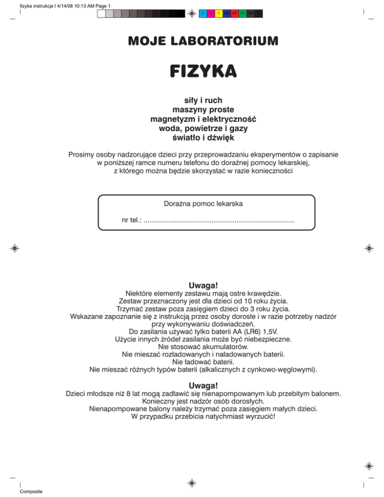 fizyka instrukcja I 4/14/08 10:13 AM Page 1 C M Y CM MY CY CMY K MOJE LABORATORIUM FIZYKA si∏y i ruch maszyny proste magnetyzm i elektrycznoÊç woda, powietrze i gazy Êwiat∏o i dêwi´k Prosimy osoby nadzorujàce dzieci przy przeprowadzaniu eksperymentów o zapisanie w poni˝szej ramce numeru telefonu do doraênej pomocy lekarskiej, z którego mo˝na b´dzie skorzystaç w razie koniecznoÊci Doraêna pomoc lekarska nr tel.: .............................................................................. Uwaga! Niektóre elementy zestawu majà ostre kraw´dzie. Zestaw przeznaczony jest dla dzieci od 10 roku ˝ycia. Trzymaç zestaw poza zasi´giem dzieci do 3 roku ˝ycia. Wskazane zapoznanie si´ z instrukcjà przez osoby doros∏e i w razie potrzeby nadzór przy wykonywaniu doÊwiadczeƒ. Do zasilania u˝ywaç tylko baterii AA (LR6) 1,5V. U˝ycie innych êróde∏ zasilania mo˝e byç niebezpieczne. Nie stosowaç akumulatorów. Nie mieszaç roz∏adowanych i na∏adowanych baterii. Nie ∏adowaç baterii. Nie mieszaç ró˝nych typów baterii (alkalicznych z cynkowo-w´glowymi). Uwaga! Dzieci m∏odsze ni˝ 8 lat mogà zad∏awiç si´ nienapompowanym lub przebitym balonem. Konieczny jest nadzór osób doros∏ych. Nienapompowane balony nale˝y trzymaç poza zasi´giem ma∏ych dzieci. W przypadku przebicia natychmiast wyrzuciç! Composite fizyka instrukcja I 4/14/08 10:13 AM Page 2 C M Y CM MY CY CMY K SPIS ELEMENTÓW: SPIS ELEMENTÓW 1. konsola 2. podstawa wagi 3. szalki x 2 (waga) 4. instrukcja do zestawu 5. du˝e ko∏a x 2 6. ma∏e ko∏a x 2 7. odwa˝nik 1/2g (waga) 8. odwa˝nik 1g (waga) 9. odwa˝nik 2g (waga) 10. odwa˝nik 3g (waga) 11. odwa˝nik 5g (waga) 12. rami´ (waga) 13. element przed∏u˝ajàcy (waga) 14. wskazówka (waga) 15. zlewka 16. kulki 17. uchwyt do probówki x 2 18. zakraplacz 19. kó∏ka x 2 (waga) 20. pierÊcieƒ gumowy 21. wà˝ 22. kartka ze wzorami 23. tekturka z kolorowymi dyskami 24. nabiegunniki 25. rurka z tworzywa sztucznego x 3 26. pr´t stalowy 27. naklejka z podzia∏kami 28. podwozie 29. balony 30. podgrzewacz stearynowy 31. cylinder strzykawki 32. t∏ok strzykawki 33. korek bez otworu 34. korek z jednym otworem 35. korek z dwoma otworami 36. lejek 37. p∏ytka 38. papier Êcierny 39. lusterko 40. probówki 41. zaczep wagi spr´˝ynowej 42. podstawa strzykawki 43. drut emaliowany 44. wata stalowa 45. szpilka i zatyczka (waga) 46. spinacze biurowe 47. arkusz gumy 48. krzy˝ak 49. zatyczka 50. ma∏e nakr´tki x 3 51. du˝e nakr´tki x 3 (waga) 52. no˝yk do rurek 53. Êruby x 3 54. wkr´ty monta˝owe 55. uchwyty kàtowe 56. wspornik 57. niç 58. szpilki z tworzywa sztucznego 59. oÊ 60. gumki recepturki 61. spr´˝yna 62. magnes UWAGA! Niektóre elementy mogà si´ nieco ró˝niç od przedstawionych na rysunkach. 1 • Moje Laboratorium - Fizyka Composite fizyka instrukcja I 4/14/08 10:13 AM Page 3 C M Y CM MY CY CMY K SPIS TREÂCI: Drodzy Rodzice i Nauczyciele! ................................................................................................................................ 3 WST¢P ...................................................................................................................................................................... 3 OSTRZE˚ENIA ......................................................................................................................................................... 3 SYSTEM METRYCZNY ............................................................................................................................................. 4 JEDNOSTKI MIAR .................................................................................................................................................... 4 INSTRUKCJE MONTA˚U ......................................................................................................................................... 5 Konsola ..................................................................................................................................................................... 5 Waga ........................................................................................................................................................................ 5 Zlewka z podzia∏kà ................................................................................................................................................... 6 Cylinder miarowy (menzurka ................................................................................................................................... 6 Waga spr´˝ynowa .................................................................................................................................................... 6 Zakraplacz ................................................................................................................................................................ 6 Wózek ....................................................................................................................................................................... 7 Podgrzewacz stearynowy ........................................................................................................................................ 7 Poduszkowiec .......................................................................................................................................................... 7 Strzykawka ............................................................................................................................................................... 8 Wsuwanie rurki do otworu w korku ......................................................................................................................... 8 Podgrzewanie i studzenie probówek ....................................................................................................................... 8 Zdejmowanie izolacji z przewodów ...................