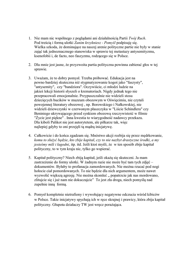 1. Nie mam nic wspólnego z poglądami ani działalnością Partii Twój Ruch. Pod treścią i formą ulotki Zanim krzykniesz - Pomyśl podpisuję się. Wielka szkoda, że dominujące na naszej arenie polityczne partie nie były w stanie zająć tak jednoznacznego stanowiska w sprawie tej metastazy antysemityzmu, ksenofobii i, de facto, neo faszyzmu, rodzącego się w Polsce. 2. Dla mnie jest jasne, że przyzwoita partia polityczna powinna zabierać głos w tej sprawie. 3. Uważam, że to dobry pomysł. Trzeba próbować. Edukacja jest na pewno bardziej skuteczna niż stygmatyzowanie kogoś jako "faszysty", "antysemity", czy "bandziora". Oczywiście, ci młodzi ludzie na jakieś lekcji historii słyszeli o krematoriach. Nigdy jednak tego nie przepracowali emocjonalnie. Przypuszczalnie nie widzieli stosu dziecięcych bucików w muzeum obozowym w Oświęcimiu, nie czytali powojennej literatury obozowej , np. Borowskiego i Nałkowskiej, nie widzieli dziewczynki w czerwonym płaszczyku w "Liście Schindlera" czy Beniniego ukrywającego przed synkiem obozową rzeczywistość w filmie "Życie jest piękne" . Inna kwestia to wiarygodność nadawcy przekazu. Dla kiboli Palikot nie jest autorytetem, ale piłkarze tak, więc najlepiej gdyby to oni przejęli tą mądrą inicjatywę. 4. Całkowicie i do końca zgadzam się. Mnóstwo akcji rozbija się przez mędrkowanie, komu to służyć będzie, kto zbije kapitał, czy to nie nazbyt drastyczne środki, a my jesteśmy mili i łagodni, itp. itd. Jeśli ktoś myśli, że w ten sposób zbije kapitał polityczny, to w tym kraju nic, tylko go wspierać. 5. Kapitał polityczny? Niech zbiją kapitał, jeśli okażą się skuteczni. Ja mam zastrzeżenie do formy ulotki. W żadnym razie nie może być tam tych zdjęć – dokumentów. Byłaby to profanacja zamordowanych. Nie można rzucać pod nogi hołocie ciał pomordowanych. To nie będzie dla nich argumentem, może nawet wyzwolić większą agresję. Nie można skomleć „ popatrzcie jak nas mordowano, zlitujcie się i już nam nie dokuczajcie” To jest zła droga, niech pomyślą nad zupełnie inną formą. 6. Pomysł kompletnie nietrafiony i wywołujący negatywne odczucia wśród kibiców w Polsce. Takie inicjatywy spychają ich w ręce skrajnej i prawicy, która zbija kapitał polityczny. Głupota działaczy TW jest wręcz porażająca.