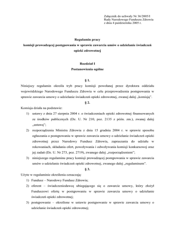 Załącznik do uchwały Nr 36/2005/I Rady Narodowego Funduszu Zdrowia z dnia 4 października 2005 r. Regulamin pracy komisji prowadzącej postępowania w sprawie zawarcia umów o udzielanie świadczeń opieki zdrowotnej Rozdział I Postanowienia ogólne § 1. Niniejszy regulamin określa tryb pracy komisji powołanej przez dyrektora oddziału wojewódzkiego Narodowego Funduszu Zdrowia w celu przeprowadzenia postępowania w sprawie zawarcia umowy o udzielanie świadczeń opieki zdrowotnej, zwanej dalej „komisją”. § 2. Komisja działa na podstawie: 1) ustawy z dnia 27 sierpnia 2004 r. o świadczeniach opieki zdrowotnej finansowanych ze środków publicznych (Dz. U. Nr 210, poz. 2135 z późn. zm.), zwanej dalej „ustawą”; 2) rozporządzenia Ministra Zdrowia z dnia 15 grudnia 2004 r. w sprawie sposobu ogłaszania o postępowaniu w sprawie zawarcia umowy o udzielanie świadczeń opieki zdrowotnej przez Narodowy Fundusz Zdrowia, zapraszania do udziału w rokowaniach, składania ofert, powoływania i odwoływania komisji konkursowej oraz jej zadań (Dz. U. Nr 273, poz. 2719), zwanego dalej „rozporządzeniem”; 3) niniejszego regulaminu pracy komisji prowadzącej postępowania w sprawie zawarcia umów o udzielanie świadczeń opieki zdrowotnej, zwanego dalej „regulaminem”. § 3. UŜyte w regulaminie określenia oznaczają: 1) Fundusz – Narodowy Fundusz Zdrowia; 2) oferent – świadczeniodawcę ubiegającego się o zawarcie umowy, który złoŜył Funduszowi ofertę w postępowaniu w sprawie zawarcia umowy o udzielanie świadczeń opieki zdrowotnej; 3) postępowanie – określone w ustawie postępowanie w sprawie zawarcia umowy o udzielanie świadczeń opieki zdrowotnej; 4) umowa – umowę o udzielanie świadczeń opieki zdrowotnej. Rozdział II Skład komisji § 4. 1. Komisja powoływana jest przez dyrektora oddziału wojewódzkiego Funduszu do przeprowadzenia określonego postępowania. 2. Dyrektor oddziału wojewódzkiego Funduszu powołując komisję określa jej właściwość rzeczową i miejscową oraz liczbę jej członków, nie mniejszą niŜ 3. W skład komisji wchodzi nieparzysta liczba członków. 3. Dyrektor oddziału wojewódzkiego Funduszu powołując komisję wyznacza spośród jej członków przewodniczącego, wiceprzewodniczącego i protokolanta. 4. W celu zapewnienia prawidłowego i sprawnego przebiegu postępowania skład oraz liczbę członków komisji, ustala się odpowiednio do trybu i przedmiotu postępowania prowadzonego przez komisję. W składzie komisji zapewnia się udział osoby z wykształceniem medycznym oraz w miarę moŜliwości osób z wykształceniem prawniczym i ekonomicznym. § 5. 1. Przewodniczący kieruje pracami komisji oraz reprezentuje ją na zewnątrz. 2. Wiceprzewodniczący zastępuje przewodniczącego w przypadku jego nieobecności. 3. W przypadku pilnej potrzeby oraz niemoŜności wykonywania swych zadań przez przewodniczącego i wiceprzewodniczącego dyrektor oddziału wojewódzkiego Funduszu moŜe pisemnie upowaŜnić do przewodniczenia komisji, na czas zastępstwa, jednego z jej członków. 4. Do zadań przewodniczącego naleŜy w szczególności: 1) ustalanie, w zaleŜności od potrzeb, harmonogramu posiedzeń komisji, z uwzględnieniem pilności spraw będących przedmiotem postępowania; 2) zwoływanie posiedzeń komisji; 3) przewodniczenie posiedzeniom komisji; 4) informowanie dyrektora oddziału wojewódzkiego Funduszu o problemach związanych z pracami komisji w toku postępowania; 5) powoływanie zespołów w ramach komisji; 6) nadzór nad składaniem przez członków komisji oświadczeń, o których mowa w § 12 ust. 1. § 6. 1 1. Protokolant zapewnia obsługę prac komisji. 2. Do zadań protokolanta naleŜy w szczególności: 1) przygotowywanie dokumentów na posiedzenia komisji; 2) prowadzenie dokumentacji postępowania; 3) opracowywanie projektów wystąpień kierowanych do oferentów; 4) terminowe przygotowywanie zawiadomień przesyłanych do oferentów; 5) opracowywanie projektów decyzji komisji lub przewodniczącego; 6) przygotowywanie i zamieszczanie ogłoszenia o rozstrzygnięciu postępowania; 7) przygotowywanie ogłoszenia o wyniku rozstrzygnięcia postępowania do przekazania Urzędowi Oficjalnych Publikacji Wspólnot Europejskich, w przypadku, o którym mowa w art. 151 ust. 6 ustawy; 8) przygotowywanie internetowych i zamieszczanie oddziału na tablicy wojewódzkiego informacyjnej Funduszu ogłoszeń oraz o stronach wniesieniu i rozstrzygnięciu protestu; 9) koordynowanie działań komisji z działaniami osób lub komórek organizacyjnych Funduszu uczestniczących w obsłudze postępowania. Rozdział III Posiedzenia komisji oraz sposób powoływania zespołów § 7. 1. Komisja obraduje na jawnych i niejawnych posiedzeniach. 2. Posiedzenia komisji zwołuje przewodniczący w zaleŜności od potrzeb, w szczególności w terminach określonych w ogłoszeniu o postępowaniu, w zaproszeniu do rokowań lub harmonogramie posiedzeń komisji. 3. Komisja podejmuje decyzje w obecności, co najmniej 2/3 jej składu. 4. Decyzje podejmowane są w głosowaniu jawnym zwykłą większością głosów, przy czym członkowie komisji nie mogą wstrzymywać się od głosu. W przypadku równej liczby głosów decyduje głos osoby przewodniczącej posiedzeniu komisji. § 8. 1. Przewodniczący moŜe powoływać i odwoływać spośród członków komisji zespoły do realizacji określonych zadań, ustalając równocześnie ich skład oraz wyznaczając kierownika zespołu. 2. Do zadań zespołu moŜe naleŜeć w szczególności przeprowadzenie kontroli oferenta, o której mowa w § 6 ust. 2 rozporządzenia. 2 Rozdział IV Prace komisji § 9. 1. Przed otwarciem ofert przewodniczący przedstawia obecnym oferentom lub osobom reprezentującym oferentów członków komisji oraz stwierdza umocowanie komisji do prowadzenia postępowania. 2. Komisja dokonuje oceny prawidłowości ogłoszenia o postępowaniu, w wyniku której przewodnicz