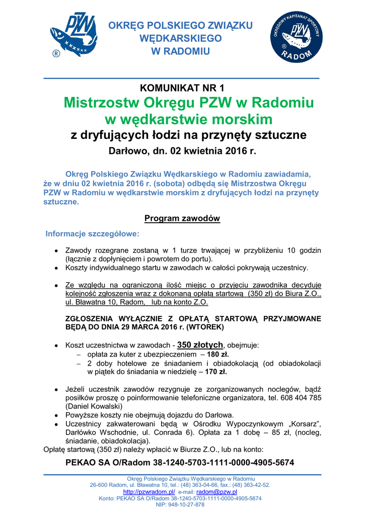 OKRĘG POLSKIEGO ZWIĄZKU WĘDKARSKIEGO W RADOMIU KOMUNIKAT NR 1 Mistrzostw Okręgu PZW w Radomiu w wędkarstwie morskim z dryfujących łodzi na przynęty sztuczne Darłowo, dn. 02 kwietnia 2016 r. Okręg Polskiego Związku Wędkarskiego w Radomiu zawiadamia, że w dniu 02 kwietnia 2016 r. (sobota) odbędą się Mistrzostwa Okręgu PZW w Radomiu w wędkarstwie morskim z dryfujących łodzi na przynęty sztuczne. Program zawodów Informacje szczegółowe: Zawody rozegrane zostaną w 1 turze trwającej w przybliżeniu 10 godzin (łącznie z dopłynięciem i powrotem do portu). Koszty indywidualnego startu w zawodach w całości pokrywają uczestnicy. Ze względu na ograniczoną ilość miejsc o przyjęciu zawodnika decyduje kolejność zgłoszenia wraz z dokonaną opłatą startową (350 zł) do Biura Z.O., ul. Bławatna 10, Radom, lub na konto Z.O. ZGŁOSZENIA WYŁĄCZNIE Z OPŁATĄ STARTOWĄ PRZYJMOWANE BĘDĄ DO DNIA 29 MARCA 2016 r. (WTOREK) Koszt uczestnictwa w zawodach - 350 złotych, obejmuje: opłata za kuter z ubezpieczeniem – 180 zł. 2 doby hotelowe ze śniadaniem i obiadokolacją (od obiadokolacji w piątek do śniadania w niedzielę – 170 zł. Jeżeli uczestnik zawodów rezygnuje ze zorganizowanych noclegów, bądź posiłków proszę o poinformowanie telefoniczne organizatora, tel. 608 404 785 (Daniel Kowalski) Powyższe koszty nie obejmują dojazdu do Darłowa. Uczestnicy zakwaterowani będą w Ośrodku Wypoczynkowym „Korsarz”, Darłówko Wschodnie, ul. Conrada 6). Opłata za 1 dobę – 85 zł, (nocleg, śniadanie, obiadokolacja). Opłatę startową (350 zł) należy wpłacić w Biurze Z.O., lub na konto: PEKAO SA O/Radom 38-1240-5703-1111-0000-4905-5674 Okręg Polskiego Związku Wędkarskiego w Radomiu 26-600 Radom, ul. Bławatna 10, tel.: (48) 363-04-66, fax.: (48) 363-42-52. http://pzwradom.pl/ e-mail: [email protected] Konto: PEKAO SA O/Radom 38-1240-5703-1111-0000-4905-5674 NIP: 948-10-27-878 OKRĘG POLSKIEGO ZWIĄZKU WĘDKARSKIEGO W RADOMIU 1. Organizacja zawodów: 01.04.2016 r. - przyjazd do Darłowa - od godz.2000 - oficjalne otwarcie zawodów, przyjmowanie zgłoszeń, odprawa techniczna, (Ośrodek Wypoczynkowy „Korsarz”, Darłówko Wschodnie, ul. Conrada 6 – Biuro Zawodów). 02.04.2016 r. - godz.0545 - zbiórka zawodników na nabrzeżu portowym przy kutrze, - godz.0600 - wyjście kutrów w morze na łowisko, - ok. godz.0800 - 1400 - zawody wędkarskie, - ok. godz.1400 - 1600 - powrót do portu, mierzenie ryb, - ok. godz. 1800 - ogłoszenie wyników, uroczyste zakończenie zawodów. (Ośrodek Wypoczynkowy „Korsarz” – Biuro Zawodów) UWAGA ! Z powodu niesprzyjających warunków atmosferycznych uniemożliwiających wypłynięcie jednostek z portu, organizator zastrzega sobie prawo odwołania zawodów, bądź przełożenia ich na inny termin. W przypadku zaistnienia powyższej sytuacji wszystkim uczestnikom zostanie zwrócone wpłacone wadium. 2. Regulamin zawodów. Zwycięzca zawodów otrzymuje prawo startu w Morskich Mistrzostwach Polski, Darłowo 2016 za pełną odpłatnością Okręgu PZW w Radomiu. Zawodnicy którzy zajęli miejsca 2 i 3 otrzymują prawo startu Morskich Mistrzostwach Polski, Darłowo 2016 z opłatą startową pokrytą przez Okręg PZW w Radomiu. Zwycięzcy uhonorowani zostaną medalami, pucharami, dyplomami za miejsca 1 – 3, pucharami i dyplomami za miejsca 4 – 6 oraz nagrodą niespodzianką za najdłuższą rybę zawodów. Zawody zostaną rozegrane zgodnie z Zasadami Organizacji Sportu Wędkarskiego obowiązującymi od 29.01.2016 r. W zawodach prowadzona będzie wyłącznie klasyfikacja indywidualna. W zawodach uczestniczyć mogą wyłącznie członkowie Polskiego Związku Wędkarskiego Okręgu Radomskiego. Każdy zawodnik musi posiadać legitymację członkowską z opłaconą składką na 2016 r., kartę wędkarską oraz dowód osobisty lub paszport, jest to warunek niezbędny do dopuszczenia zawodnika do startu w Mistrzostwach Okręgu. 3. Skład Głównej Komisji Sędziowskiej : Sędzia Główny Kol. Andrzej Lipiński, Sędzia Sekretarz Kol. Daniel Kowalski. Okręg Polskiego Związku Wędkarskiego w Radomiu 26-600 Radom, ul. Bławatna 10, tel.: (48) 363-04-66, fax.: (48) 363-42-52. http://pzwradom.pl/ e-mail: [email protected] Konto: PEKAO SA O/Radom 38-1240-5703-1111-0000-4905-5674 NIP: 948-10-27-878 OKRĘG POLSKIEGO ZWIĄZKU WĘDKARSKIEGO W RADOMIU 4. Biuro zawodów. Ośrodek Wypoczynkowy „Korsarz”, Darłówko Wschodnie, ul. Conrada 6 Ośrodek jest ogrodzony, istnieje możliwość wjazdu samochodu na terenie ośrodka. tel. 94 314 26 67, tel. kom. 500 308 636, 513 087 668 i zaparkowania Uwaga !!! Organizator nie zapewnia: - transportu z Radomia do Darłowa, - zorganizowanych treningów. 5. Przepisy szczegółowe zamieszczone są w „Zasadach organizacji sportu wędkarskiego - Regulamin zawodów w wędkarstwie morskim”, dostępne na stronie internetowej: http://www.pzw.org.pl/gks/wiadomosci/29812/67/zasady_organizacji_ wedkarskiego_sportu_kwalifikowanego_pzw 6. Informacje końcowe. - Mierzenie ryb odbywa się w czasie powrotu kutrów do portu. - Protesty związane z połowami w turze składa się Sędziemu Głównemu poprzez sędziego sektorowego, w czasie 15 min. po zakończeniu mierzenia ryb. - Odwołania od decyzji Sędziego Głównego składa się po wpłaceniu wadium w wysokości 200 zł., nie później jednak niż pół godziny po powrocie kutra z morza. - Komisja Odwoławcza wszelkie powstałe protesty rozpatrywać będzie w Biurze Zarządu Okręgu PZW w Radomiu. 7. Ryby łowione w zawodach i wymiary ochronne: - Łosoś 61 cm, limit łączny z trocią 2 szt. - Troć 51 cm, limit łączny z łososiem 2 szt. - Pstrąg tęczowy 40 cm, - Dorsz 38 cm, - Skarp (Turbot) 31 cm, - Gładzica, Stornia, Zimnica - 26 cm, - Belona 40 cm, limit 10 szt. - Makrela - 31 cm, - Czarniak - 38 cm, - Witlinek - 24 cm. 8. Wypływamy na kutrze m/y North Star Okręg Polskiego Związku Wędkarskiego w Radomiu 26-600 Radom, ul. Bław
