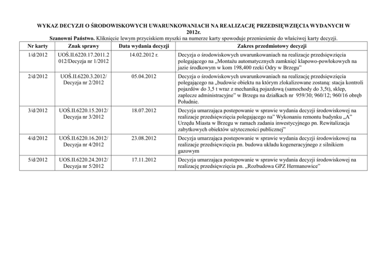 Wykaz decyzji o środowiskowych uwarunkowaniach