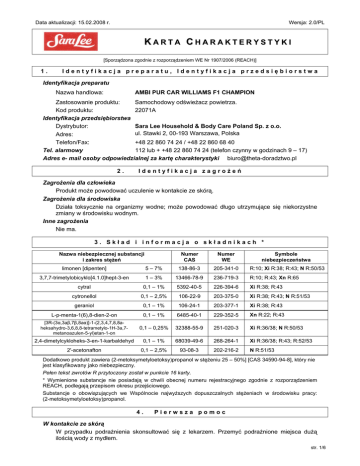 Data aktualizacji: 15.02.2008 r. Wersja: 2.0/PL KARTA CHARAKTERYSTYKI [Sporządzona zgodnie z rozporządzeniem WE Nr 1907/2006 (REACH)] 1. Identyfikacja preparatu, Identyfikacja przedsiębiorstwa Identyfikacja preparatu Nazwa handlowa: AMBI PUR CAR WILLIAMS F1 CHAMPION Zastosowanie produktu: Samochodowy odświeżacz powietrza. Kod produktu: 22071A Identyfikacja przedsiębiorstwa Dystrybutor: Sara Lee Household & Body Care Poland Sp. z o.o. ul. Stawki 2, 00-193 Warszawa, Polska Adres: Telefon/Fax: +48 22 860 74 24 / +48 22 860 68 40 Tel. alarmowy 112 lub + +48 22 860 74 24 (telefon czynny w godzinach 9 – 17) Adres e- mail osoby odpowiedzialnej za kartę charakterystyki [email protected] 2. Identyfikacja zagrożeń Zagrożenia dla człowieka Produkt może powodować uczulenie w kontakcie ze skórą. Zagrożenia dla środowiska Działa toksycznie na organizmy wodne; może powodować długo utrzymujące się niekorzystne zmiany w środowisku wodnym. Inne zagrożenia Nie ma. 3. Skład i informacja o składnikach * Nazwa niebezpiecznej substancji i zakres stężeń Numer CAS Numer WE Symbole niebezpieczeństwa limonen [dipenten] 5 – 7% 138-86-3 205-341-0 R:10; Xi R:38; R:43; N R:50/53 3,7,7-trimetylobicyklo[4.1.0]hept-3-en 1 – 3% 13466-78-9 236-719-3 R:10; R:43; Xn R:65 cytral 0,1 – 1% 5392-40-5 226-394-6 Xi R:38; R:43 cytronellol 0,1 – 2,5% 106-22-9 203-375-0 Xi R:38; R:43; N R:51/53 geraniol 0,1 – 1% 106-24-1 203-377-1 Xi R:38; R:43 L-p-menta-1(6),8-dien-2-on 0,1 – 1% 6485-40-1 229-352-5 Xn R:22; R:43 [3R-(3α,3aβ,7β,8aα)]-1-(2,3,4,7,8,8aheksahydro-3,6,8,8-tetrametylo-1H-3a,7metanoazulen-5-yl)etan-1-on 0,1 – 0,25% 32388-55-9 251-020-3 Xi R:36/38; N R:50/53 2,4-dimetylcykloheks-3-en-1-karbaldehyd 0,1 – 1% 68039-49-6 268-264-1 Xi R:36/38; R:43; R:52/53 2'-acetonafton 0,1 – 2,5% 93-08-3 202-216-2 N R:51/53 Dodatkowo produkt zawiera (2-metoksymetyloetoksy)propanol w stężeniu 25 – 50%] [CAS 34590-94-8], który nie jest klasyfikowany jako niebezpieczny. Pełen tekst zwrotów R przytoczony został w punkcie 16 karty. * Wymienione substancje nie posiadają w chwili obecnej numeru rejestracyjnego zgodnie z rozporządzeniem REACH, podlegają przepisom okresu przejściowego. Substancje o obowiązujących we Wspólnocie najwyższych dopuszczalnych stężeniach w środowisku pracy: (2-metoksymetyloetoksy)propanol. 4. Pierwsza pomoc W kontakcie ze skórą W przypadku podrażnienia skonsultować się z lekarzem. Przemyć podrażnione miejsca dużą ilością wody z mydłem. str. 1/6 K Nazwa handlowa: Dystrybutor: Adres: ARTA C HARAKTERYSTYKI AMBI PUR CAR WILLIAMS F1 CHAMPION Sara Lee Household & Body Care Poland Sp. z o.o. ul. Stawki 2, 00-193 Warszawa, Polska Telefon/Fax: Wersja: 2.0/PL Data aktualizacji: 15.02.2008. +48 22 860 74 24 / +48 22 860 68 40 W kontakcie z oczami Przemywać wodą przez przynajmniej 15 minut. Zdjąć szkła kontaktowe. Chronić niepodrażnione oko. Skonsultować się z lekarzem w przypadku jakichkolwiek dalszych dolegliwości. W przypadku spożycia Nie wywoływać wymiotów! W przypadku narażenia podać poszkodowanemu wodę do picia. Skontaktować się z lekarzem; pokazać opakowanie lub etykietę. Po narażeniu drogą oddechową Nie dotyczy w przypadku prawidłowego stosowania. W przypadkach wątpliwych wynieść poszkodowanego na świeże powietrze. 5. Postępowanie w przypadku pożaru Odpowiednie środki gaśnicze Piana gaśnicza odporna na działanie alkoholu, rozpylony strumień wody, suche środki gaśnicze. Nieodpowiednie środki gaśnicze Zwarty strumień wody – ryzyko rozprzestrzenienia pożaru. Szczególne wyposażenie podczas walki z ogniem Środki ochrony ogólnej typowe w przypadku pożaru. Nie należy przebywać w zagrożonej ogniem strefie bez odpowiedniego ubrania odpornego na chemikalia i aparatu do oddychania z niezależnym obiegiem powietrza. Niebezpieczne produkty rozkładu W przypadku całkowitego spalania nie ma szkodliwych produktów rozkładu. Uwagi dodatkowe Zagrożone ogniem pojemniki polewać z bezpiecznej odległości rozpylonym strumieniem wody. Nie dopuścić do przedostania się wody gaśniczej do wód powierzchniowych lub gruntowych. 6. P o stę pow a n ie w prz yp a d ku n iez a m ierz on eg o uw oln i en i a do ś ro dow iska Indywidualne środki ostrożności Istnieje niebezpieczeństwo poślizgnięcia się. Rozlany produkt należy natychmiast zetrzeć. Założyć buty z antypoślizgowymi podeszwami. Unikać kontaktu ze skórą i oczami. Patrz także pkt 8 Karty. Niezbędne środki w zakresie ochrony środowiska Nie należy dopuścić do przedostania się produktu do wód gruntowych, zbiorników i cieków wodnych ani do kanalizacji. Metody oczyszczania/wchłaniania Zebrać materiałami pochłaniającymi ciecze (np. piasek, ziemia, kwaśne substancje wiążące, uniwersalne substancje wiążące, krzemionka, trociny, itp.). Pozostałość zmyć dużą ilością wody. Utylizować zgodnie z obowiązującymi przepisami. 7. Postępowanie z preparatem i jego magazynowanie Postępowanie z preparatem Postępować zgodnie z zasadami bezpieczeństwa i higieny. Unikać kontaktu ze skórą i oczami. W przypadku kontaktu z oczami natychmiast przemyć dużą ilością wody. Magazynowanie Przechowywać tylko w suchych i dobrze wentylowanych pomieszczeniach. Trzymać z dala od żywności, napojów oraz pasz dla zwierząt. Specyficzne zastosowania Samochodowy odświeżacz powietrza. str. 2/6 K Nazwa handlowa: Dystrybutor: Adres: 8. ARTA C HARAKTERYSTYKI AMBI PUR CAR WILLIAMS F1 CHAMPION Sara Lee Household & Body Care Poland Sp. z o.o. ul. Stawki 2, 00-193 Warszawa, Polska Telefon/Fax: Wersja: 2.0/PL Data aktualizacji: 15.02.2008. +48 22 860 74 24 / +48 22 860 68 40 Kontrola narażania i środki ochrony indywidualnej Wartości graniczne narażania NDS Specyfikacja (2-metoksymetyloetoksy)propanol 240 mg/m NDSCh 3 NDSP 3 480 mg/m ⎯ TWA DSB 3 300 mg/m /8h ⎯ Kontrola narażenia w miejscu pracy Przestrzegać ogólnych zasad bezpiecze