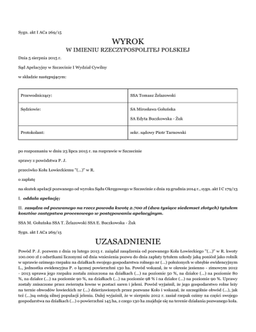 Sygn. akt I ACa 269/15 WYROK W IMIENIU RZECZYPOSPOLITEJ POLSKIEJ Dnia 5 sierpnia 2015 r. Sąd Apelacyjny w Szczecinie I Wydział Cywilny w składzie następującym: Przewodniczący: SSA Tomasz Żelazowski Sędziowie: SA Mirosława Gołuńska SA Edyta Buczkowska - Żuk Protokolant: sekr. sądowy Piotr Tarnowski po rozpoznaniu w dniu 23 lipca 2015 r. na rozprawie w Szczecinie sprawy z powództwa P. J. przeciwko Kołu Łowieckiemu "(...)" w R. o zapłatę na skutek apelacji pozwanego od wyroku Sądu Okręgowego w Szczecinie z dnia 19 grudnia 2014 r., sygn. akt I C 179/13 I. oddala apelację; II. zasądza od pozwanego na rzecz powoda kwotę 2.700 zł (dwa tysiące siedemset złotych) tytułem kosztów zastępstwa procesowego w postępowaniu apelacyjnym. SSA M. Gołuńska SSA T. Żelazowski SSA E. Buczkowska - Żuk Sygn. akt I ACa 269/15 UZASADNIENIE Powód P. J. pozwem z dnia 19 lutego 2013 r. zażądał zasądzenia od pozwanego Koła Łowieckiego "(...)" w R. kwoty 100.000 zł z odsetkami liczonymi od dnia wniesienia pozwu do dnia zapłaty tytułem szkody jaką poniósł jako rolnik w uprawie ozimego rzepaku na działkach swojego gospodarstwa rolnego nr (...) położonych w obrębie ewidencyjnym L., jednostka ewidencyjna P. o łącznej powierzchni 130 ha. Powód wskazał, że w okresie jesienno - zimowym 2012 - 2013 uprawa jego rzepaku została zniszczona na działkach (...) na poziomie 50 %, na działce (...) na poziomie 80 %, na działce (...) na poziomie 90 %, na działkach (...) na poziomie 98 % i na działce (...) na poziomie 90 %. Uprawy zostały zniszczone przez zwierzęta łowne w postaci saren i jeleni. Powód wyjaśnił, że jego gospodarstwo rolne leży na ternie obwodów łowieckich nr (...) dzierżawionych przez pozwane Koło i wskazał, że szczególnie obwód (...), jak też (...)są ostoją silnej populacji jelenia. Dalej wyjaśnił, że w sierpniu 2012 r. zasiał rzepak ozimy na części swojego gospodarstwa na działkach (...) o powierzchni 145 ha, z czego 130 ha znajduje się na terenie działania pozwanego koła. Założeniem było uzyskanie plonu rzepaku 5 ton z 1 ha, z uwagi a to że powód jest wyróżniającym się na tym terenie rolnikiem stosującym wszelkie nowoczesne metody agrotechniczne, zaś jego gospodarstwo rolne jest utrzymywane w wysokiej kulturze agrotechnicznej. Dalej zostało podkreślone, że powód zawarł z M. P. (1) umowę zakupu, w której zobowiązał się dostarczyć 500 ton rzepaku ze zbioru 2013 r. po cenie 1950 zł za tonę. W odpowiedzi na pozew z dnia 12 marca 2013 r. (k. 74 - 76) pozwane Koło Łowieckie "(...)" w R. wniosło o oddalenie powództwa w całości i zasądzenie od powoda na jego rzecz kosztów procesu. Pozwany roszczenie uznał za niezasadne, z tego powodu, że procedura szacowania szkód łowieckich i wypłaty odszkodowań jest ściśle określona przepisami ustawy z dnia 13 października 1995 r. Prawo łowieckie oraz rozporządzenia Ministra Środowiska z dnia 8 marca 2010 r. w sprawie sposobu postępowania przy szacowaniu szkód oraz wypłat odszkodowań za szkody w uprawach i płodach rolnych i że ta procedura nie została dochowana. Dalej zostało wskazane, że w dniu 14 lutego 2013 r. doszło do spotkania, w trakcie którego sporządzono protokół, w którym wskazano że nastąpi w dalszej kolejności etap w postaci szacowania wstępnego. Dlatego w ocenie strony pozwanej, brak jest logicznego i merytorycznego uzasadnienia dla złożonego przez powoda pozwu. Jednocześnie pozwany podkreślił, że skoro zbiór plonu planowany jest na koniec lipca, początek sierpnia 2013 r., to również dopiero wówczas możliwe będzie ustalenie wysokości szkody. W piśmie z dnia 26 kwietnia 2013 r. k. 105 - 108 powód zmienił powództwo w te sposób, że w miejsce kwoty 100.000 zł żądanej tytułem części odszkodowania, wniósł o zasądzenie kwoty 317.000 zł wraz z ustawowymi odsetkami od dnia wniesienia pozwu do dnia zapłaty. Odnosząc się do stanowiska strony pozwanej powód wskazał, że pozwane Koło nie podjęło żądnych działań w celu ochrony upraw powoda również przed dalszą degradacją. Pozwane Koło Łowieckie "(...)" w R. ustosunkowując się do rozszerzonego żądania, podtrzymał żądanie oddalenia powództwa jako przedwczesnego i obciążenie powoda kosztów postępowania. W wyroku z dnia 19 grudnia 2014 r. Sąd Okręgowy w Szczecinie zasądził od pozwanego na rzecz powoda kwotę 161.211 zł wraz z ustawowymi odsetkami od dnia 12 października 2013 r., oddalił powództwo w pozostałym zakresie, zasądził od pozwanego na rzecz powoda kwotę 2597 zł tytułem kosztów procesu, nakazał ściągnąć z zasądzonego na rzecz powoda roszczenia na rzecz Skarbu Państwa - Sądu Okręgowego w Szczecinie kwotę 1298,85 zł tytułem kosztów sądowych, pobrał od pozwanego na rzecz Skarbu Państwa - Sądu Okręgowego w Szczecinie kwotę 1298,86 zł tytułem kosztów sądowych. Sąd I instancji ustalił, że powód P. J. jest właścicielem gospodarstwa rolnego o obszarze ponad 100 ha położonego w obrębie ewidencyjnym L., jednostka ewidencyjna P., od około 15 lat. Jego gospodarstwo obejmuje m.in. działki nr (...), o łącznym obszarze powyżej 145 ha, z tego 130 ha leży na terenie obwodów łowieckich nr (...), (...) i (...), które są dzierżawione przez Koło Łowieckie "(...)" w R.. Inna część jego gospodarstwa znajduje się w obwodzie Koła Łowieckiego "(...)" w S., który dzierżawi obwód łowiecki nr (...), który położony jest na obszarach gmin R. i P.. Działka (...) ma powierzchnię ponad 47 ha i w przeważającej mierze występuje na niej ziemia o klasie bonitacyjnej RIVa. Działka (...) ma powierzchnię blisko 23 ha i przeważa w niej gleba o klasie bonitacyjnej RIVa i częściowo RIIIb. Te dwie działki znajdują się najbliżej zabudowań i tworzą pole o powierzchni 69 ha. W przypadku działki (...) o obszarze 22 ha, przeważają grunty RIVb (11 ha), zaś w pozostałym zakresie to gleb