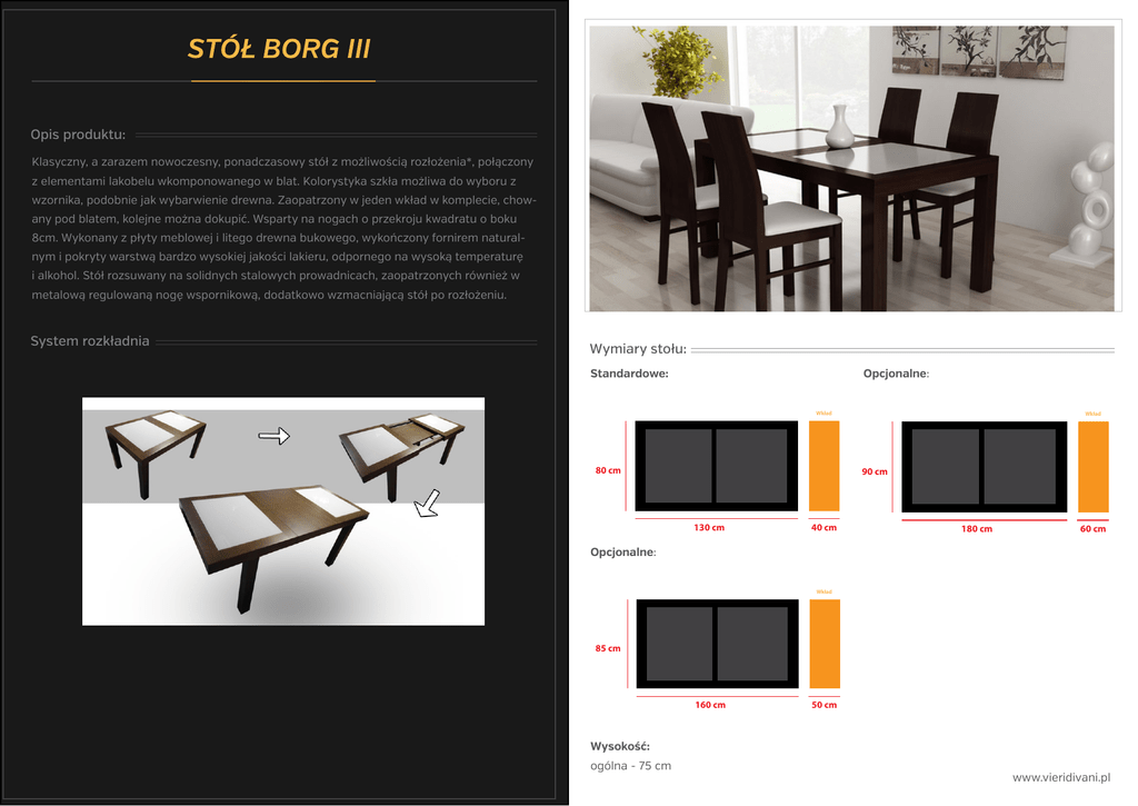 STÓŁ borg iii Opis produktu: Klasyczny, a zarazem nowoczesny, ponadczasowy stół z możliwością rozłożenia*, połączony z elementami lakobelu wkomponowanego w blat. Kolorystyka szkła możliwa do wyboru z wzornika, podobnie jak wybarwienie drewna. Zaopatrzony w jeden wkład w komplecie, chowany pod blatem, kolejne można dokupić. Wsparty na nogach o przekroju kwadratu o boku 8cm. Wykonany z płyty meblowej i litego drewna bukowego, wykończony fornirem naturalnym i pokryty warstwą bardzo wysokiej jakości lakieru, odpornego na wysoką temperaturę i alkohol. Stół rozsuwany na solidnych stalowych prowadnicach, zaopatrzonych również w metalową regulowaną nogę wspornikową, dodatkowo wzmacniającą stół po rozłożeniu. System rozkładnia Wymiary stołu: Standardowe: Opcjonalne: Wkład 80 cm Wkład 90 cm 130 cm 40 cm 180 cm 60 cm Opcjonalne: Wkład 85 cm 160 cm 50 cm Wysokość: ogólna - 75 cm www.vieridivani.pl
