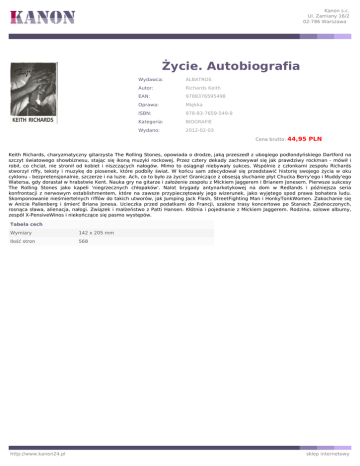 Kanon s.c. Ul. Zamiany 16/2 02-786 Warszawa Życie. Autobiografia Wydawca: ALBATROS Autor: Richards Keith EAN: 9788376595498 Oprawa: Miękka ISBN: 978-83-7659-549-8 Kategoria: BIOGRAFIE Wydano: 2012-02-03 Cena brutto: 44,95 PLN Keith Richards, charyzmatyczny gitarzysta The Rolling Stones, opowiada o drodze, jaką przeszedł z ubogiego podlondyńskiego Dartford na szczyt światowego showbiznesu, stając się ikoną muzyki rockowej. Przez cztery dekady zachowywał się jak prawdziwy rockman - mówił i robił, co chciał, nie stronił od kobiet i niszczących nałogów. Mimo to osiągnął niebywały sukces. Wspólnie z członkami zespołu Richards stworzył riffy, teksty i muzykę do piosenek, które podbiły świat. W końcu sam zdecydował się przedstawić historię swojego życia w oku cyklonu - bezpretensjonalnie, szczerze i na luzie. Ach, co to było za życie! Graniczące z obsesją słuchanie płyt Chucka Berry'ego i Muddy'ego Watersa, gdy dorastał w hrabstwie Kent. Nauka gry na gitarze i założenie zespołu z Mickiem Jaggerem i Brianem Jonesem. Pierwsze sukcesy The Rolling Stones jako kapeli 'niegrzecznych chłopaków'. Nalot brygady antynarkotykowej na dom w Redlands i późniejsza seria konfrontacji z nerwowym establishmentem, które na zawsze przypieczętowały jego wizerunek, jako wyjętego spod prawa bohatera ludu. Skomponowanie nieśmiertelnych riffów do takich utworów, jak Jumping Jack Flash, StreetFighting Man i HonkyTonkWomen. Zakochanie się w Anicie Pallenberg i śmierć Briana Jonesa. Ucieczka przed podatkami do Francji, szalone trasy koncertowe po Stanach Zjednoczonych, rosnąca sława, alienacja, nałogi. Związek i małżeństwo z Patti Hansen. Kłótnia i pojednanie z Mickiem Jaggerem. Rodzina, solowe albumy, zespół X-PensiveWinos i niekończące się pasmo występów. Tabela cech Wymiary 142 x 205 mm Ilość stron 568 http://www.kanon24.pl sklep internetowy