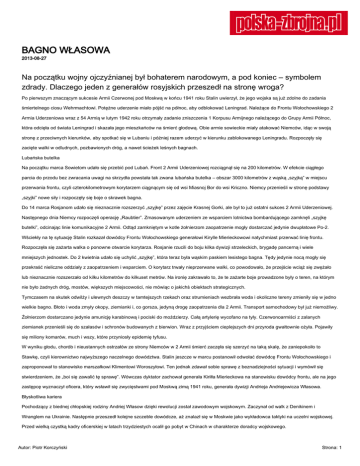 BAGNO WŁASOWA 2013-08-27 Na początku wojny ojczyźnianej był bohaterem narodowym, a pod koniec – symbolem zdrady. Dlaczego jeden z generałów rosyjskich przeszedł na stronę wroga? Po pierwszym znaczącym sukcesie Armii Czerwonej pod Moskwą w końcu 1941 roku Stalin uwierzył, że jego wojska są już zdolne do zadania śmiertelnego ciosu Wehrmachtowi. Potężne uderzenie miało pójść na północ, aby odblokować Leningrad. Należące do Frontu Wołochowskiego 2 Armia Uderzeniowa wraz z 54 Armią w lutym 1942 roku otrzymały zadanie zniszczenia 1 Korpusu Armijnego należącego do Grupy Armii Północ, która odcięła od świata Leningrad i skazała jego mieszkańców na śmierć głodową. Obie armie sowieckie miały atakować Niemców, idąc w swoją stronę z przeciwnych kierunków, aby spotkać się w Lubaniu i później razem uderzyć w kierunku zablokowanego Leningradu. Rozpoczęły się zacięte walki w odludnych, pozbawionych dróg, a nawet ścieżek leśnych bagnach. Lubańska butelka Na początku marca Sowietom udało się przebić pod Lubań. Front 2 Armii Uderzeniowej rozciągnął się na 200 kilometrów. W efekcie ciągłego parcia do przodu bez zwracania uwagi na skrzydła powstała tak zwana lubańska butelka – obszar 3000 kilometrów z wąską „szyjką” w miejscu przerwania frontu, czyli czterokilometrowym korytarzem ciągnącym się od wsi Miasnoj Bor do wsi Kriczno. Niemcy przenieśli w stronę podstawy „szyjki” nowe siły i rozpoczęły się boje o skrawek bagna. Do 14 marca Rosjanom udało się nieznacznie rozszerzyć „szyjkę” przez zajęcie Krasnej Gorki, ale był to już ostatni sukces 2 Armii Uderzeniowej. Następnego dnia Niemcy rozpoczęli operację „Raubtier”. Zmasowanym uderzeniem ze wsparciem lotnictwa bombardującego zamknęli „szyjkę butelki”, odcinając linie komunikacyjne 2 Armii. Odtąd zamkniętym w kotle żołnierzom zaopatrzenie mogły dostarczać jedynie dwupłatowe Po-2. Wściekły na tę sytuację Stalin rozkazał dowódcy Frontu Wołochowskiego generałowi Kirylle Mierieckowowi natychmiast przerwać linię frontu. Rozpoczęła się zażarta walka o ponowne otwarcie korytarza. Rosjanie rzucili do boju kilka dywizji strzeleckich, brygadę pancerną i wiele mniejszych jednostek. Do 2 kwietnia udało się uchylić „szyjkę”, która teraz była wąskim paskiem lesistego bagna. Tędy jedynie nocą mogły się przekraść nieliczne oddziały z zaopatrzeniem i wsparciem. O korytarz trwały nieprzerwane walki, co powodowało, że przejście wciąż się zwężało lub nieznacznie rozszerzało od kilku kilometrów do kilkuset metrów. Na ironię zakrawało to, że te zażarte boje prowadzone były o teren, na którym nie było żadnych dróg, mostów, większych miejscowości, nie mówiąc o jakichś obiektach strategicznych. Tymczasem na skutek odwilży i ulewnych deszczy w tamtejszych rzekach oraz strumieniach wezbrała woda i okoliczne tereny zmieniły się w jedno wielkie bagno. Błoto i woda zmyły okopy, ziemianki i, co gorsza, jedyną drogę zaopatrzenia dla 2 Armii. Transport samochodowy był już niemożliwy. Żołnierzom dostarczano jedynie amunicję karabinową i pociski do moździerzy. Całą artylerię wycofano na tyły. Czerwonoarmiści z zalanych ziemianek przenieśli się do szałasów i schronów budowanych z bierwion. Wraz z przyjściem cieplejszych dni przyroda gwałtownie ożyła. Pojawiły się miliony komarów, much i wszy, które przyniosły epidemię tyfusu. W wyniku głodu, chorób i nieustannych ostrzałów ze strony Niemców w 2 Armii śmierć zaczęła się szerzyć na taką skalę, że zaniepokoiło to Stawkę, czyli kierownictwo najwyższego naczelnego dowództwa. Stalin jeszcze w marcu postanowił odwołać dowódcę Frontu Wołochowskiego i zaproponował to stanowisko marszałkowi Klimentowi Woroszyłowi. Ten jednak zdawał sobie sprawę z beznadziejności sytuacji i wymówił się stwierdzeniem, że „boi się zawalić tę sprawę”. Wówczas dyktator zachował generała Kiriłła Mierieckowa na stanowisku dowódcy frontu, ale na jego zastępcę wyznaczył oficera, który wsławił się zwycięstwami pod Moskwą zimą 1941 roku, generała dywizji Andrieja Andriejewicza Własowa. Błyskotliwa kariera Pochodzący z biednej chłopskiej rodziny Andriej Własow dzięki rewolucji został zawodowym wojskowym. Zaczynał od walk z Denikinem i Wranglem na Ukrainie. Następnie przeszedł kolejne szczeble dowódcze, aż znalazł się w Moskwie jako wykładowca taktyki na uczelni wojskowej. Przed wielką czystką kadry oficerskiej w latach trzydziestych ocalił go pobyt w Chinach w charakterze doradcy wojskowego. Autor: Piotr Korczyński Strona: 1 Talent strategiczny i organizacyjny Własow pierwszy raz w pełni objawił w wojnie z Finami, gdy dowodził 99 Dywizją Strzelecką. Po wybuchu wojny niemiecko-sowieckiej otrzymał dowództwo 37 Armii i stanowisko głównodowodzącego twierdzą Kijów. Z powierzonego rejonu wycofał się jako jeden z ostatnich. W czasie bitwy o Moskwę, 10 listopada 1941 roku, stanął na czele 20 Armii Uderzeniowej. Dzięki dowodzeniu Własowa Armia Czerwona odniosła pierwszy większy sukces w tej wojnie – odbiła Sołniecznogorsk na północny zachód od Moskwy i tym samym odepchnęła Niemców od stolicy imperium. Nowe stanowisko generał objął w drugiej połowie marca 1942 roku i już dwudziestego tego miesiąca Mierieckow wysłał go na inspekcję 2 Armii Uderzeniowej. Jednocześnie dowódca tejże armii, generał Nikołaj Kłykow, zaczął wysyłać do sztabu frontu monity, że jest chory i niezdolny do dalszego dowodzenia. Odwołano go w efekcie ze stanowiska i wysłano samolotem na tyły. Oficerowie wykrwawionej oraz wyniszczonej chorobami i głodem armii zaproponowali, aby ich nowym dowódcą został Własow, na co rada wojenna frontu przystała bez wahania. W ten sposób generał stanął na czele armii, która nie była już zdolna do dalszej walki. Ostat