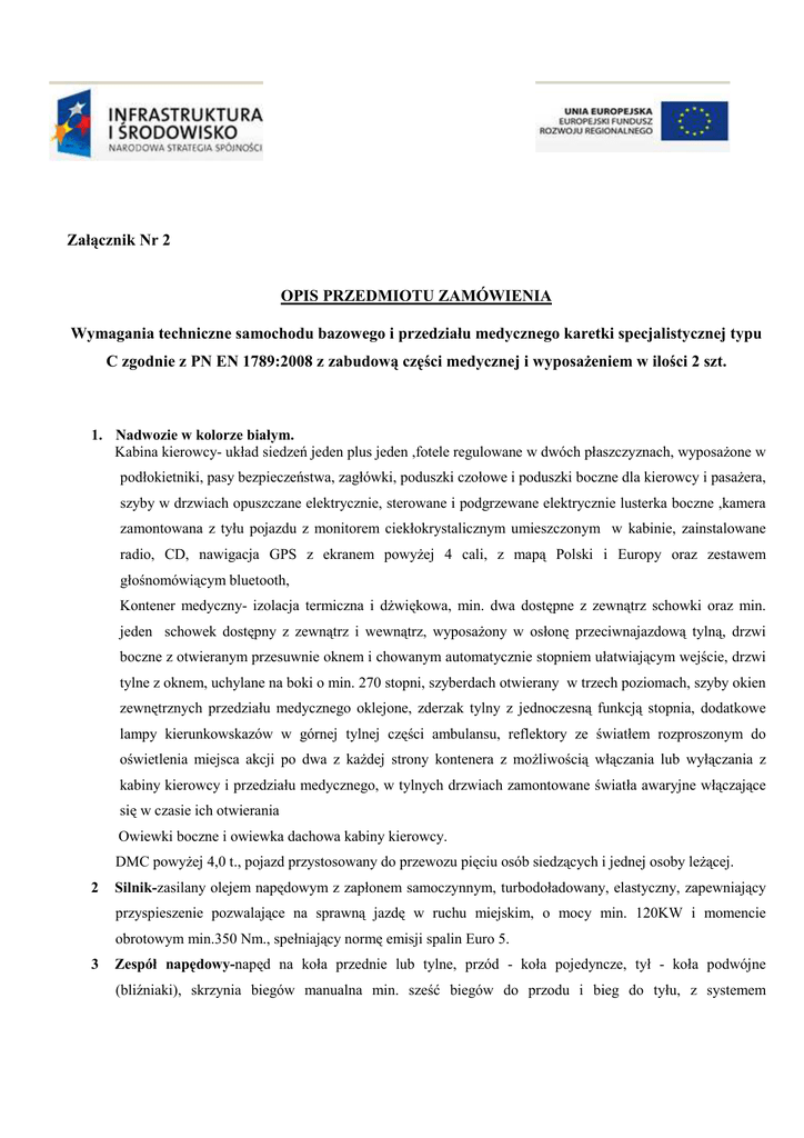 Załącznik Nr 2 OPIS PRZEDMIOTU ZAMÓWIENIA Wymagania techniczne samochodu bazowego i przedziału medycznego karetki specjalistycznej typu C zgodnie z PN EN 1789:2008 z zabudową części medycznej i wyposaŜeniem w ilości 2 szt. 1. Nadwozie w kolorze białym. Kabina kierowcy- układ siedzeń jeden plus jeden ,fotele regulowane w dwóch płaszczyznach, wyposaŜone w podłokietniki, pasy bezpieczeństwa, zagłówki, poduszki czołowe i poduszki boczne dla kierowcy i pasaŜera, szyby w drzwiach opuszczane elektrycznie, sterowane i podgrzewane elektrycznie lusterka boczne ,kamera zamontowana z tyłu pojazdu z monitorem ciekłokrystalicznym umieszczonym w kabinie, zainstalowane radio, CD, nawigacja GPS z ekranem powyŜej 4 cali, z mapą Polski i Europy oraz zestawem głośnomówiącym bluetooth, Kontener medyczny- izolacja termiczna i dŜwiękowa, min. dwa dostępne z zewnątrz schowki oraz min. jeden schowek dostępny z zewnątrz i wewnątrz, wyposaŜony w osłonę przeciwnajazdową tylną, drzwi boczne z otwieranym przesuwnie oknem i chowanym automatycznie stopniem ułatwiającym wejście, drzwi tylne z oknem, uchylane na boki o min. 270 stopni, szyberdach otwierany w trzech poziomach, szyby okien zewnętrznych przedziału medycznego oklejone, zderzak tylny z jednoczesną funkcją stopnia, dodatkowe lampy kierunkowskazów w górnej tylnej części ambulansu, reflektory ze światłem rozproszonym do oświetlenia miejsca akcji po dwa z kaŜdej strony kontenera z moŜliwością włączania lub wyłączania z kabiny kierowcy i przedziału medycznego, w tylnych drzwiach zamontowane światła awaryjne włączające się w czasie ich otwierania Owiewki boczne i owiewka dachowa kabiny kierowcy. DMC powyŜej 4,0 t., pojazd przystosowany do przewozu pięciu osób siedzących i jednej osoby leŜącej. 2 Silnik-zasilany olejem napędowym z zapłonem samoczynnym, turbodoładowany, elastyczny, zapewniający przyspieszenie pozwalające na sprawną jazdę w ruchu miejskim, o mocy min. 120KW i momencie obrotowym min.350 Nm., spełniający normę emisji spalin Euro 5. 3 Zespół napędowy-napęd na koła przednie lub tylne, przód - koła pojedyncze, tył - koła podwójne (bliźniaki), skrzynia biegów manualna min. sześć biegów do przodu i bieg do tyłu, z systemem zapobiegającym poślizgowi kół osi napędzanej przy ruszaniu typu ASR, z systemem stabilizacji toru jazdy typu ESP, z systemem wspomagania ruszania pod górę typu AAS lub hill asystent, lub równowaŜnym. 4 Zawieszenie- przednie i tylne posiadające drąŜki stabilizacyjne obu osi, gwarantujące dobrą przyczepność kół do nawierzchni, stabilność w trudnym terenie oraz odpowiedni komfort transportu chorego lub zawieszenie hydropneumatyczne. 5 WyposaŜenie pojazdu- uniwersalne uchwyty na pudełka rękawiczek min. dwa , kosz na śmieci, gaśnica w przedziale medycznym min.2 kg, urządzenie do wybijania szyb wraz z noŜem do cięcia pasów bezpieczeństwa zamontowane w przedziale medycznym i kabinie kierowcy, dwa komplety opon letnich i komplet opon zimowych, wszystkie na felgach stalowych, lampa typu szperacz z zasilaniem bateryjnym oraz sieciowym 12V zamontowana w kabinie kierowcy. 6 Ogrzewanie i wentylacja-wymiennik ciepła z wentylatorem dwustopniowym; układ wyposaŜony w termostat umoŜliwiający zadanie temperatury w przedziale medycznym i utrzymanie jej na Ŝądanym poziomie, termowentylator dwustopniowy; układ wyposaŜony w termostat umoŜliwiający zadanie temperatury w przedziale medycznym i utrzymanie jej na Ŝądanym poziomie, dodatkowy, niezaleŜny od pracy oraz układu chłodzenia silnika, system dogrzewania przedziału medycznego i przedziału kierowcy, klimatyzacja kabiny kierowcy i przedziału medycznego, wentylator o wydajność min. 310m3 (wywiew)/ 260m3(nawiew) 7 Instalacja elektryczna, łączność radiowa -akumulator dodatkowy słuŜący do zasilania odbiorników zainstalowanych w przedziale medycznym (dwa akumulatory o pojemności łącznej min. 180Ah), alternator zapewniający ładowanie zespołu 2 akumulatorów o prądzie maksymalnym min. 120A , instalacja 230V, min. dwa gniazda poboru prądu w przedziale medycznym zasilane z gniazda umieszczonego na zewnątrz, posiadające zabezpieczenie przed uruchomieniem silnika przy podłączonym zasilaniu i zabezpieczenie róŜnicowo- prądowe przeciwporaŜeniowe, układ prostowniczy automatycznie doładowujący na postoju zespół akumulatorów przy podłączeniu 230V, zapewniający ładowanie i pracę urządzeń zamontowanych w ambulansie, min. cztery gniazda 12V poboru prądu zgodnie z wymaganiami normy PN-EN 1789, radiotelefon przenośny i przewoźny cyfrowy- serii Motorola DM lub równowaŜny, antena dachowa o odpowiednich parametrach pozwalających na prace radiotelefonu bez zakłóceń. 8 Oznakowanie, oświetlenie zewnętrzne, sygnalizacja dźwiękowa - dwie belki, jedna z przodu i druga z tyłu pojazdu, o długości min. 1800 mm, z czternastoma ledami na całej długości belki i z wmontowanymi dwiema lampami roboczymi oświetlającymi miejsce akcji z przodu i z tyłu, w belce tylnej dodatkowo światło czerwone stop, lampy pomarańczowe kierunkowskazów i min. osiem Ŝółtych lamp ledowych typu „fala”, dodatkowo niebieskie lampy błyskowe ledowe w ilości dziesięciu sztuk, zamontowane cztery sztuki na kabinie, dwie na lusterkach i cztery sztuki na kontenerze, z odpowiednim sterownikiem, trzy rodzaje modulacji sygnału, min. dwa głośniki o minimalnej mocy 100W, dodatkowo sygnały pneumatyczne z własnym układem smarującym, przystosowane do pracy ciągłej, oznakowanie graficzne wykonane z folii fluoroscencyjnej zgodnie z wymogami „Prawo o ruchu drogowym” i zaleceniami normy PN-EN 1789:2008 - załącznik A oraz z Ŝyczeniami Zamawiającego. 9 Oświetlenie wewnętrzne przedziału medycznego-silne oświetlenie zgodne z normą PN-EN 1789:2008 ust. 4.5.6 - sześć punktów świetlnych, jarzeniowych, bezcieniowych zamontowanych po obu stronach górnej 